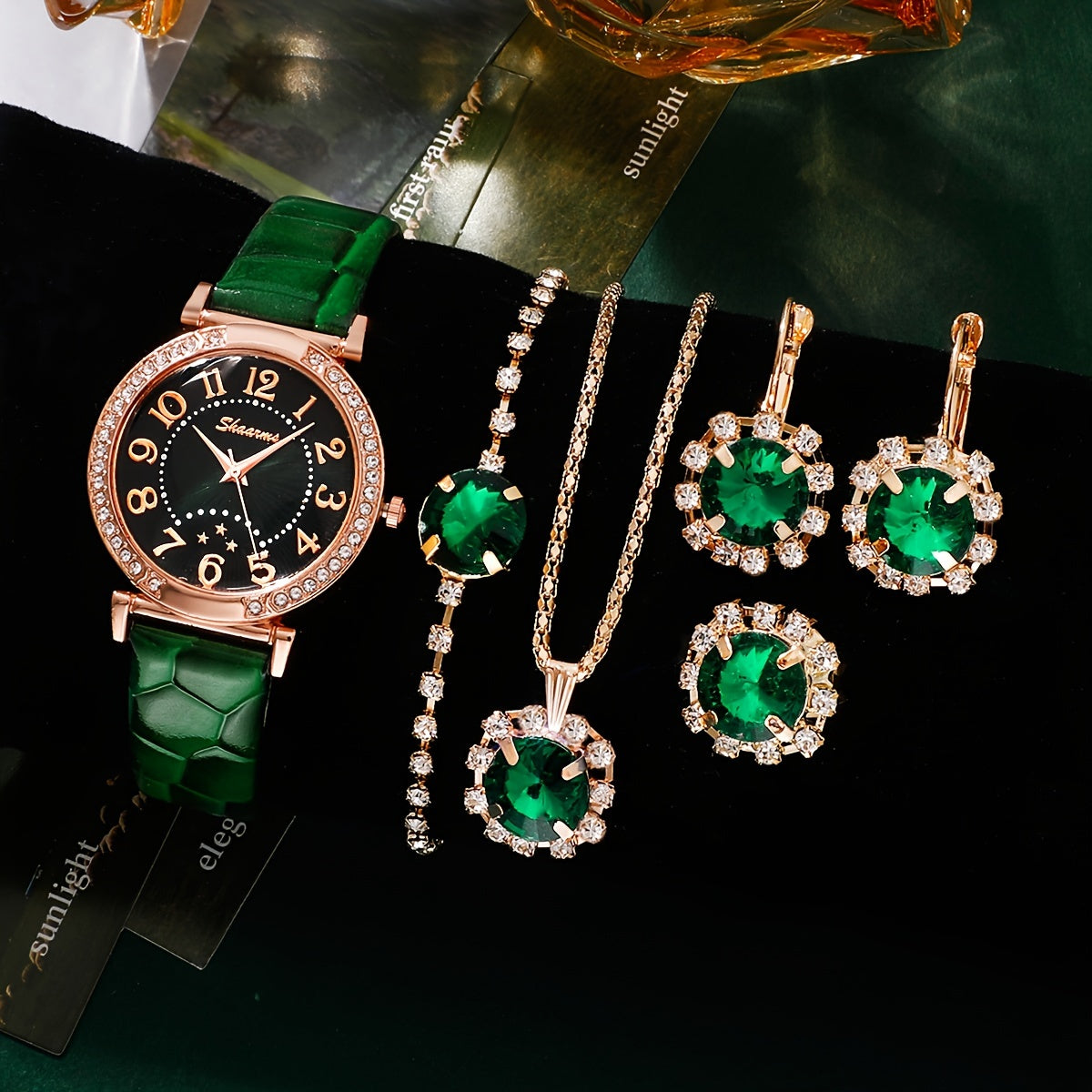 5 ta ayollar modasi soatlari to'plami, sun'iy charm bilan, kristal zargarlik to'plami