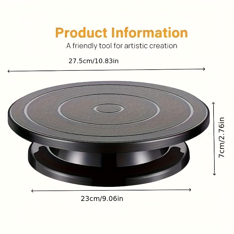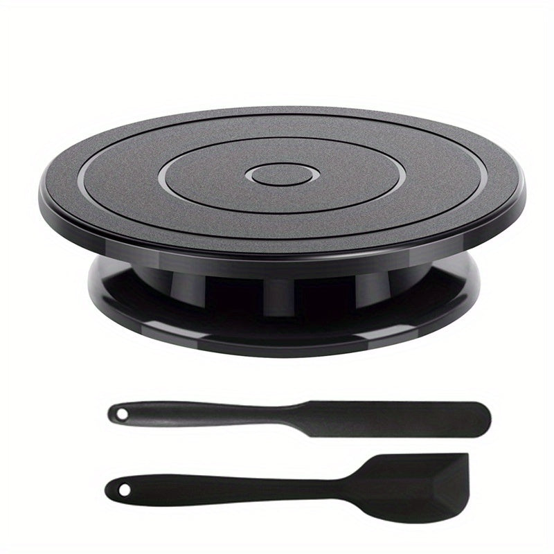 Qora tortni bezash uchun aylantiruvchi stol va kremni olib tashlash uchun scraper va spatula, plastmassadan