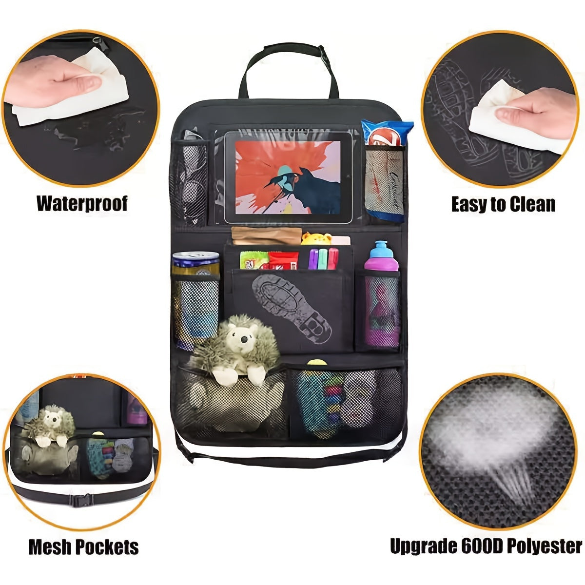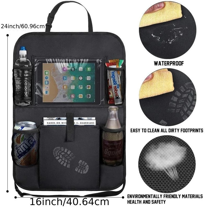 Qora avtomobil o'rindig'i orqa qismi saqlash sumkasi va planshet tutqich bilan bolalar sayohat tashkilotchisi