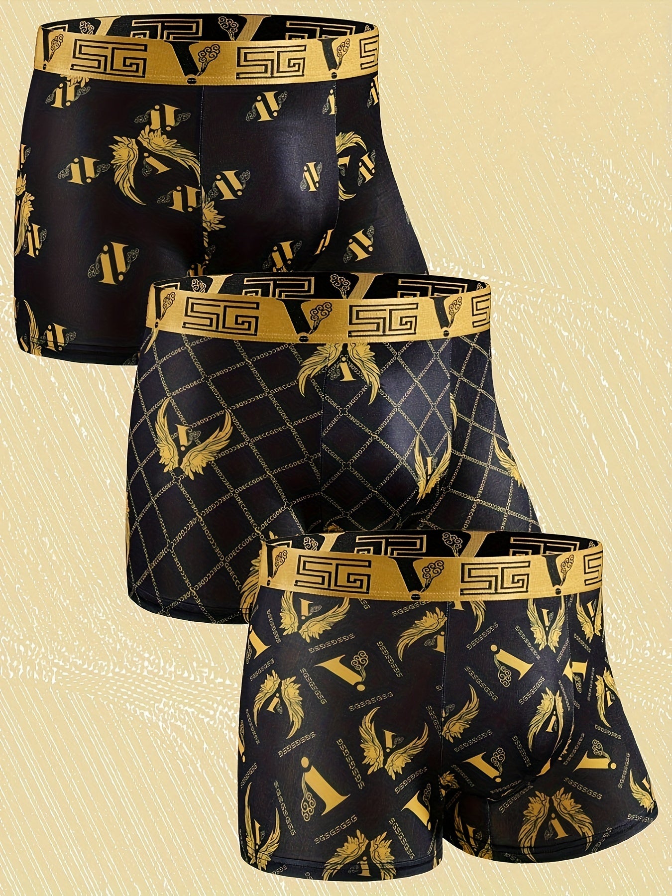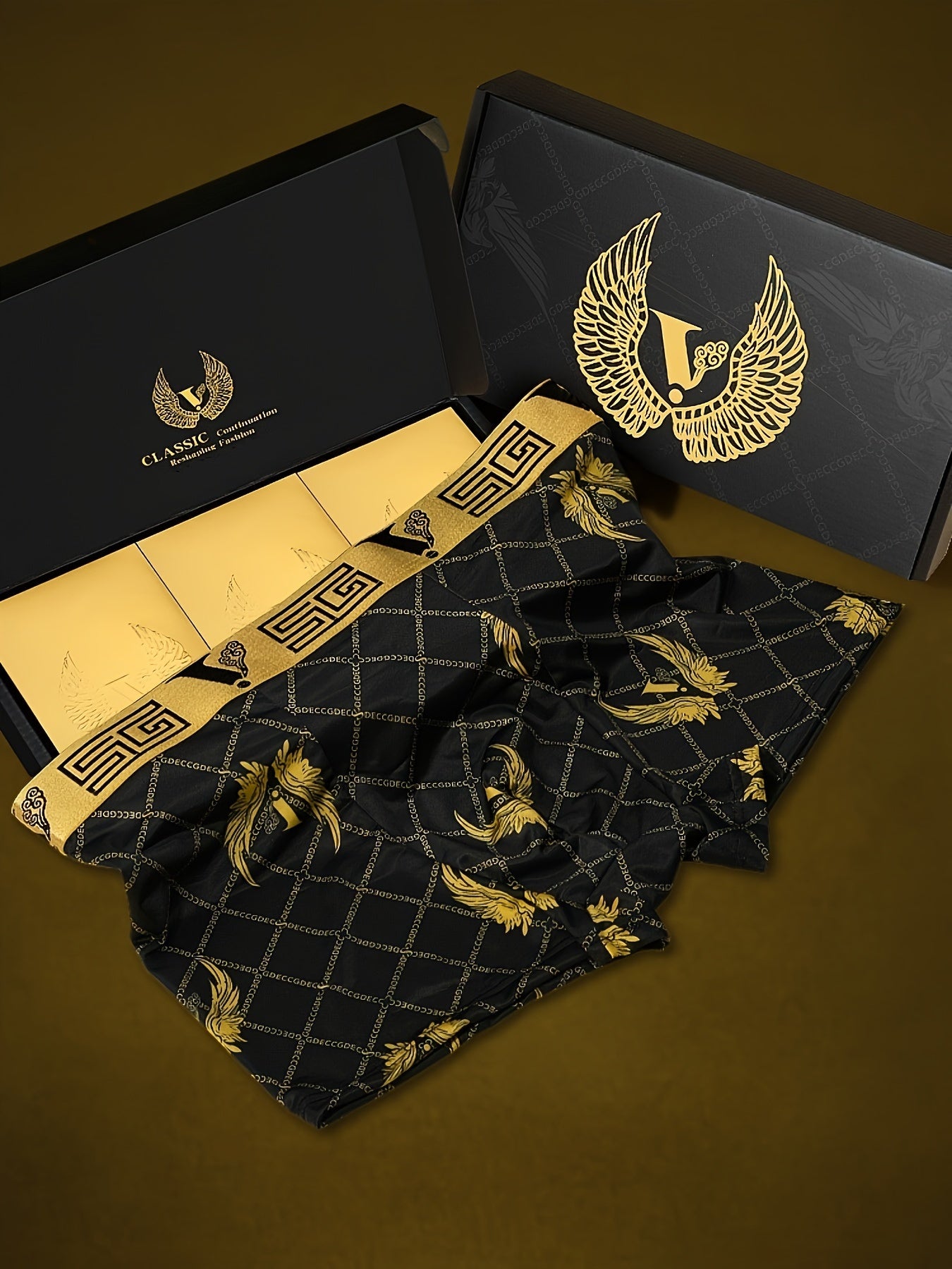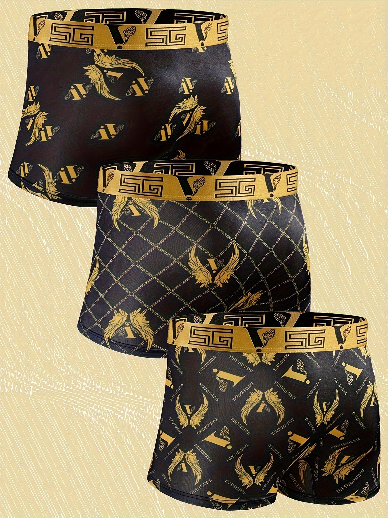 Qora Oltin Sovg'a Qutisi - 3-dona Erkaklar Oltin Qanot va Zanjir Printli Bokser Shortlar To'plami, Qulay va Hashamatli Ichki Kiym, Sovg'a sifatida mukammal