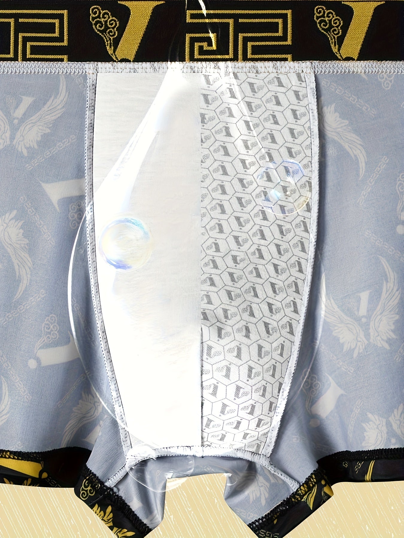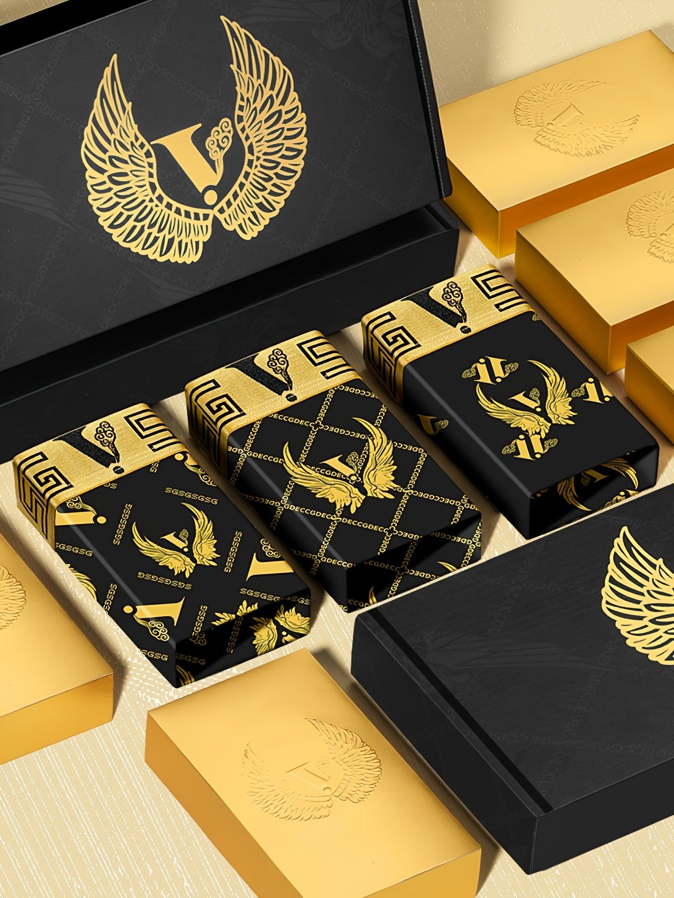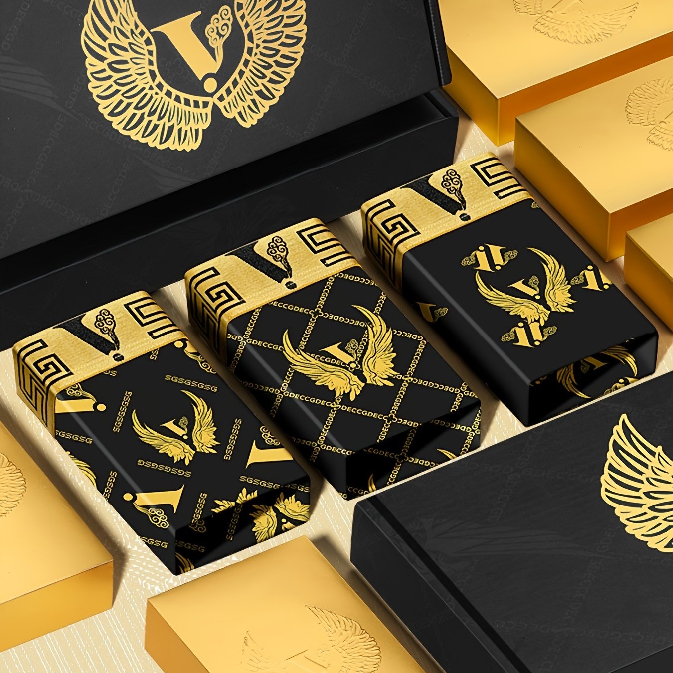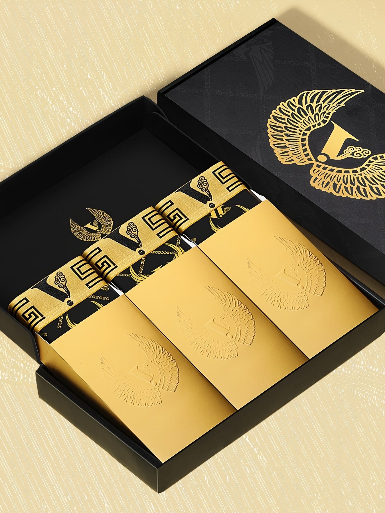 Qora Oltin Sovg'a Qutisi - 3-dona Erkaklar Oltin Qanot va Zanjir Printli Bokser Shortlar To'plami, Qulay va Hashamatli Ichki Kiym, Sovg'a sifatida mukammal