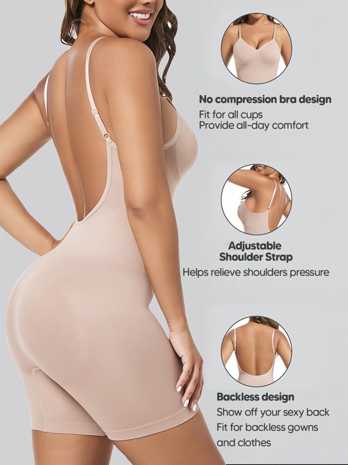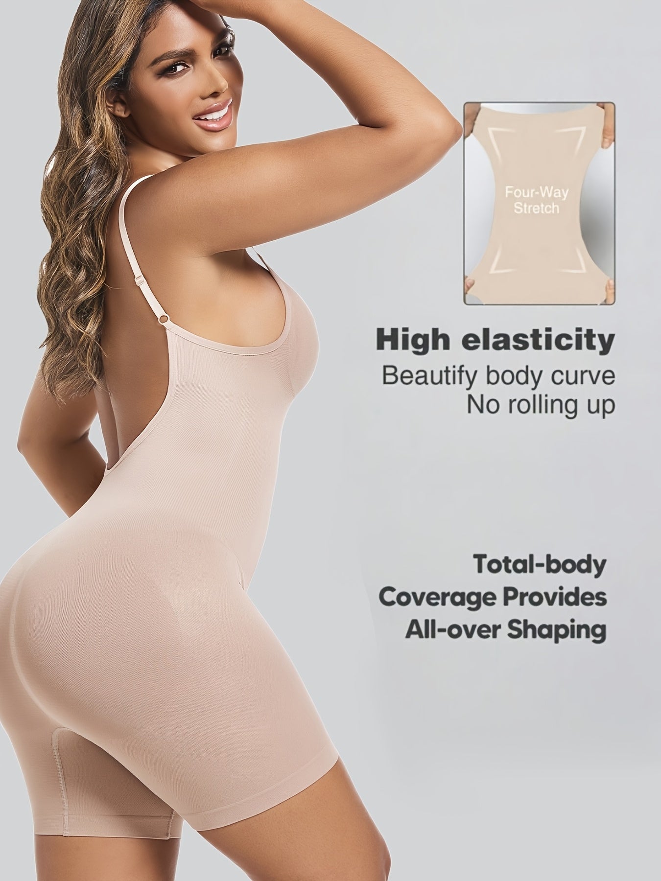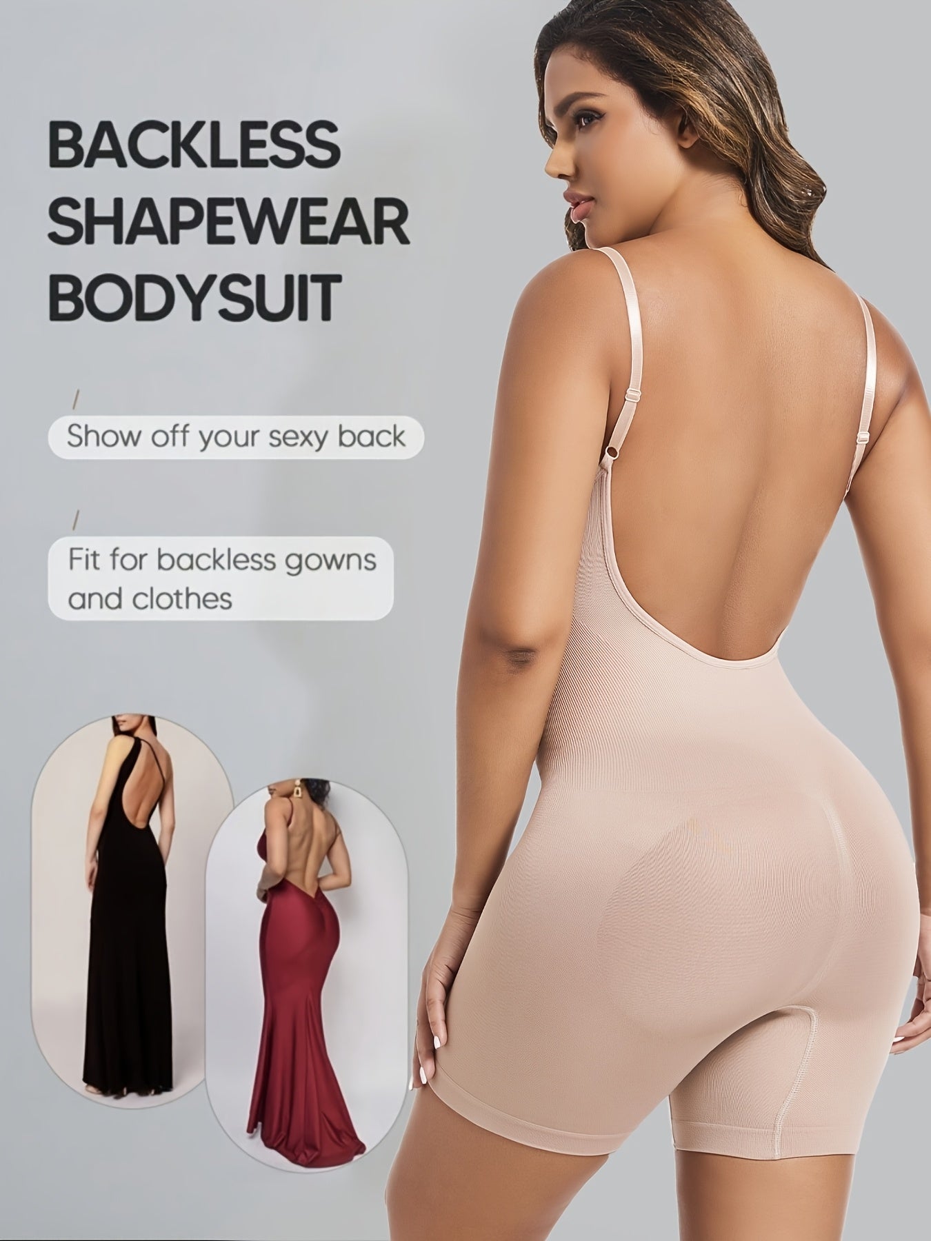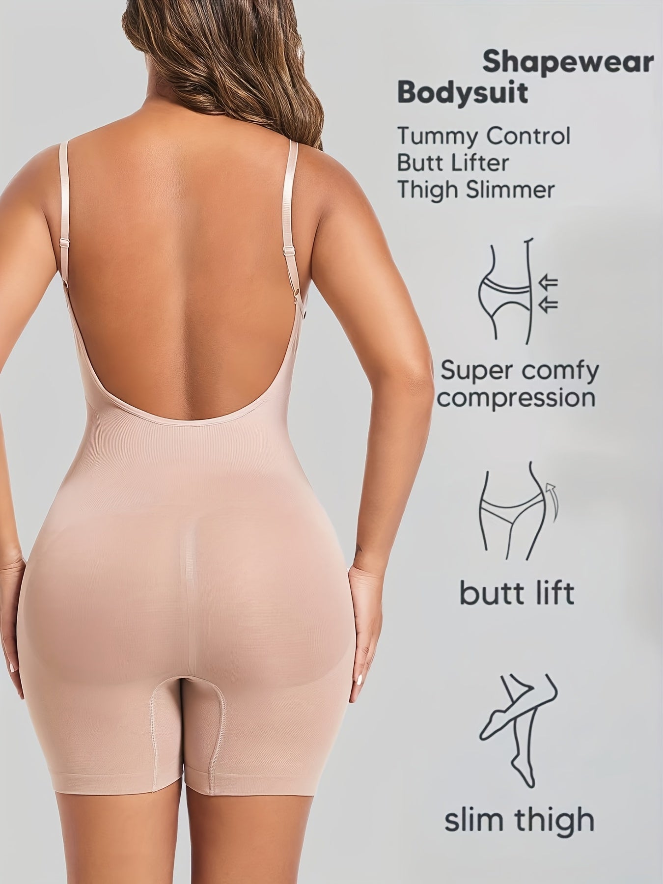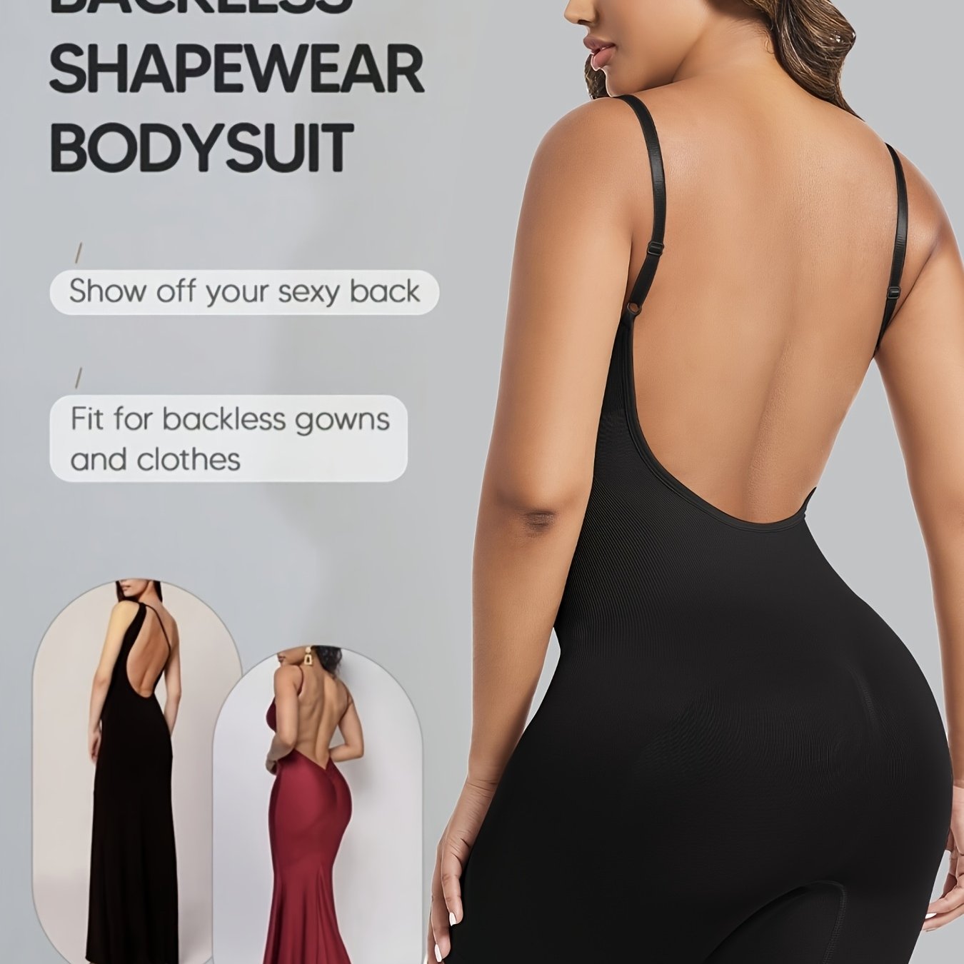 Ayollar uchun qora shovqinsiz qorin nazorati bodysuiti, tizzalarni ko'taruvchi va orqa qismi ochiq dizayni bilan