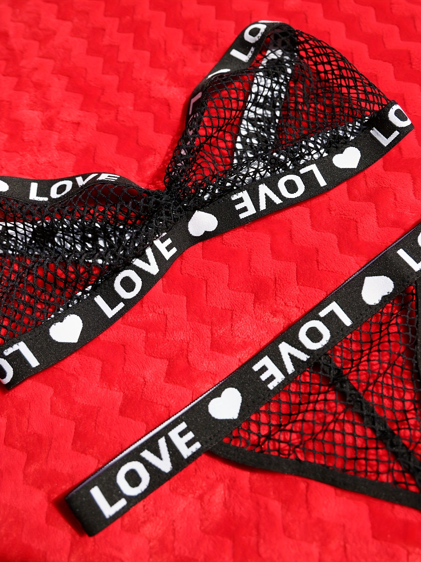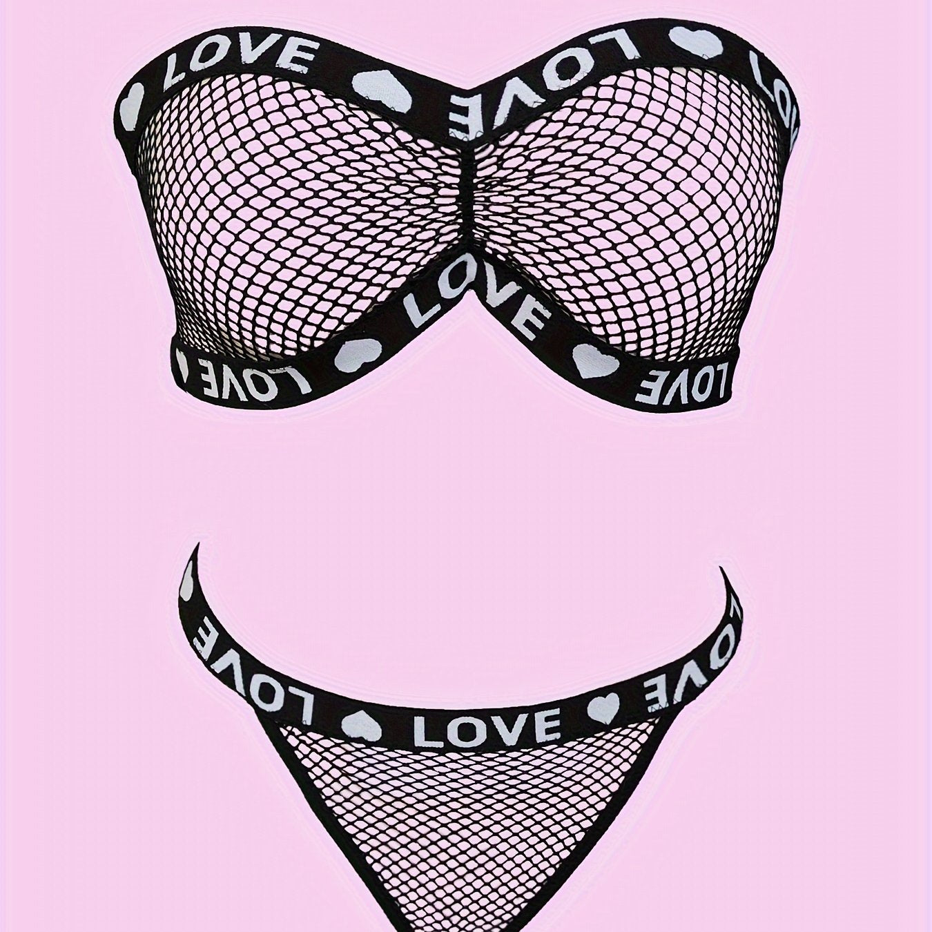 Yozuv detali bilan jasur va nafis tarmoq ichki kiyim to'plami, bandeau brassiyer va thongni o'z ichiga oladi. Elastan/polister aralashmasidan tayyorlangan, qo'l bilan yuvish mumkin.