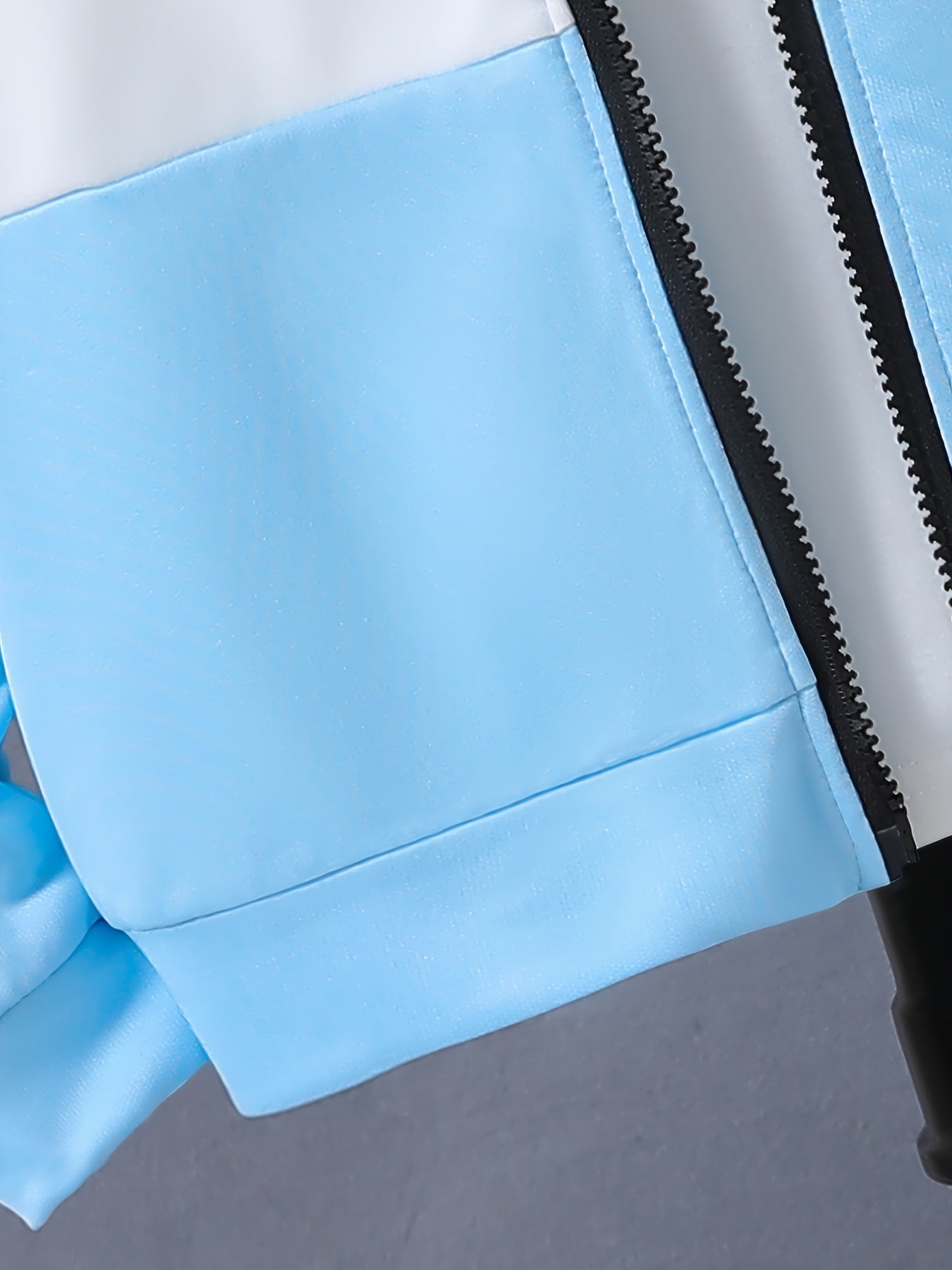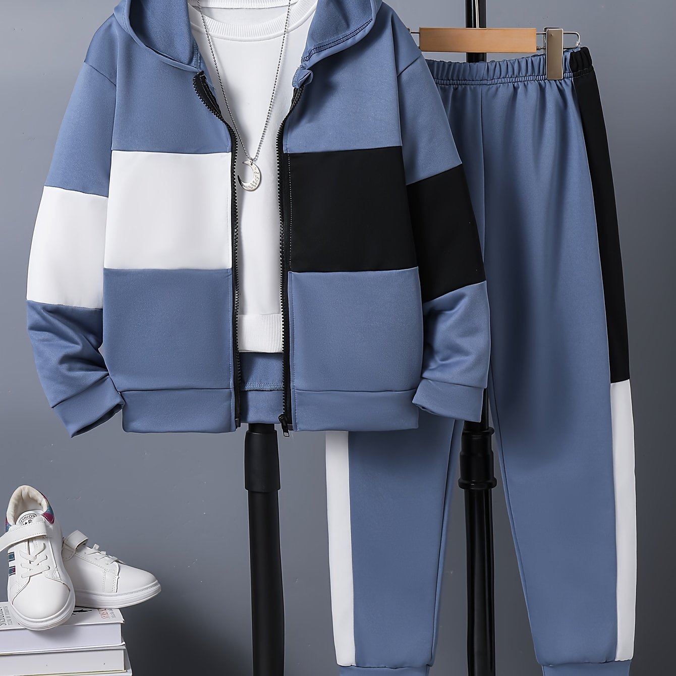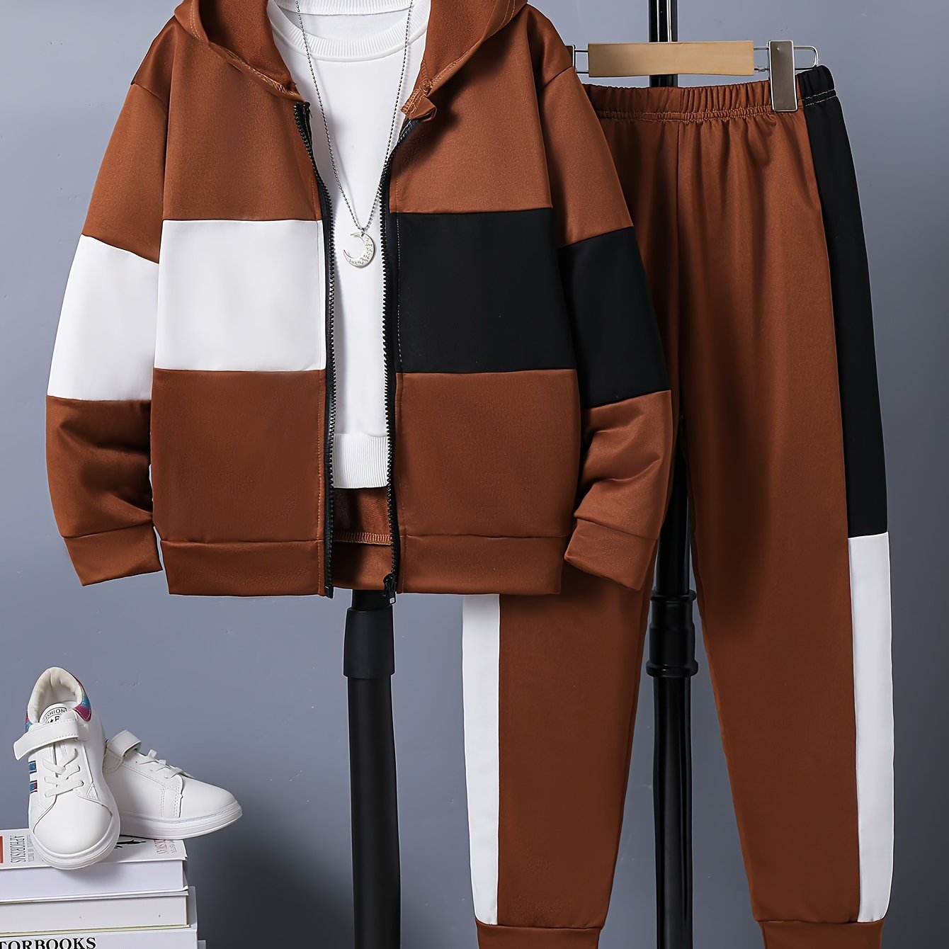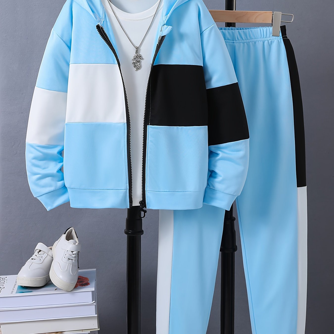 O'g'il bolalar uchun 2-qismli rangli blokli kapüşonli kiyim to'plami, fermuarlı kapüşon, uzun yengli pullover va shimlar to'plami, kundalik yoki ochiq havoda kiyish uchun mukammal.