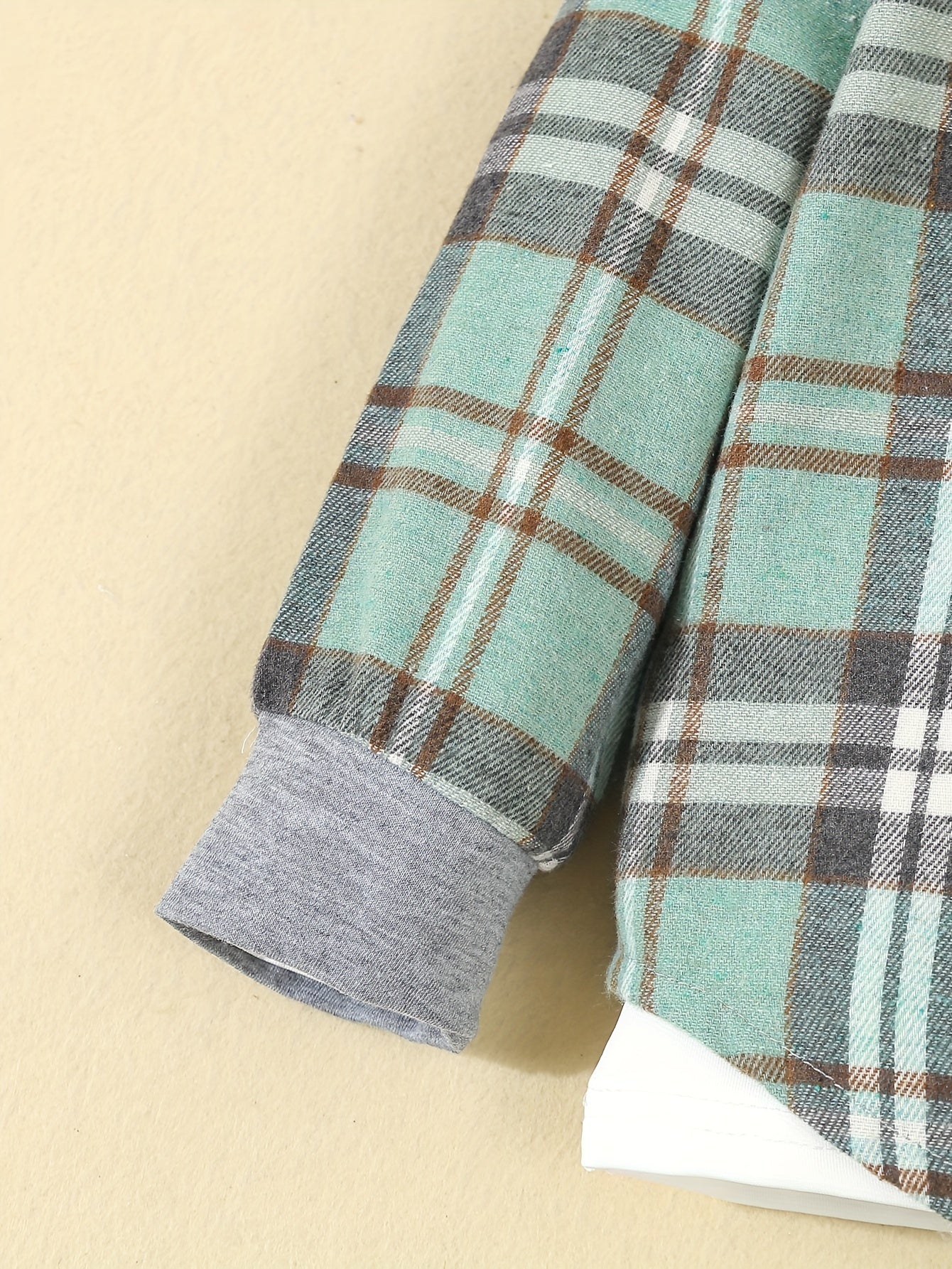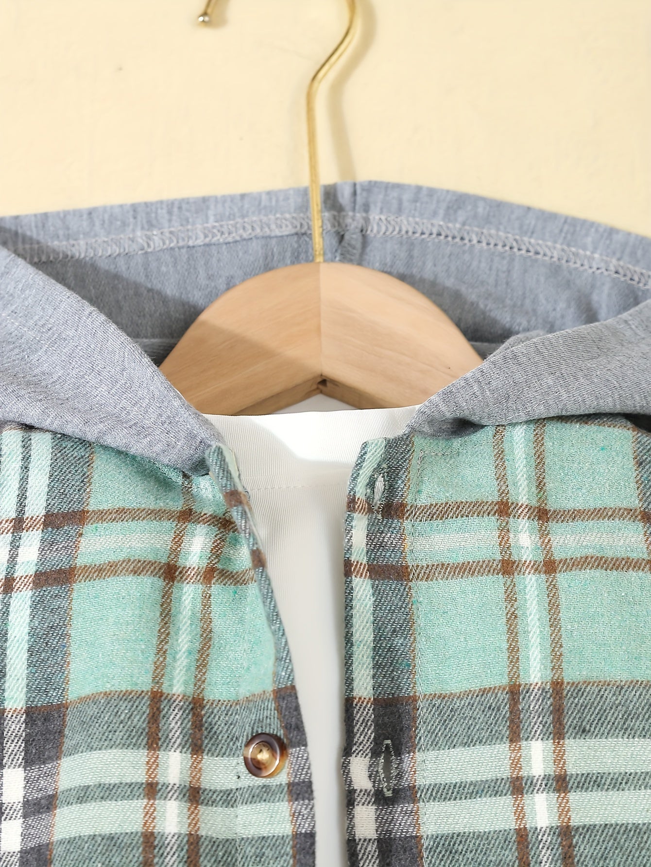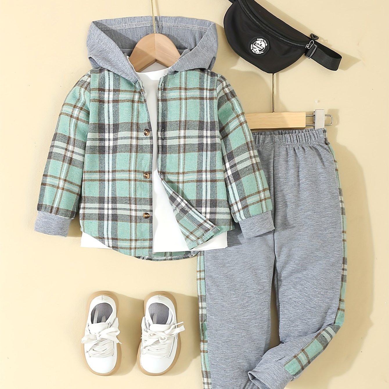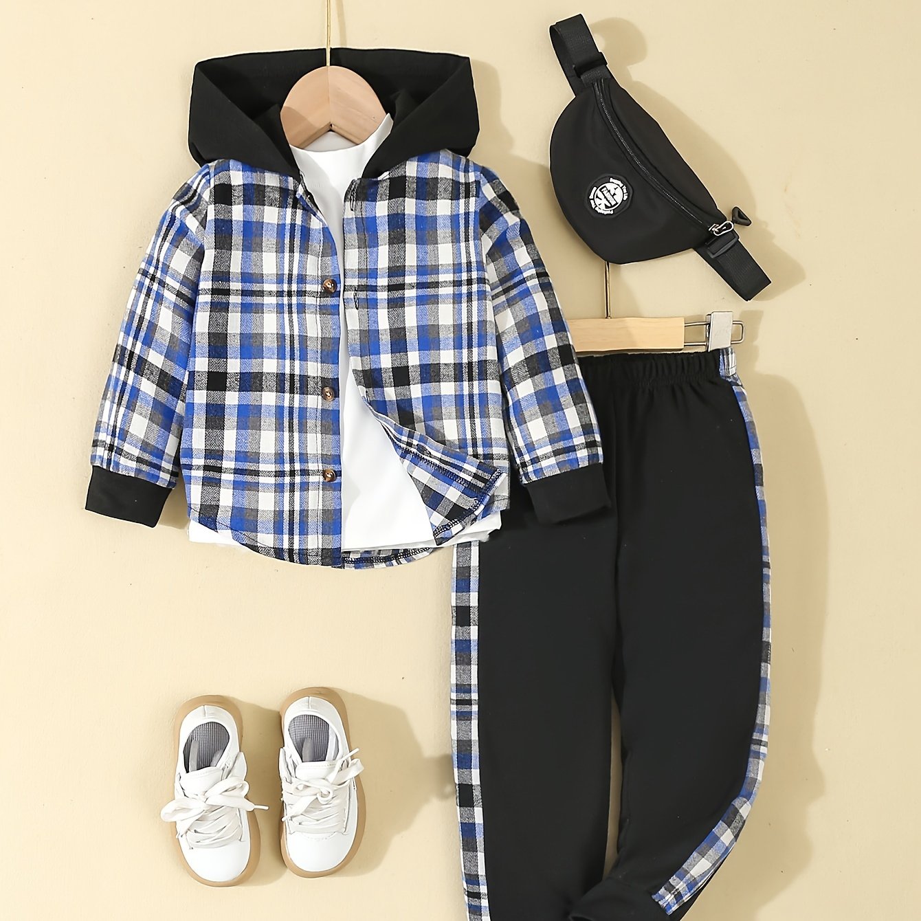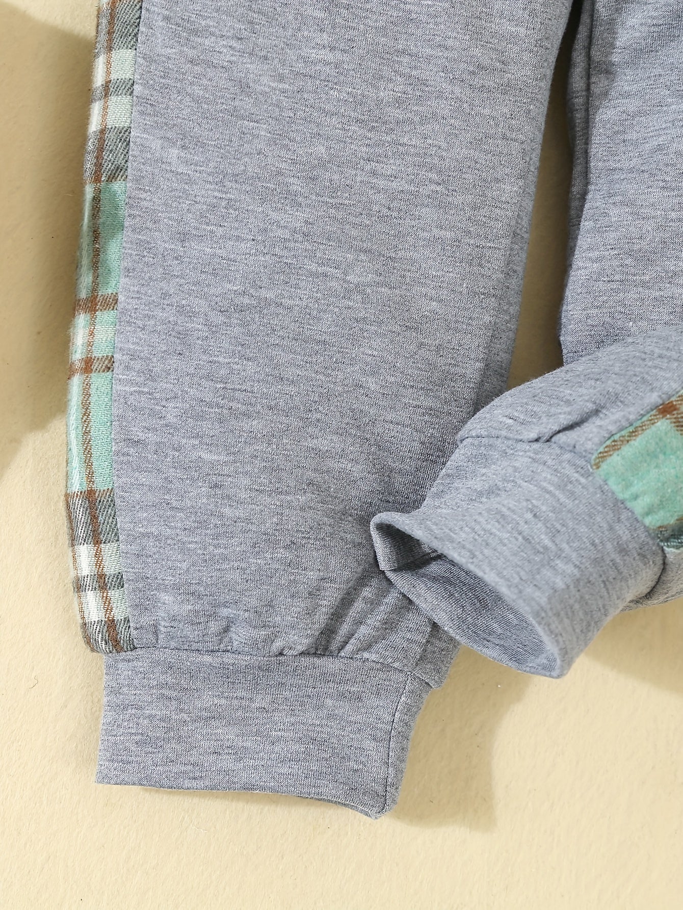 Yigitlar uchun kundalik to'plamda tekislikli kapüşonli asosiy kiyim va rangli blokli shimlar mavjud, bahor va kuz uchun