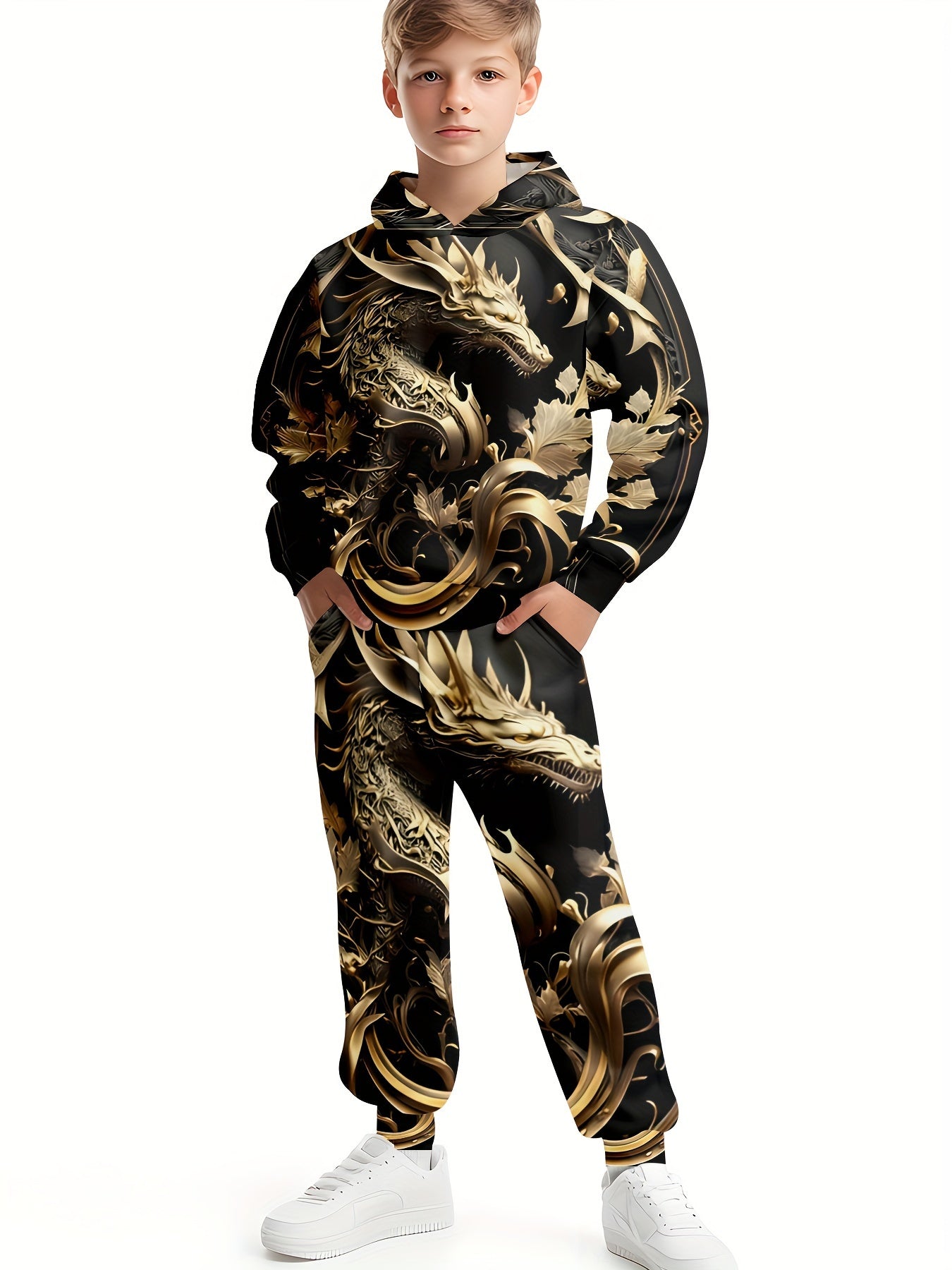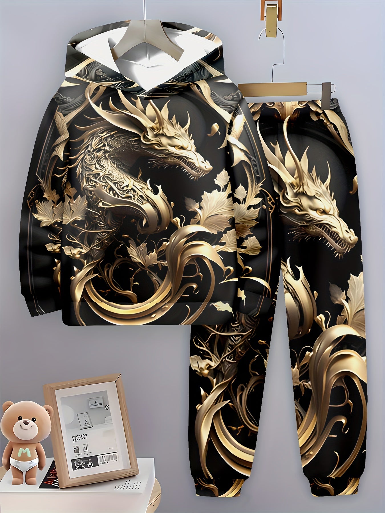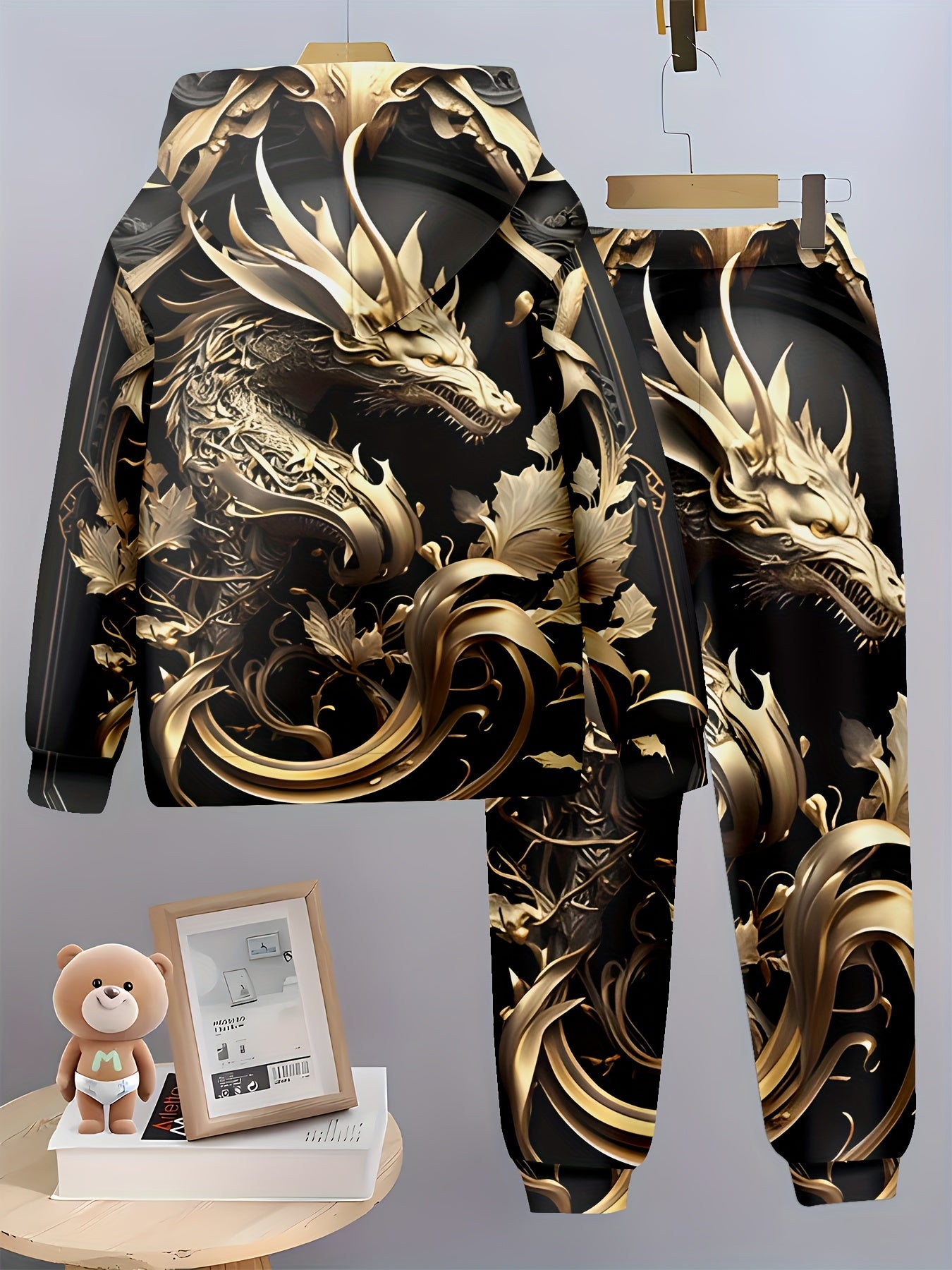 Yigitlar uchun 3D ajdarhond bosma kapşonli va joggerlar to'plami, oddiy bahor va kuz polyester kiyim