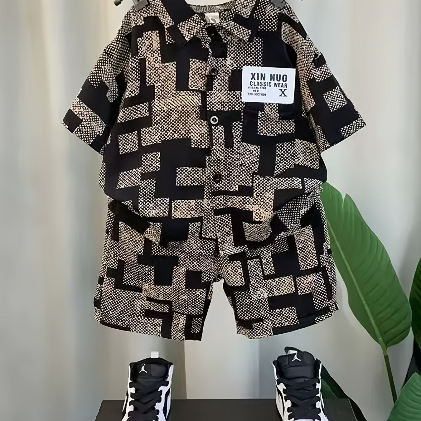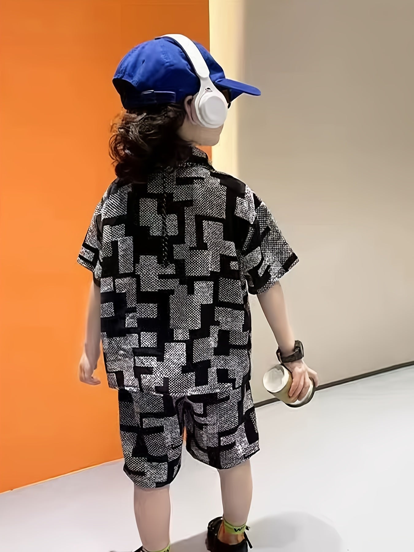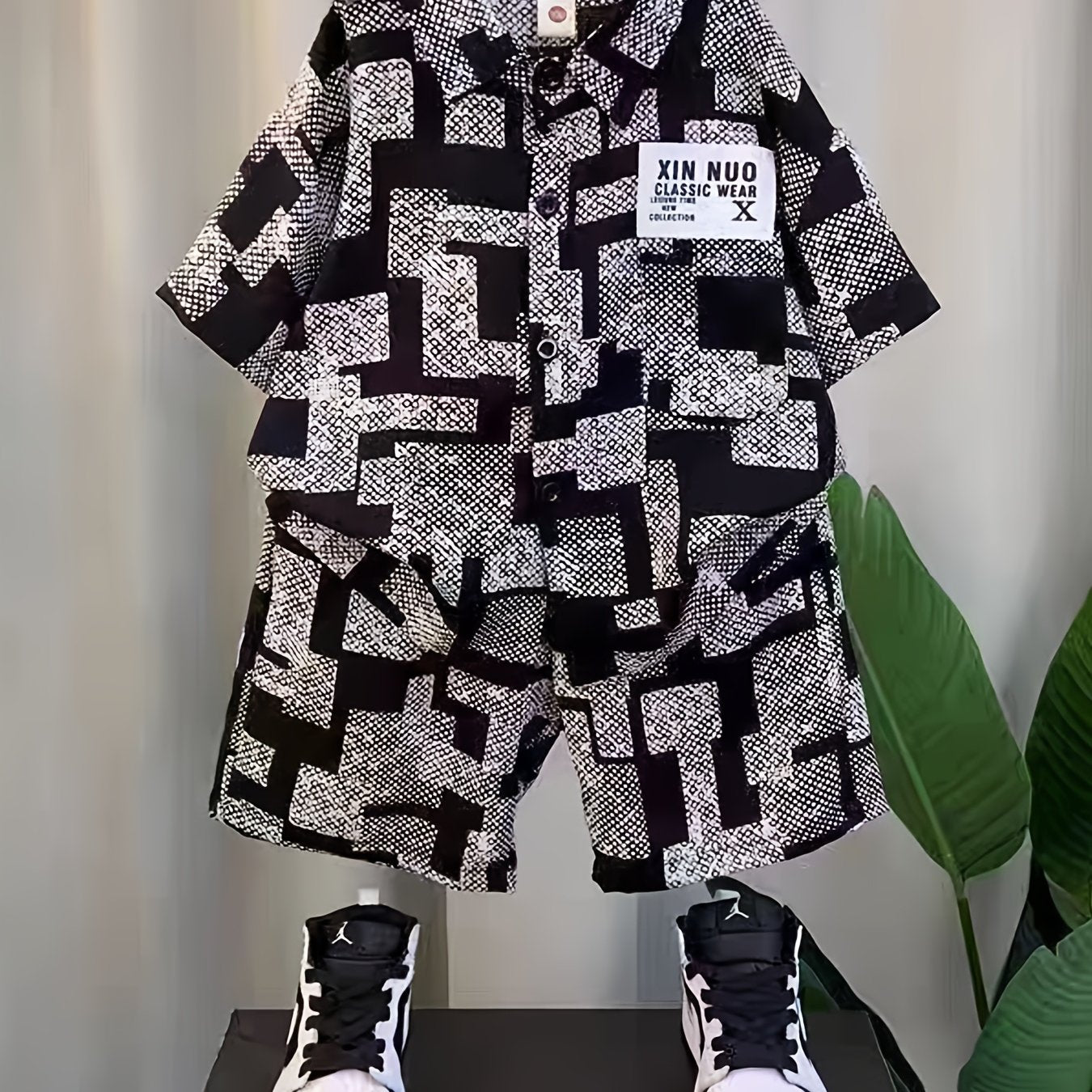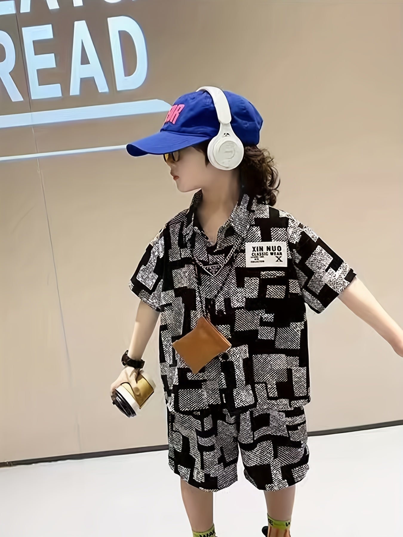 Yigitlar uchun yozgi kiyimlar to'plami, qisqa ko'ylak va shortlar, harf naqshli, polyester to'qima, yosh 12 va undan kichik