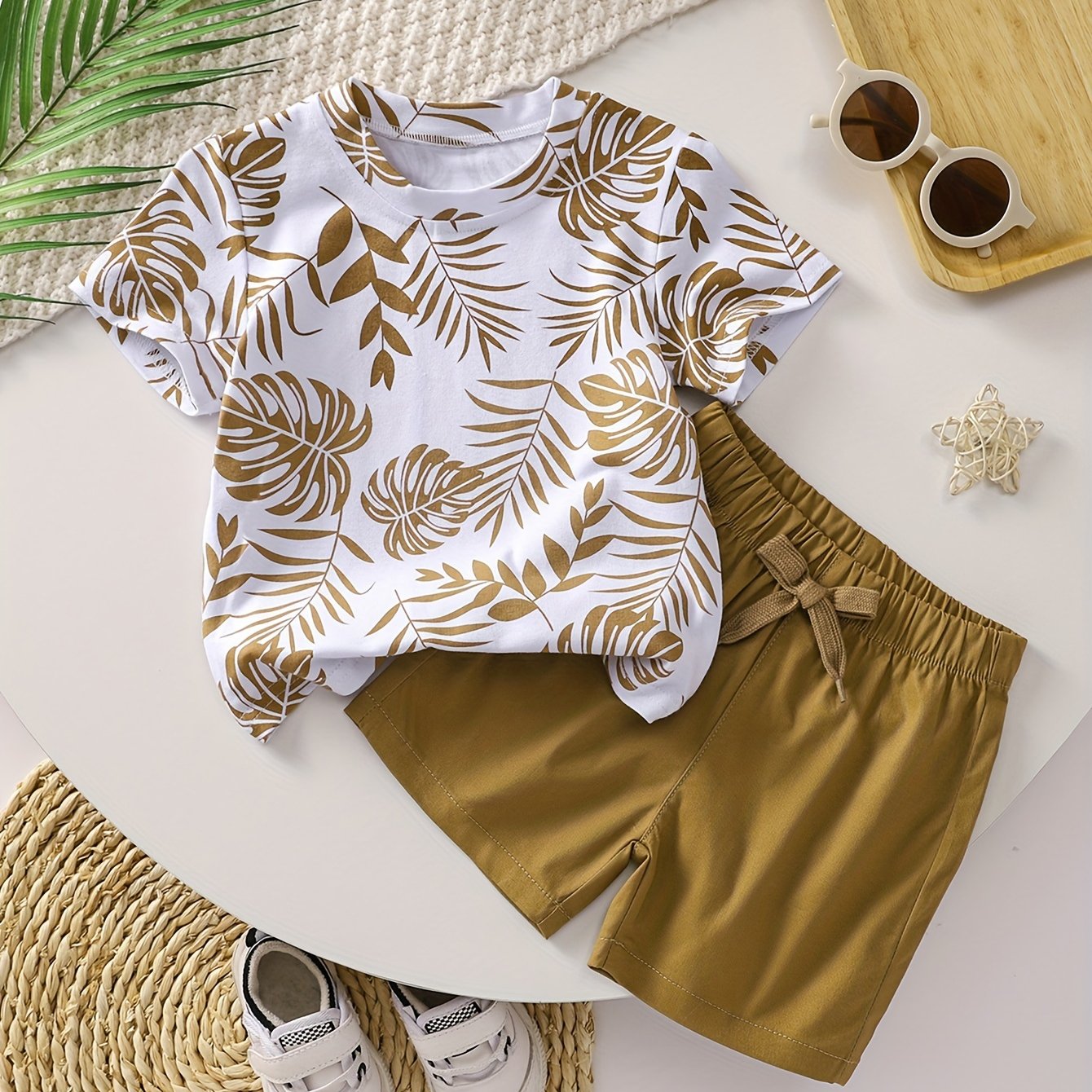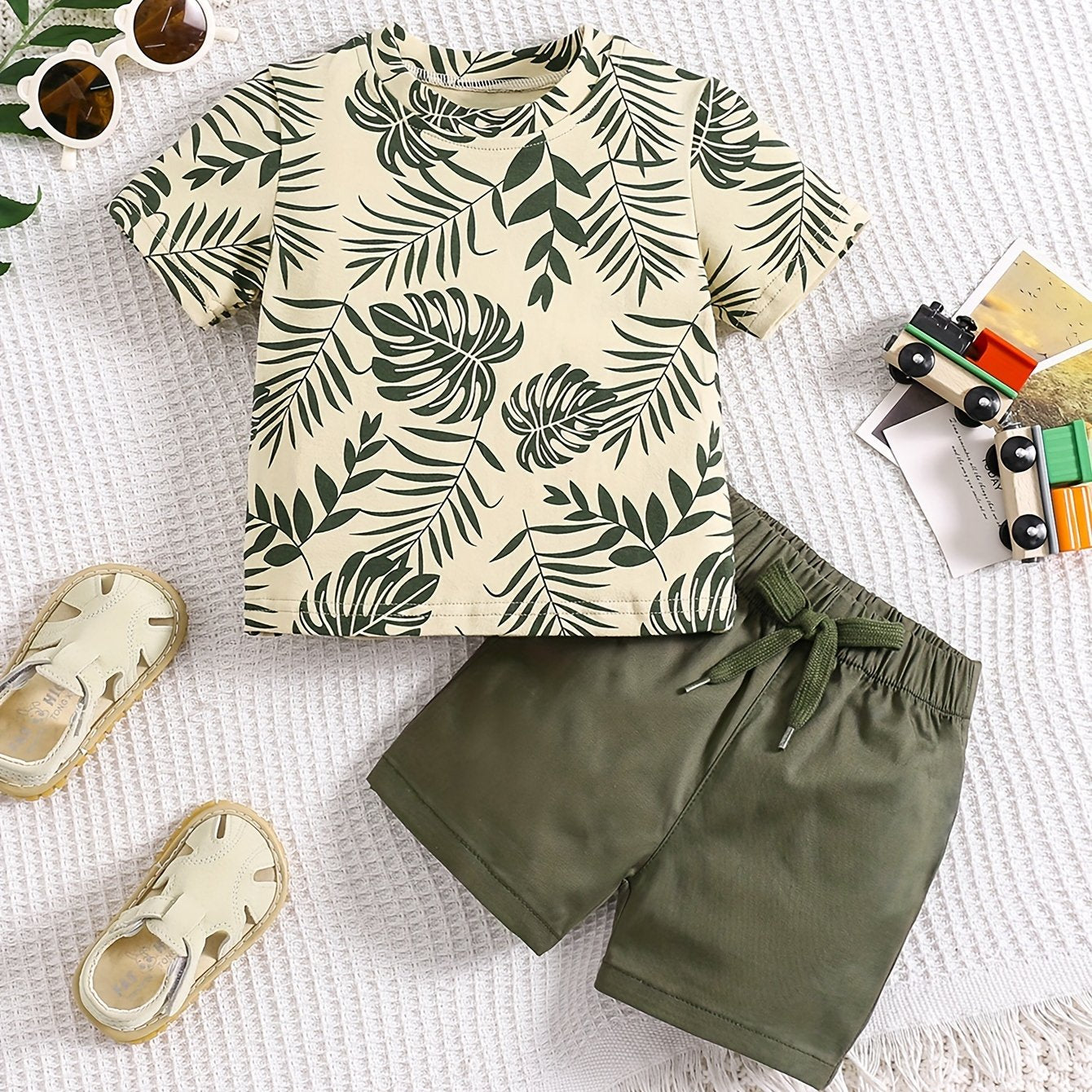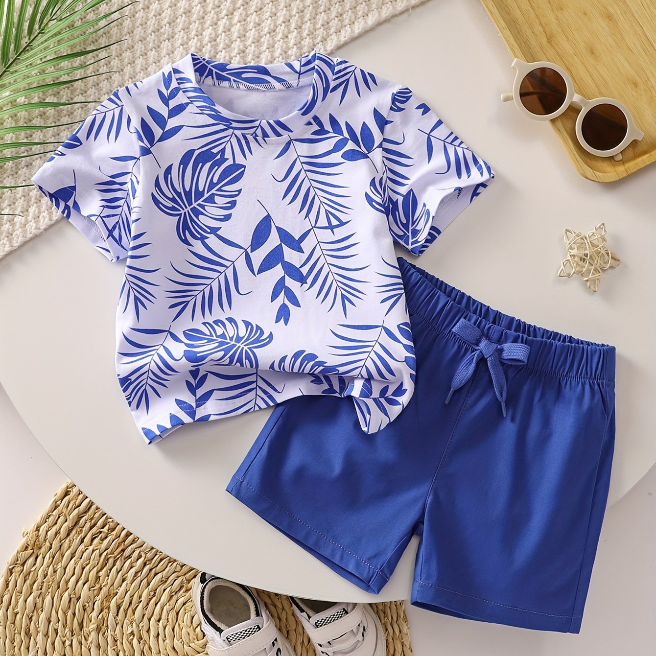 O'g'il bolalar uchun paxta bargi bosma kundalik kiyimlari, qisqa qo'lli T-shirt va chizilgan shortlar, bahor va yoz uchun