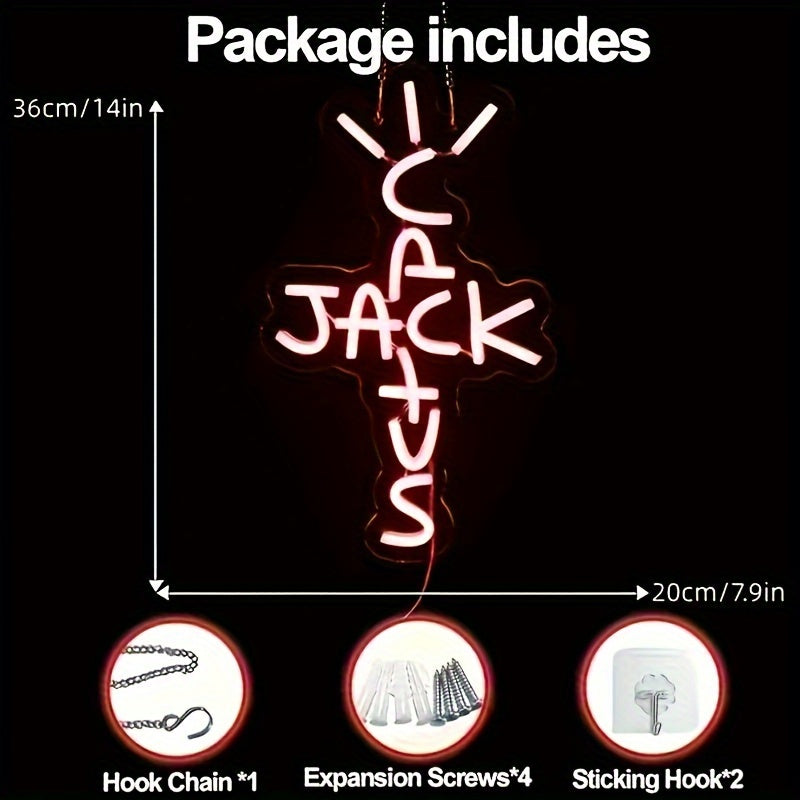 Cactus Jack Qizil Neon Belgisi USB quvvatlangan devor osma chiroq bo'lib, bosish tugmasi bilan boshqariladi. Bu yotoqxona, uy barlari, pub, partiyalar uchun ko'p funksiyali dekorativ buyum bo'lib, G'arbiy sohil rap madaniyatidan ilhomlangan.