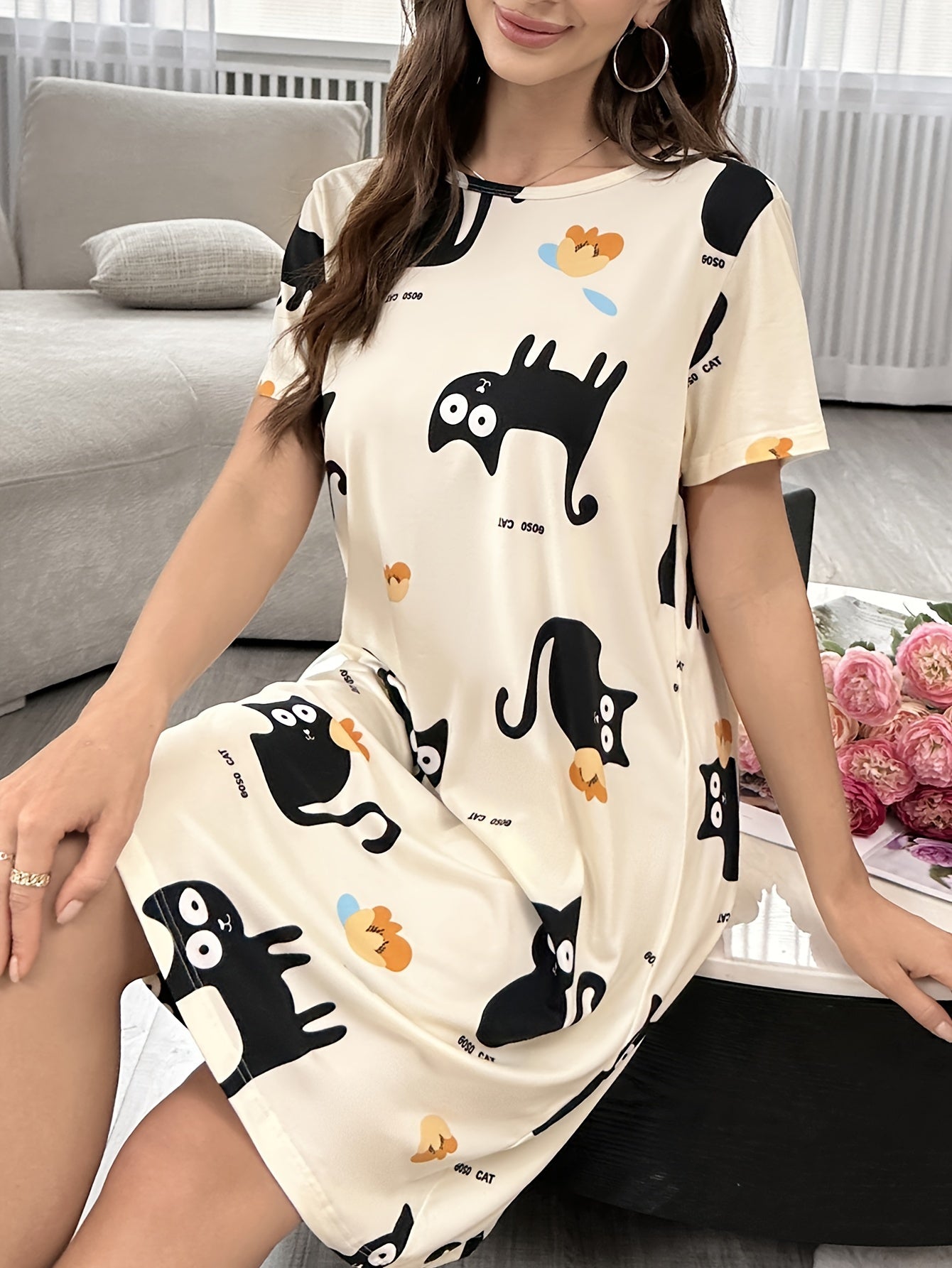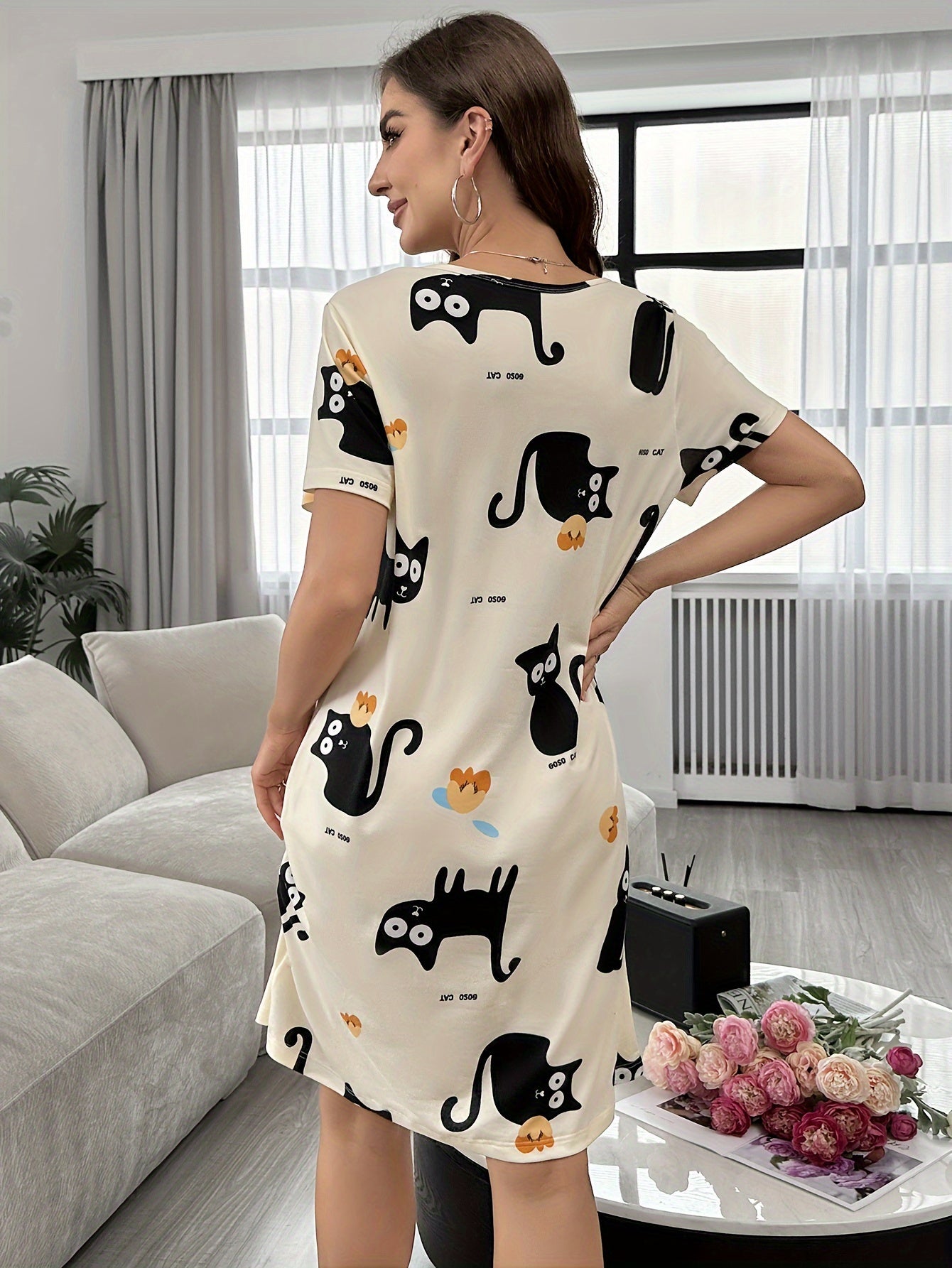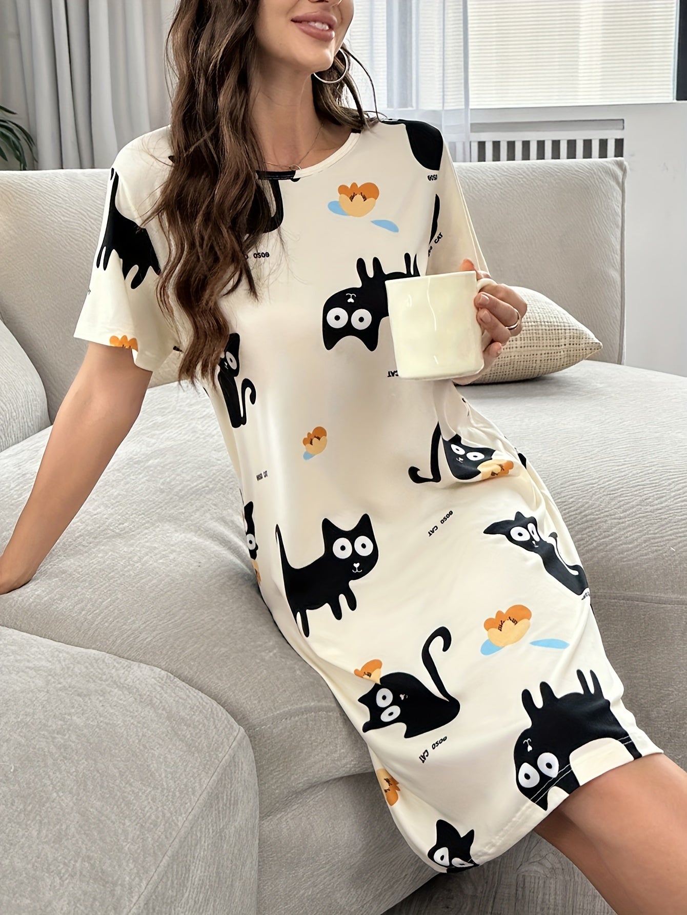 Ayollar uchun Multfilm Mushuk Print Tungi Kiyim, Qisqa Yengli Uxlash Kiyimi