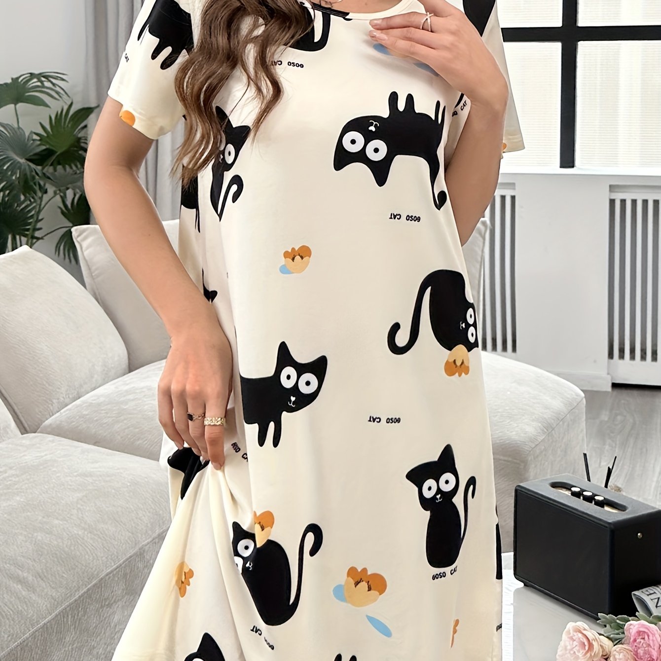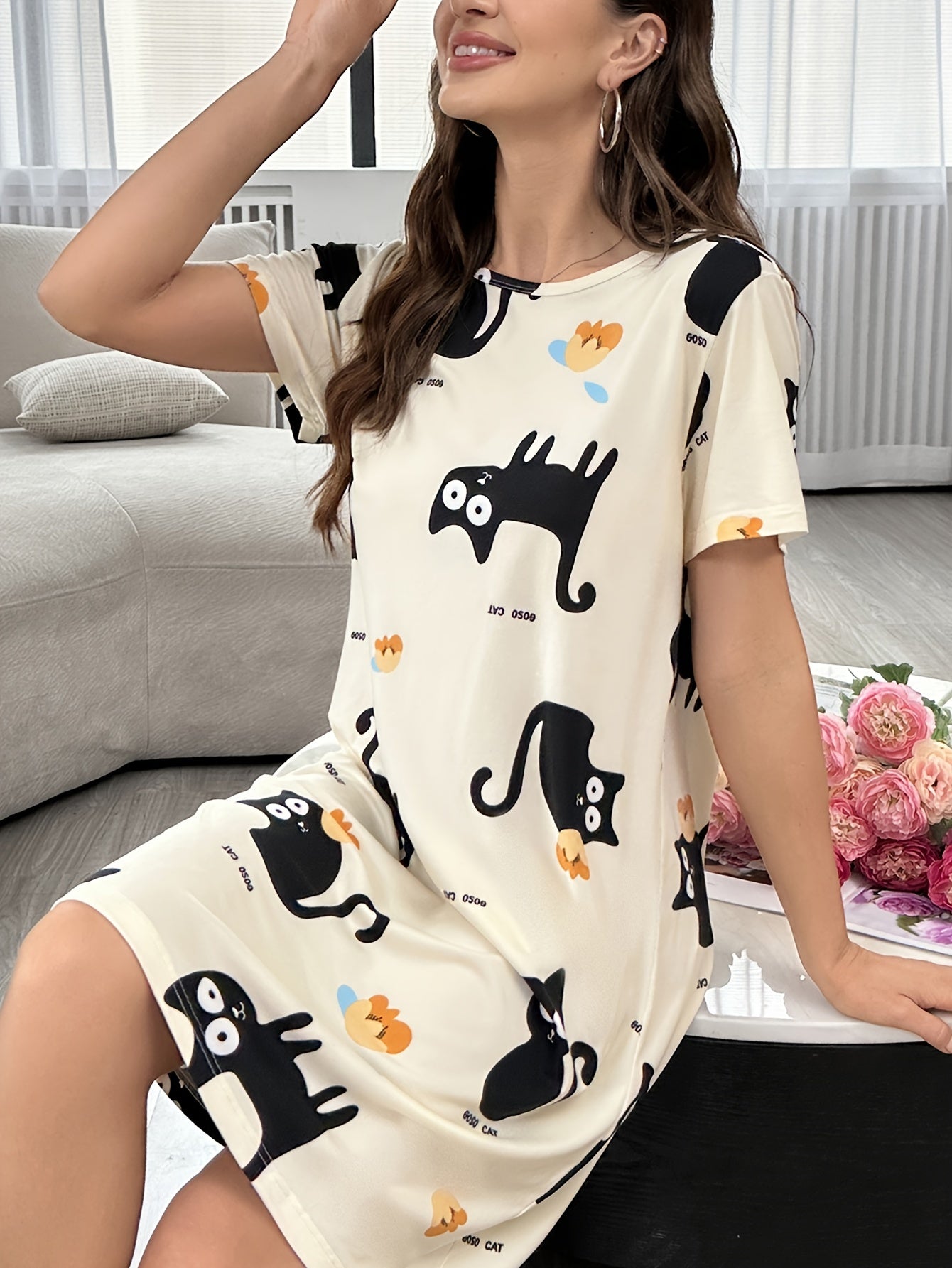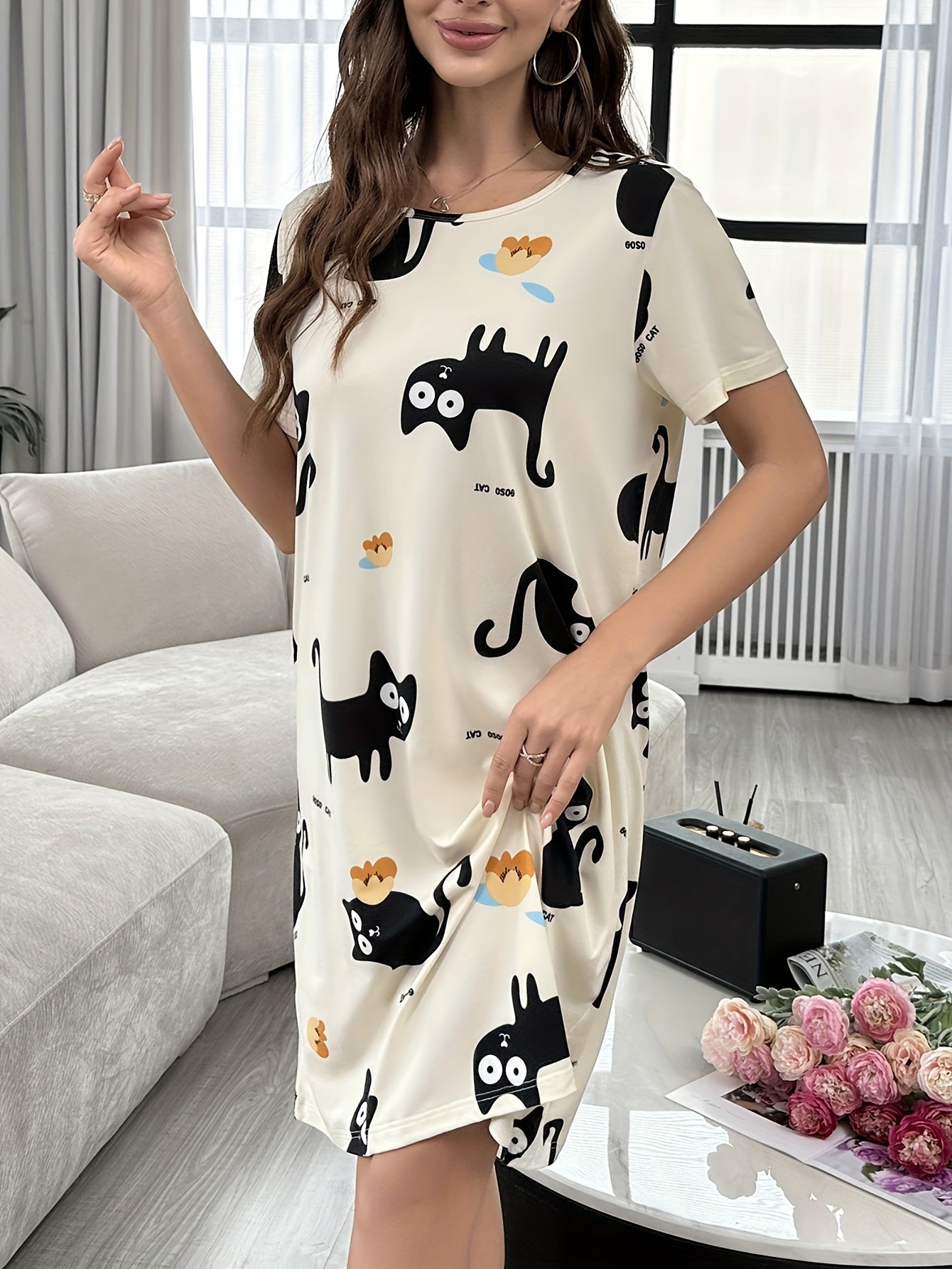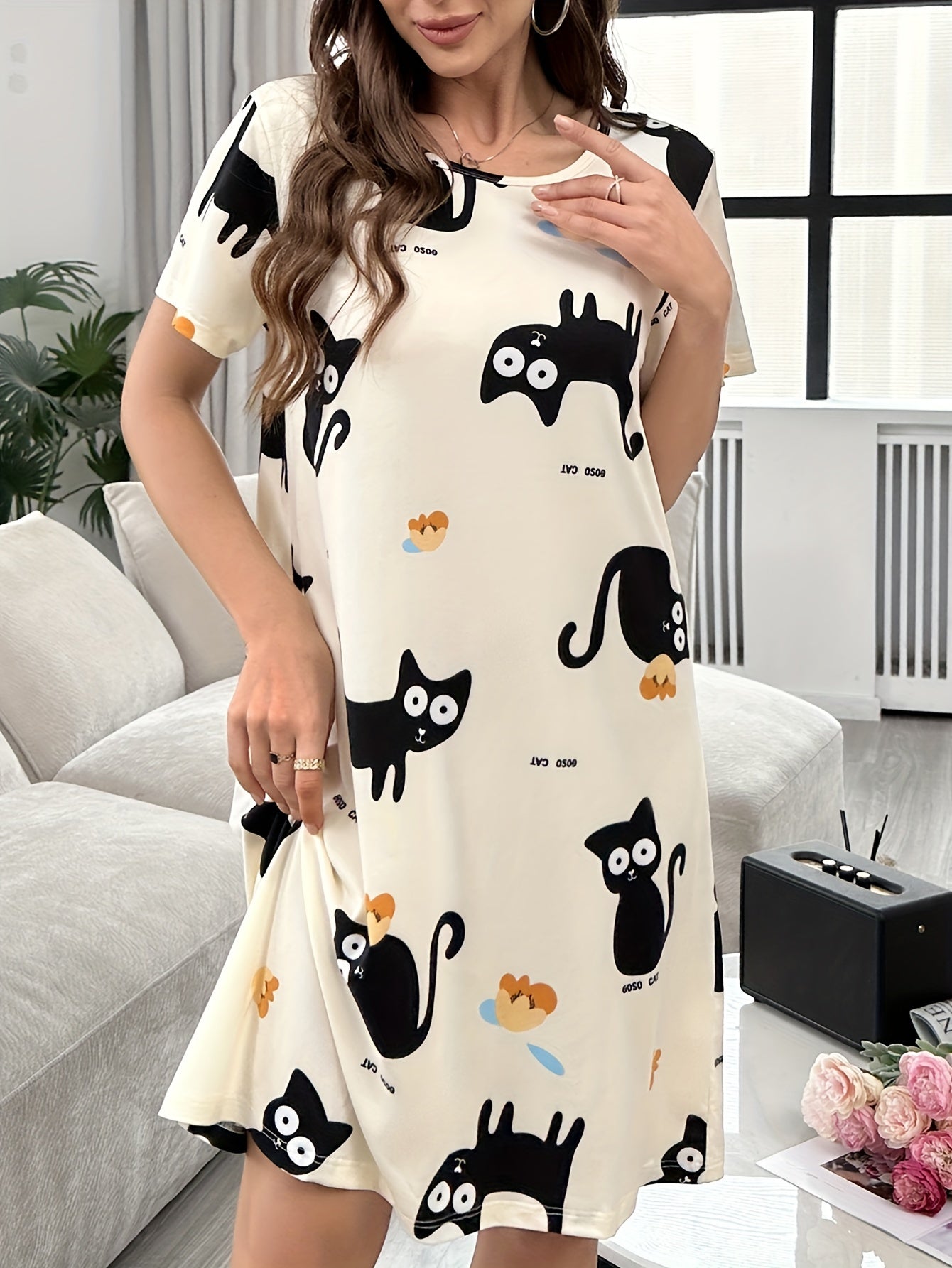 Ayollar uchun Multfilm Mushuk Print Tungi Kiyim, Qisqa Yengli Uxlash Kiyimi