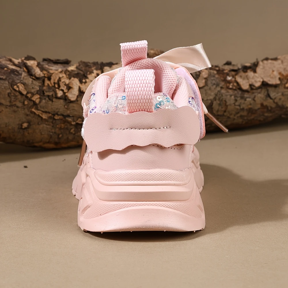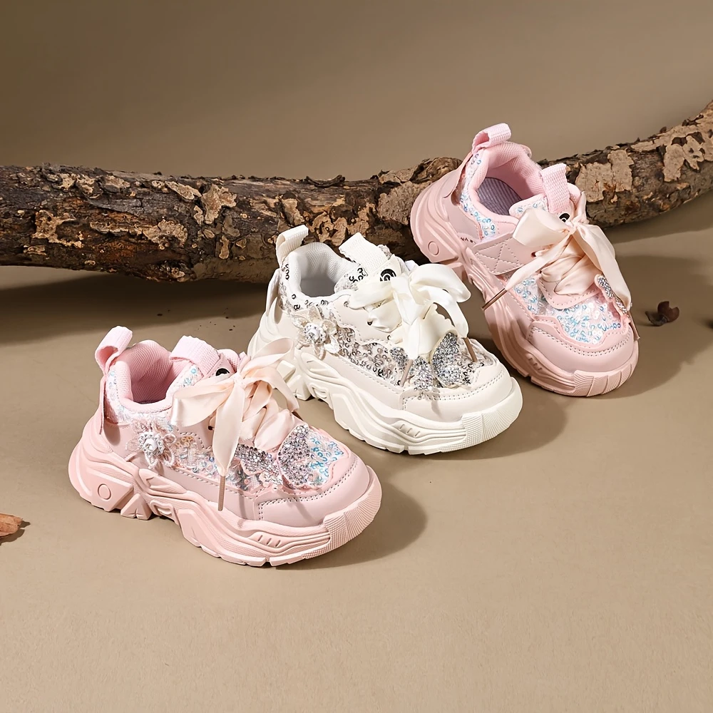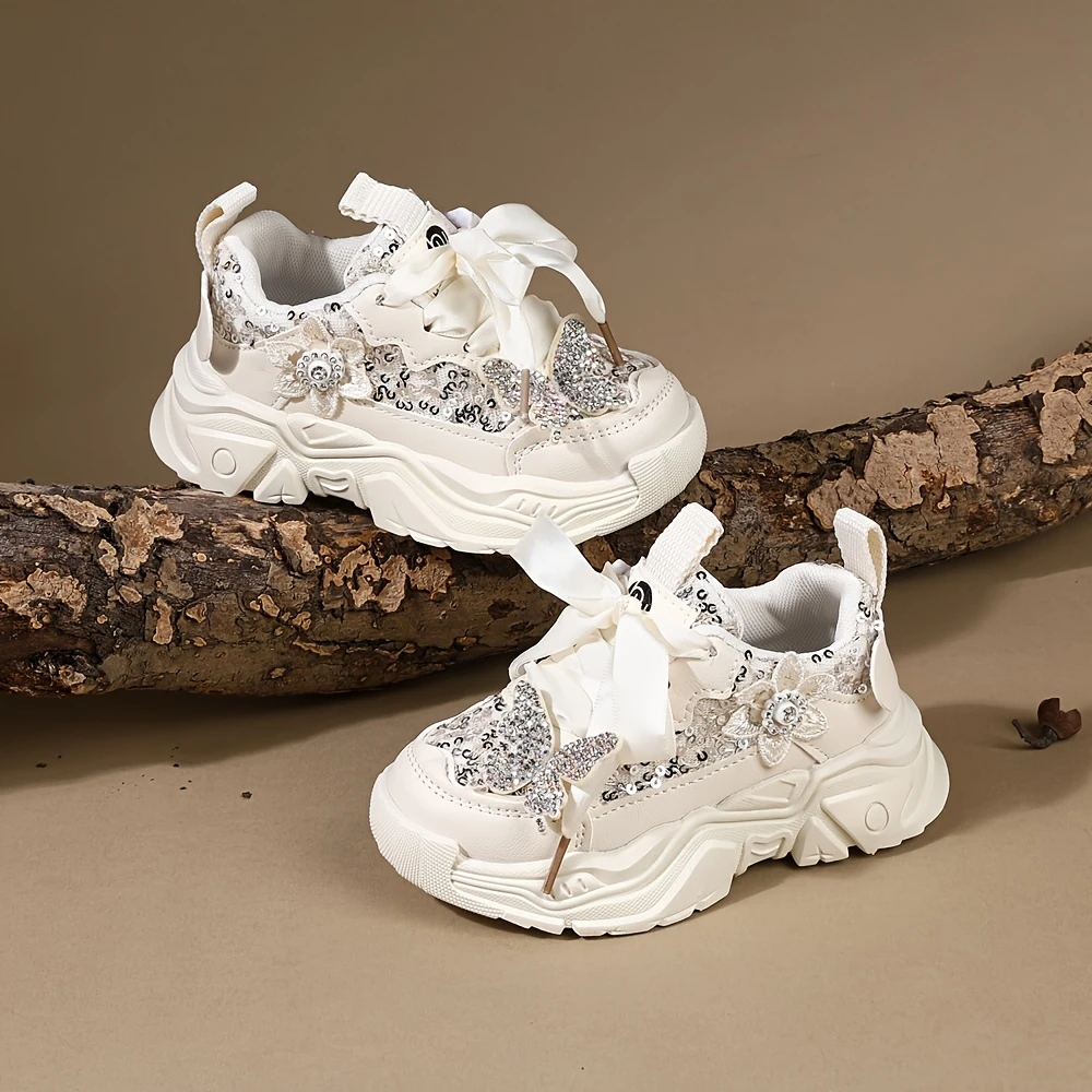 Yengil va yumshoq, yoshlar uchun mo'ljallangan, porloq rhinestone va kapalak kamon bezaklari bilan bezatilgan tasodifiy chic qizlar krossovkalari. Bahorda ochiq havoda o'ynash, partiyalar yoki ko'cha kiyimlari uchun ideal.