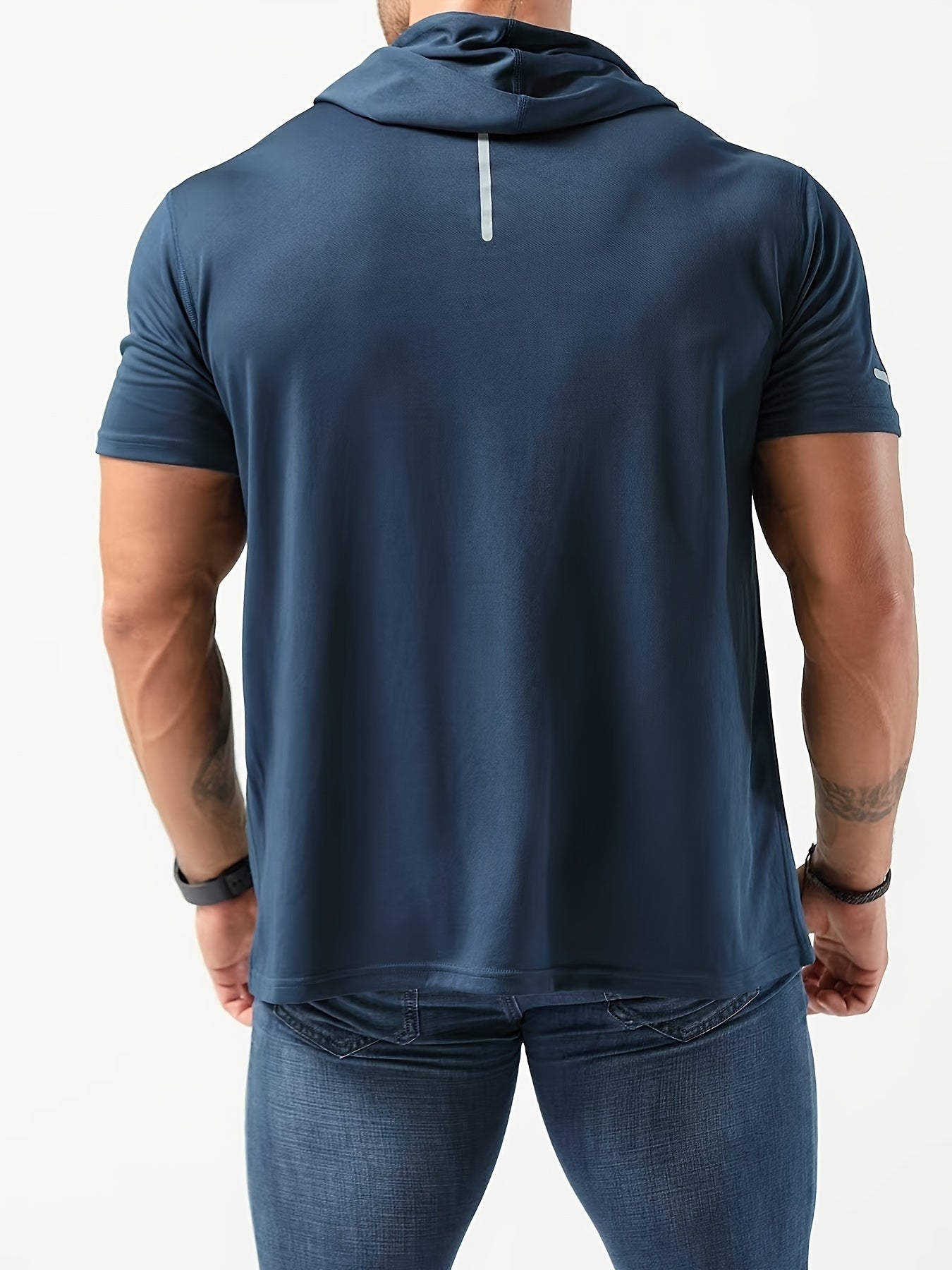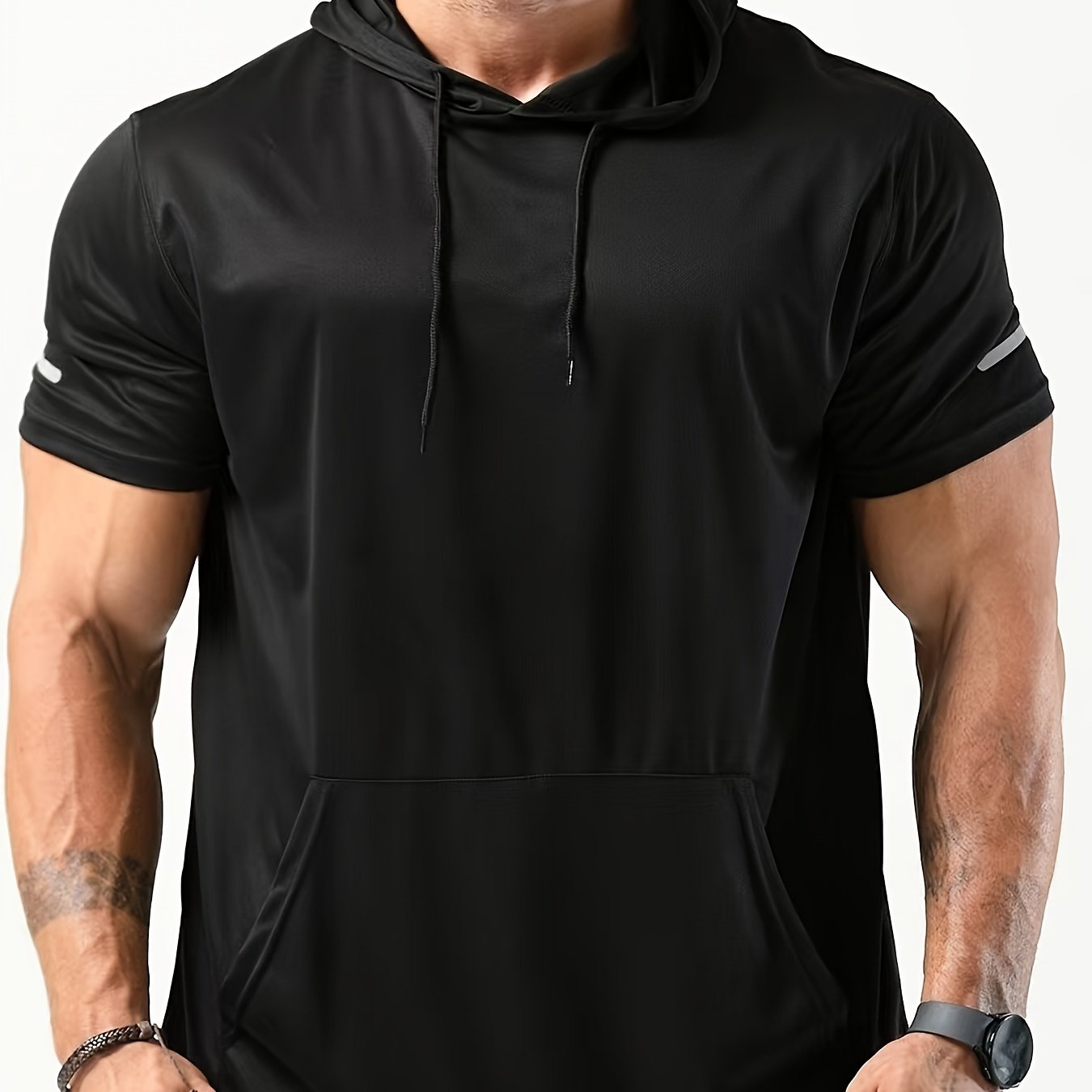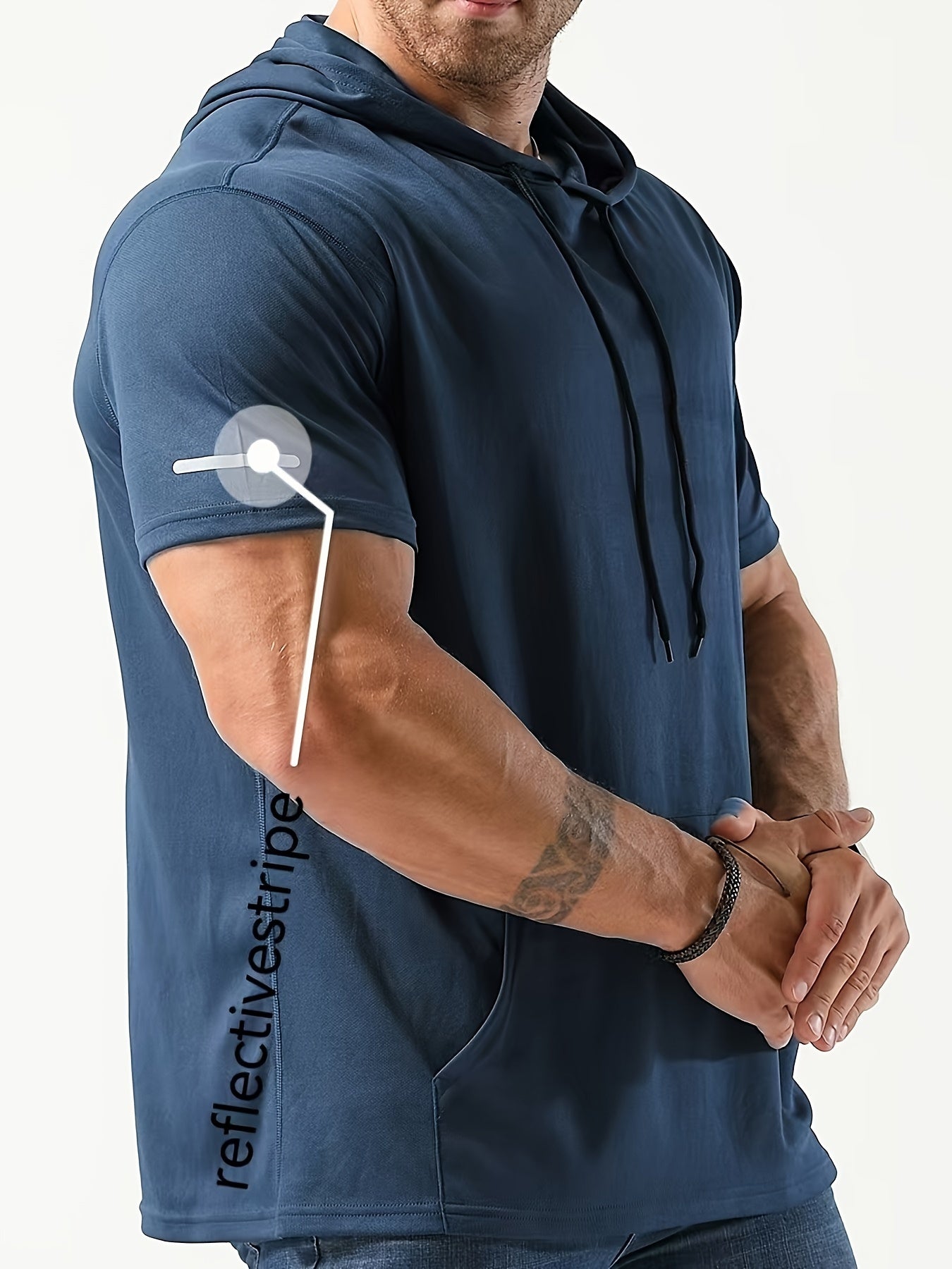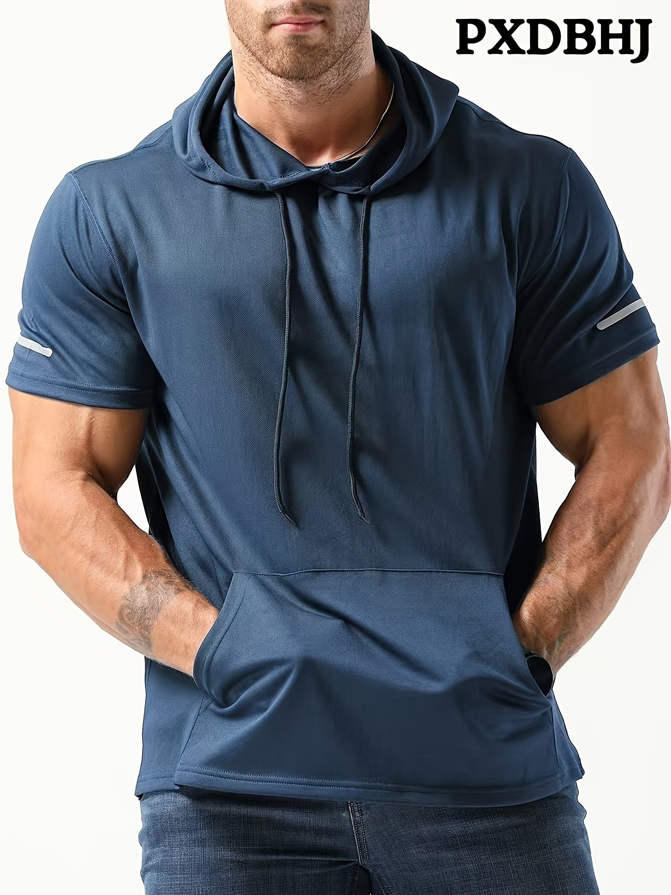 Erkaklar uchun tasodifiy kapüşonli futbolka, yugurish va mashg'ulotlar uchun ideal, nafas oladigan polyesterdan tayyorlangan, tortish ipi va aks ettiruvchi tafsilotlar bilan.