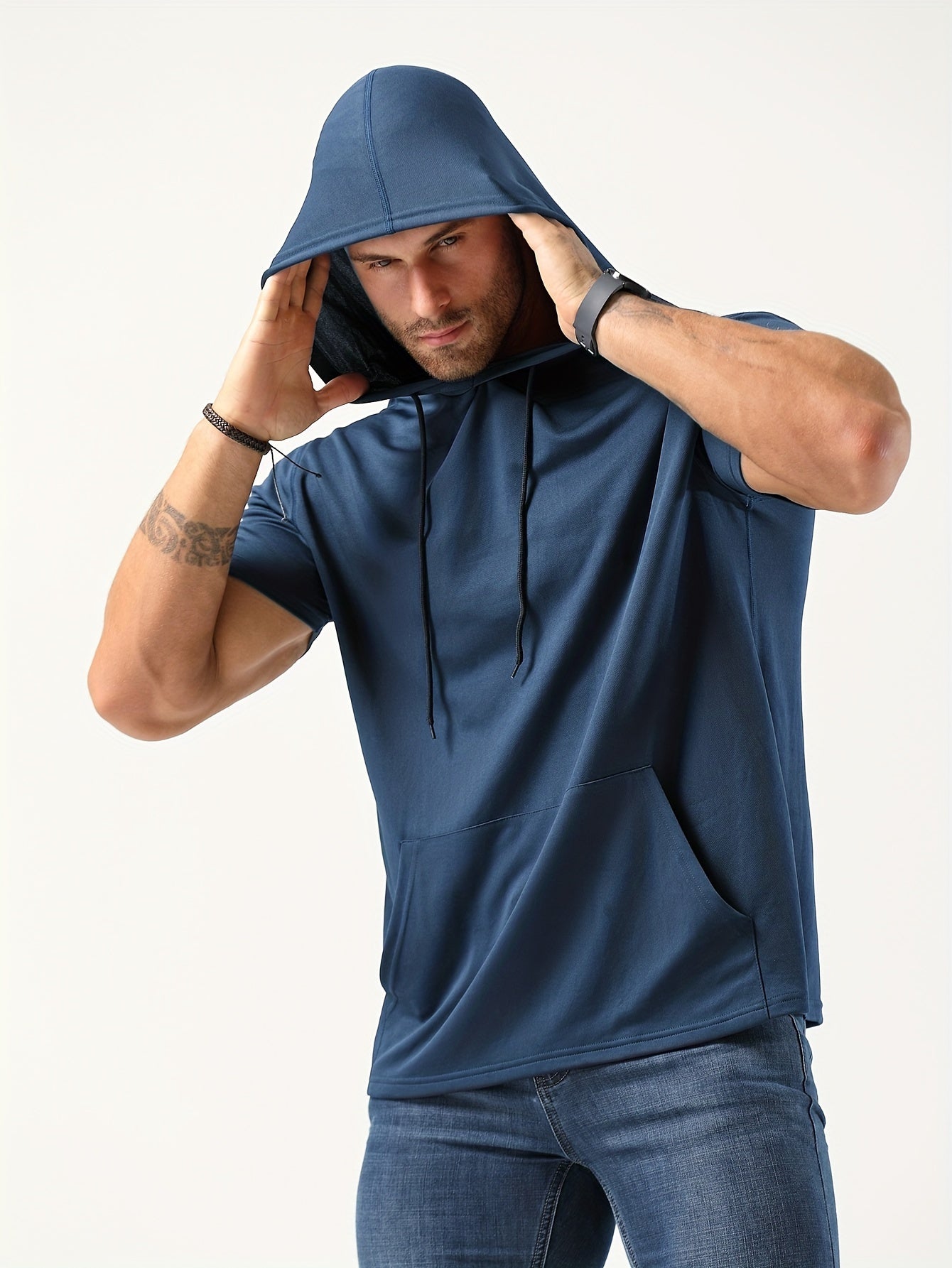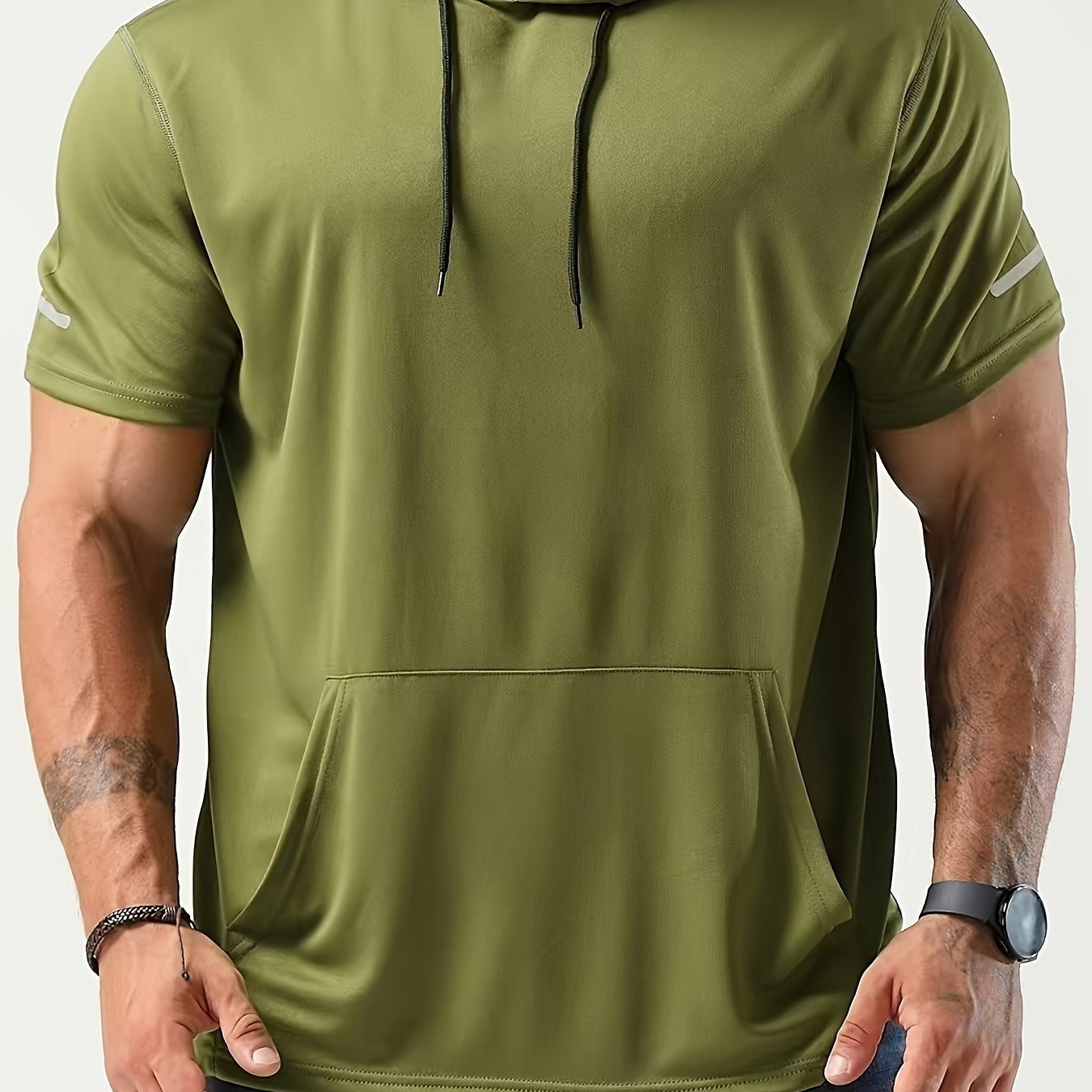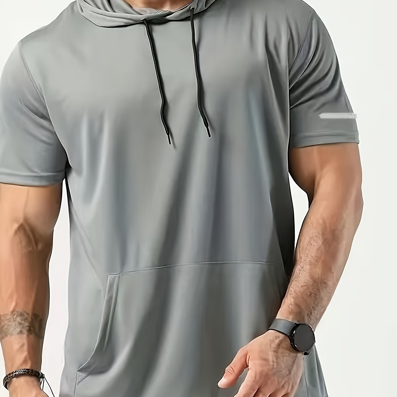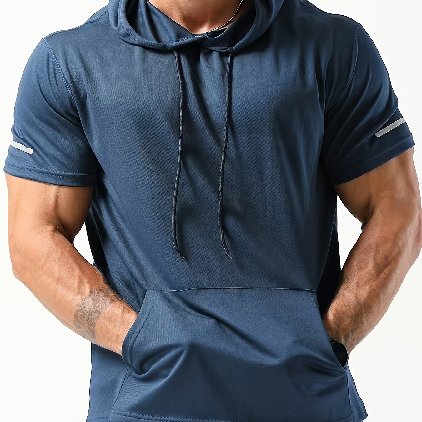 Erkaklar uchun tasodifiy kapüşonli futbolka, yugurish va mashg'ulotlar uchun ideal, nafas oladigan polyesterdan tayyorlangan, tortish ipi va aks ettiruvchi tafsilotlar bilan.