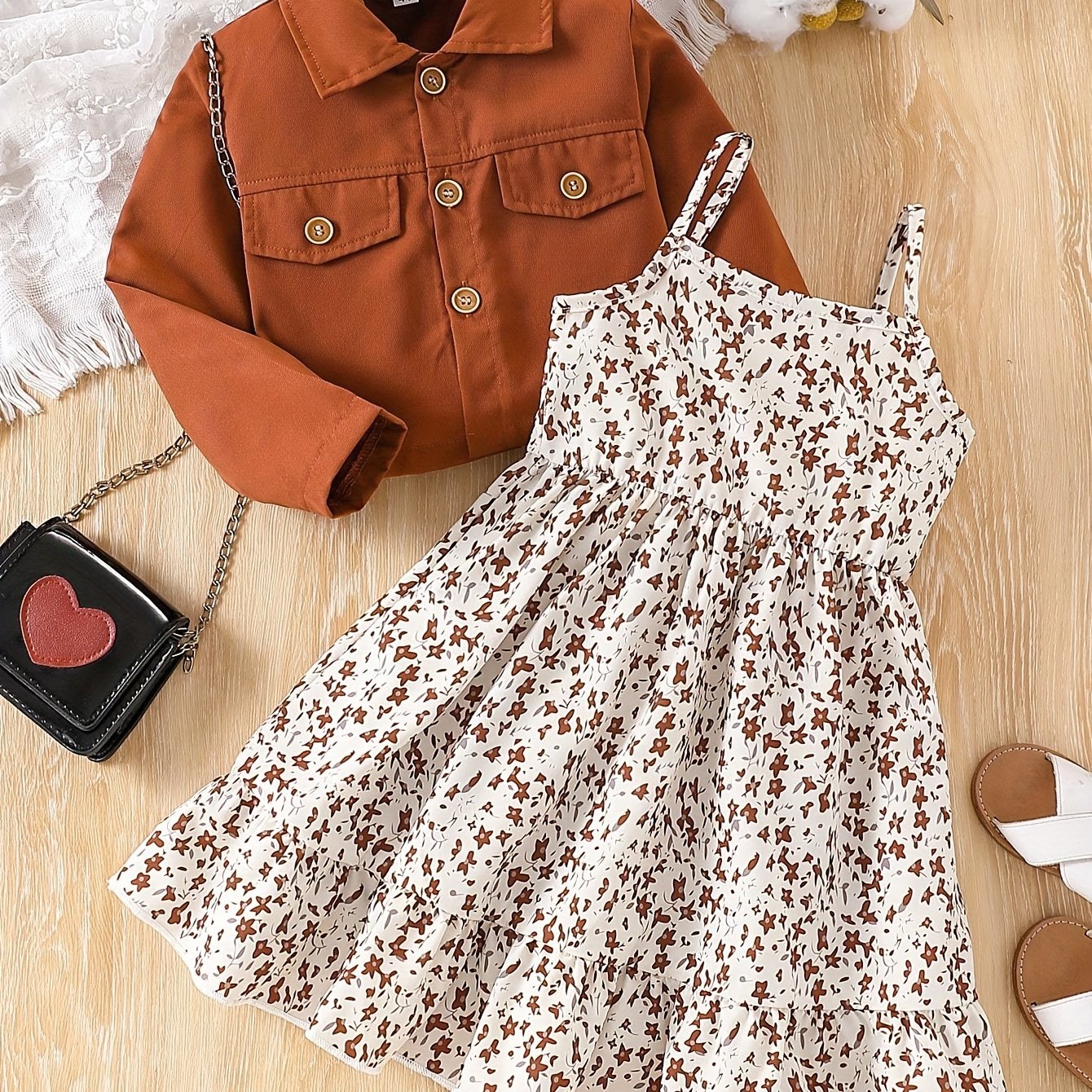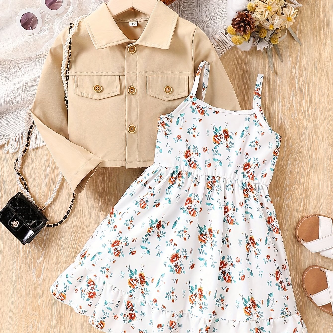 Bolalar uchun polyester gulli yubka to'plami, crop jaket va slingback poyabzal bilan