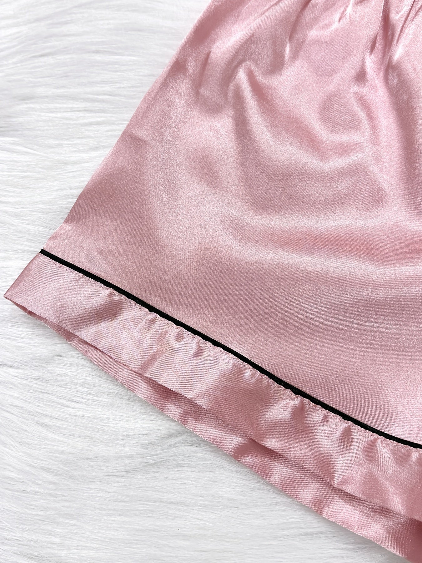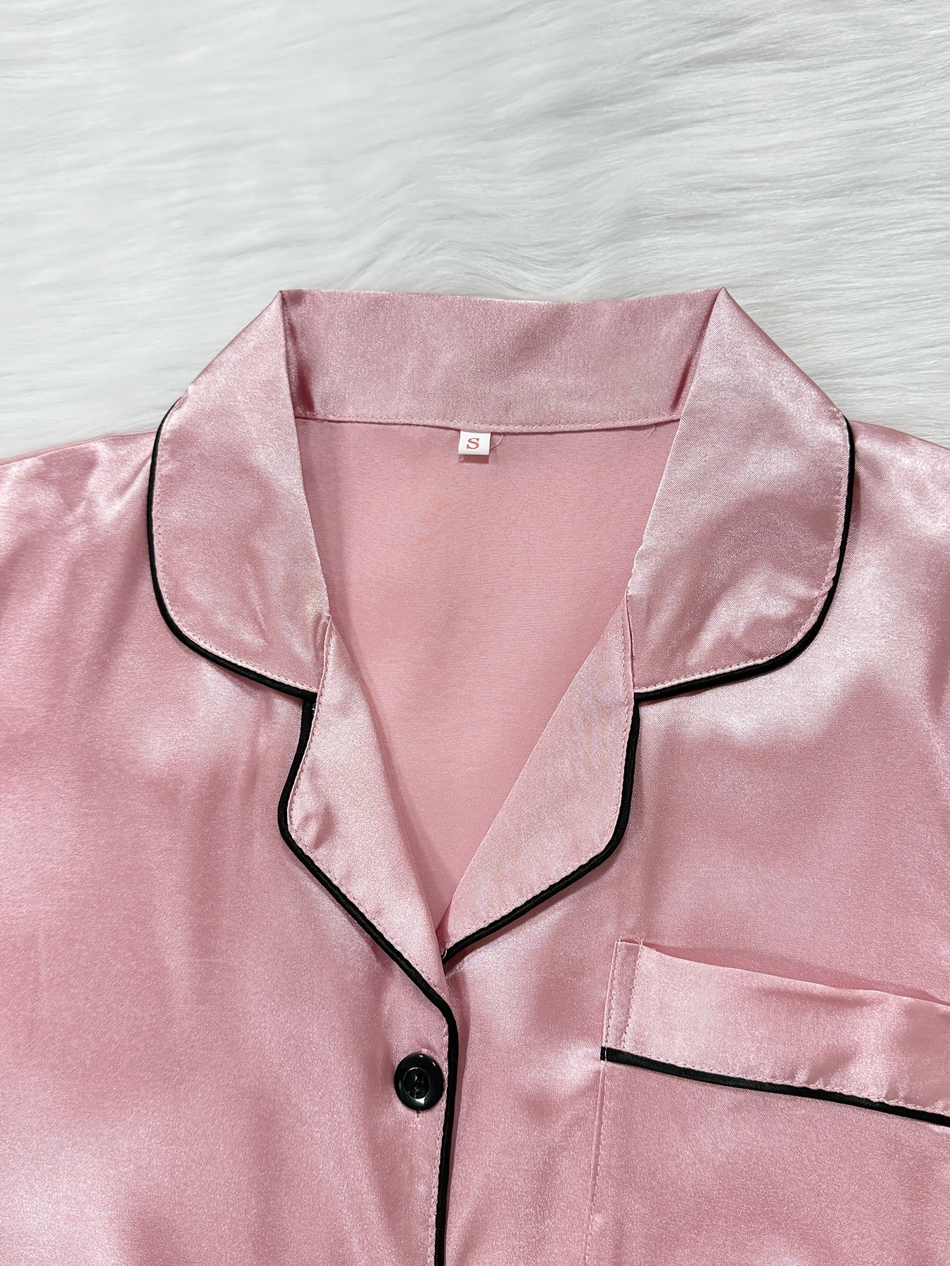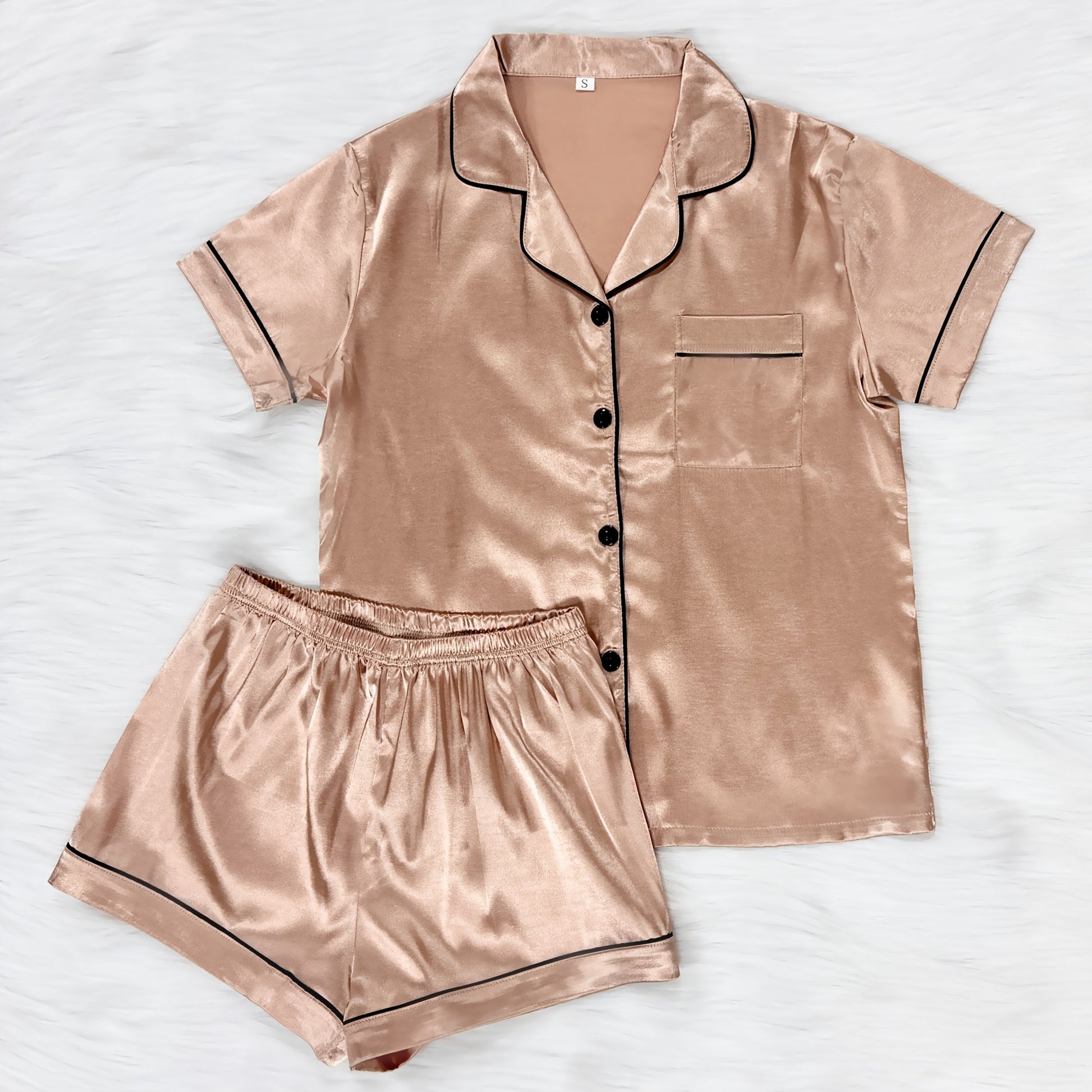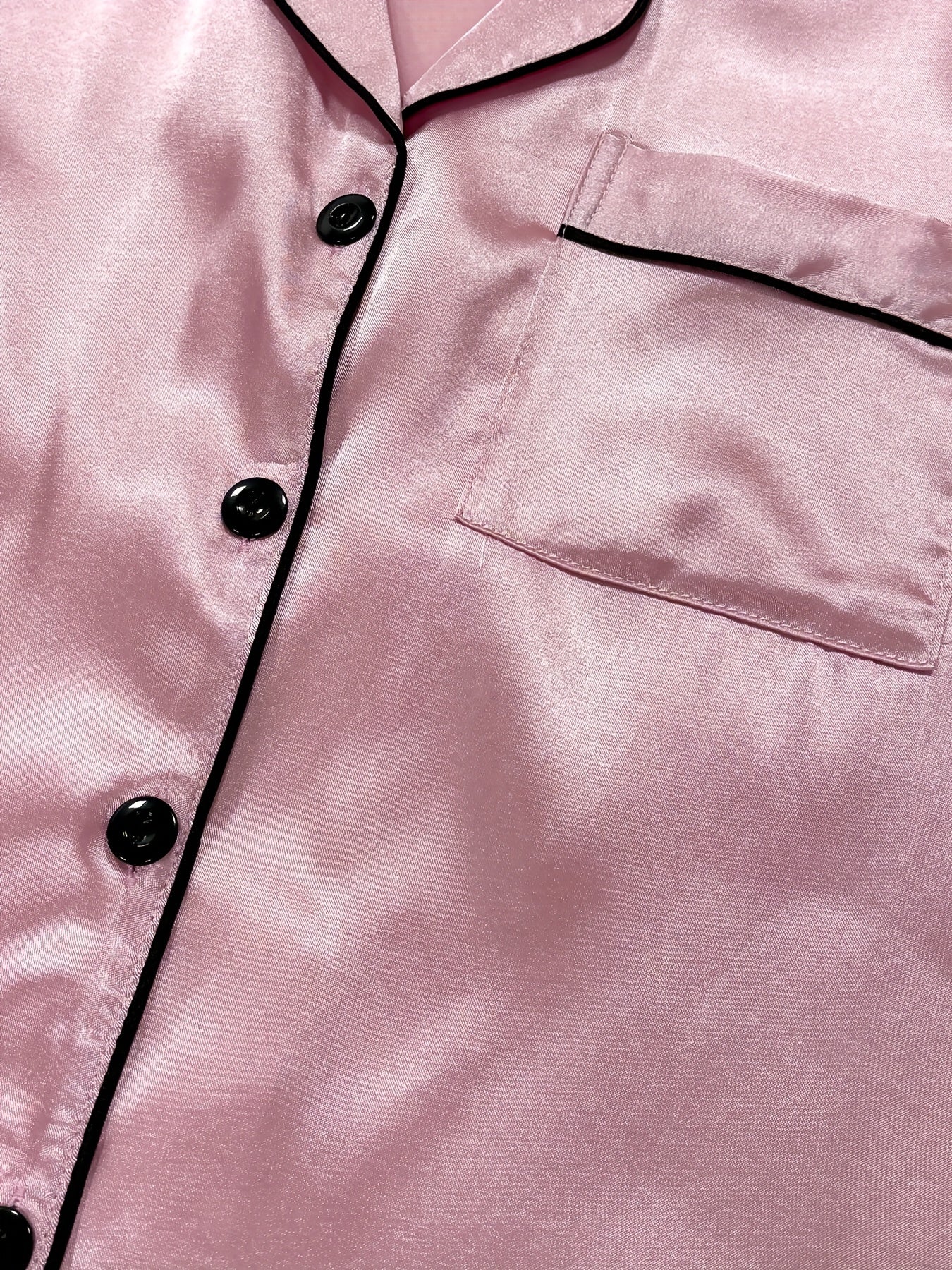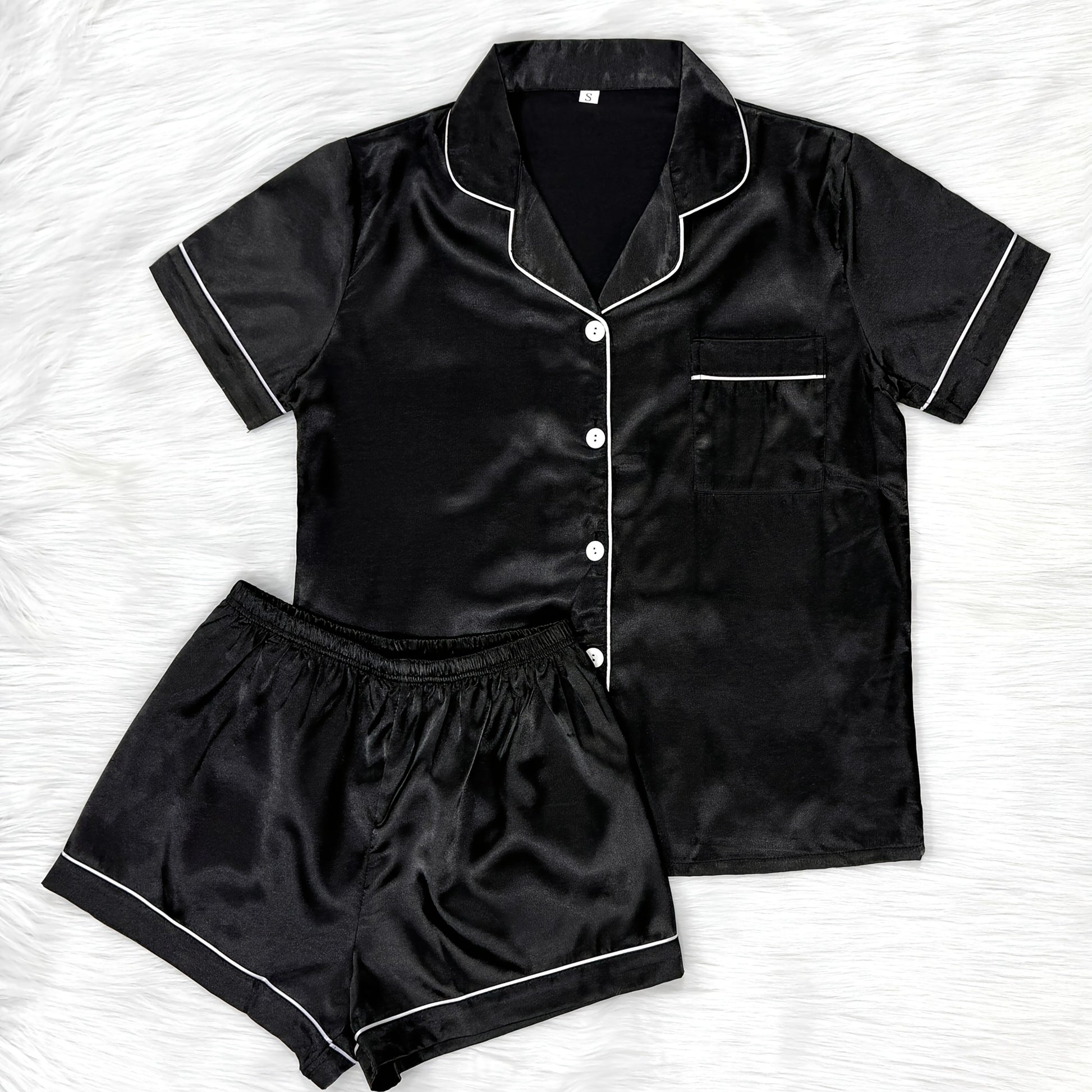 Ayollar uchun tasodifiy saten pijama to'plami, qisqa yengli yuqori qismi, yengil tugmalar va qulay moslik uchun shortlar.