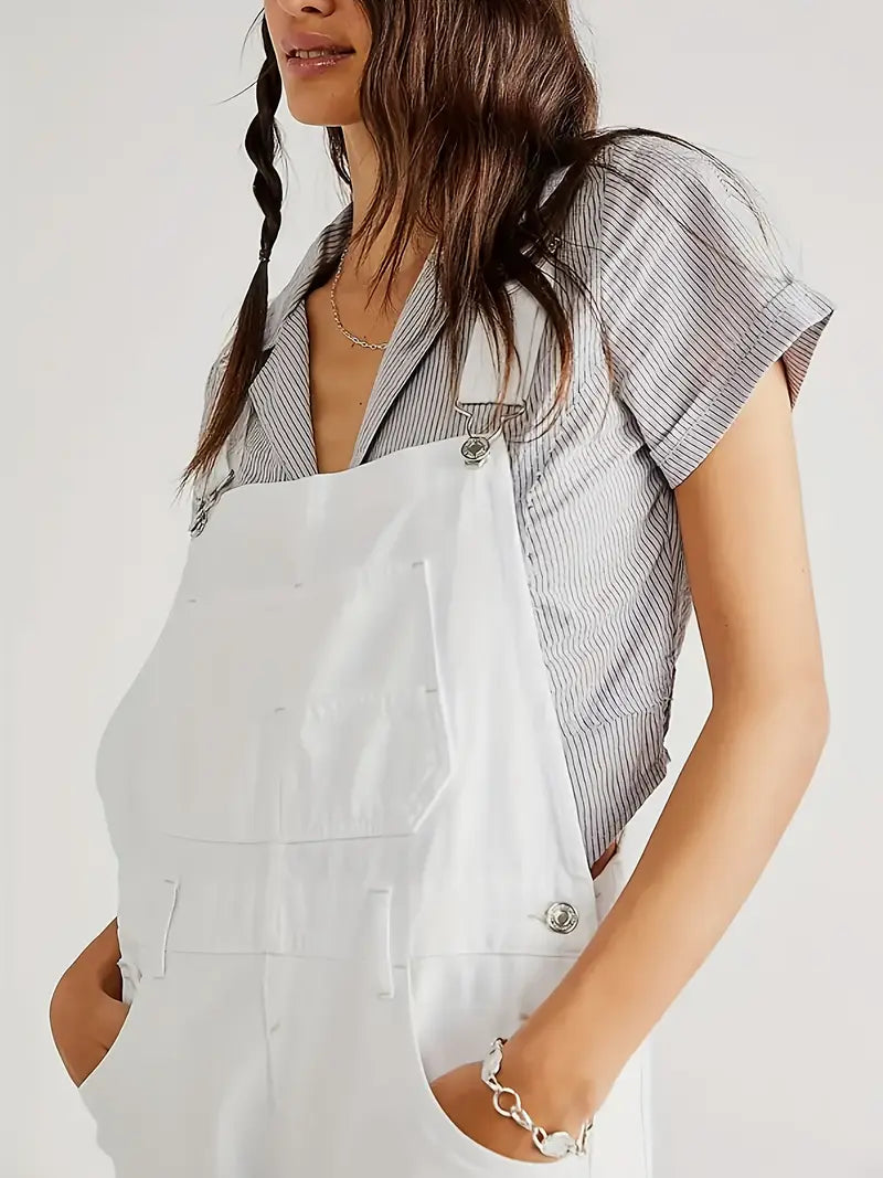 Ayollar uchun tasodifiy bir rangli denim kombinezon, viskoza va polyester aralashmasidan tayyorlangan, orqa qismi tasma dizayni, kamar kiritilmagan, oddiy moslik.