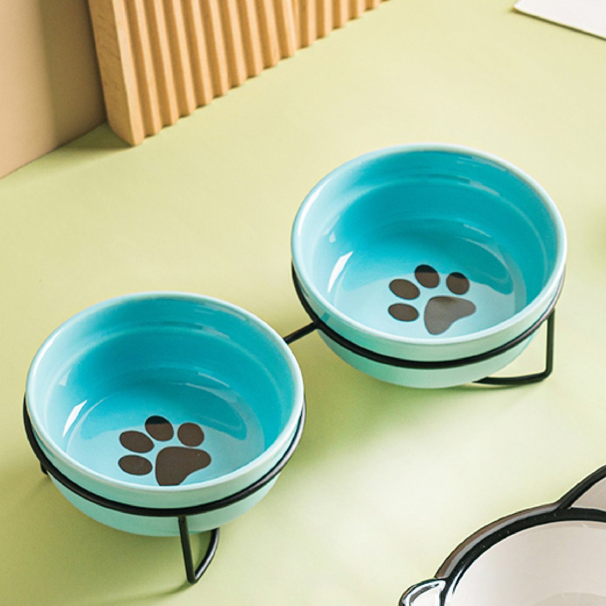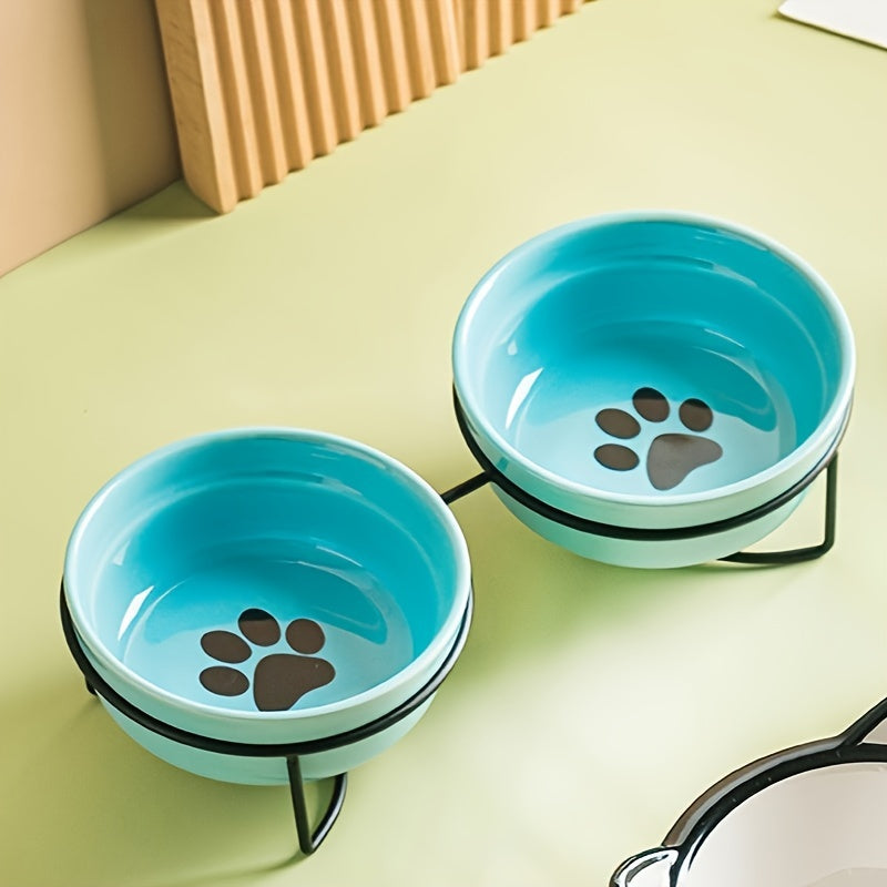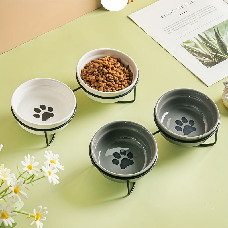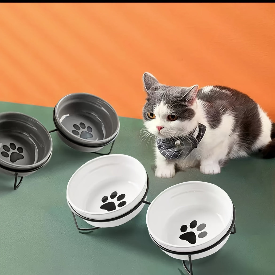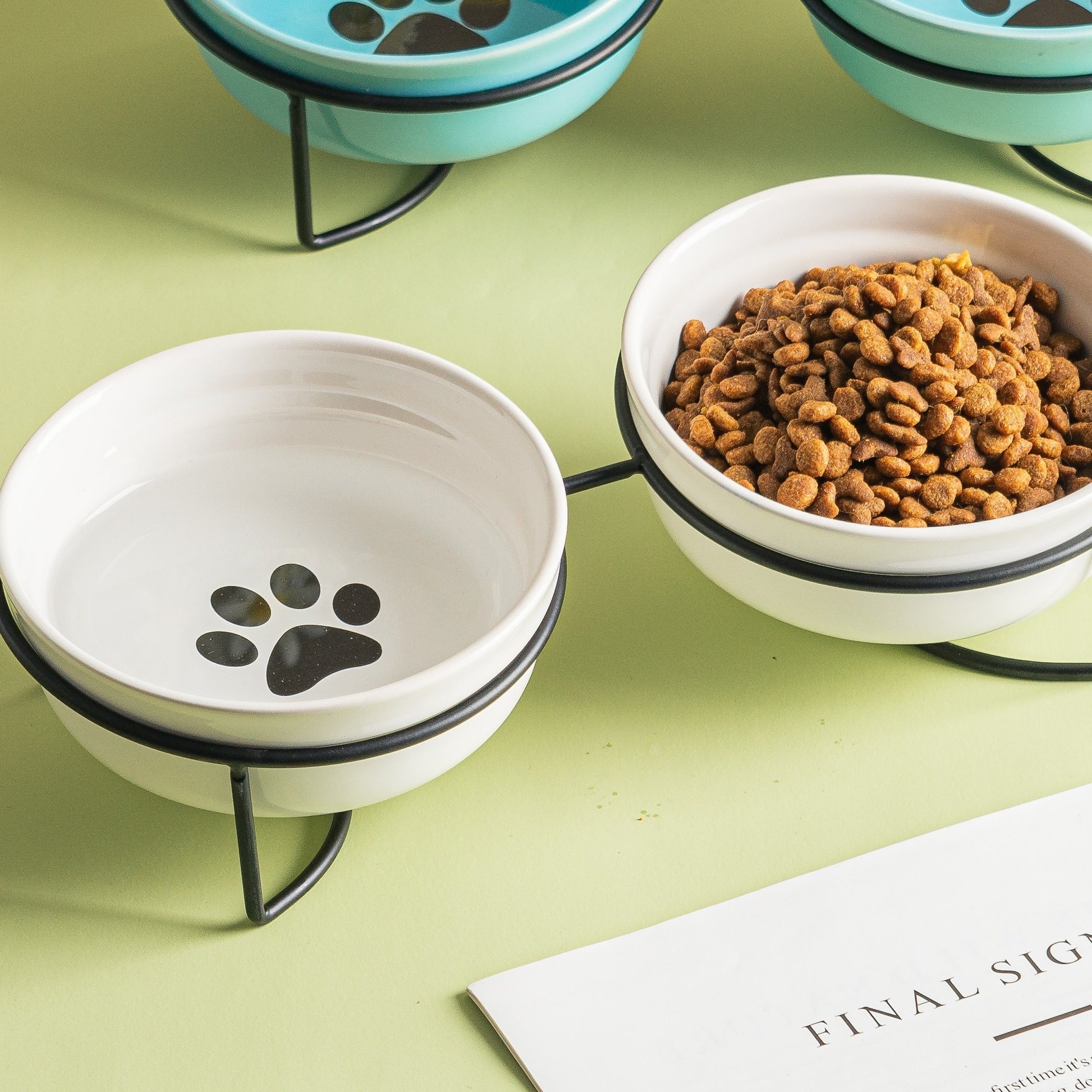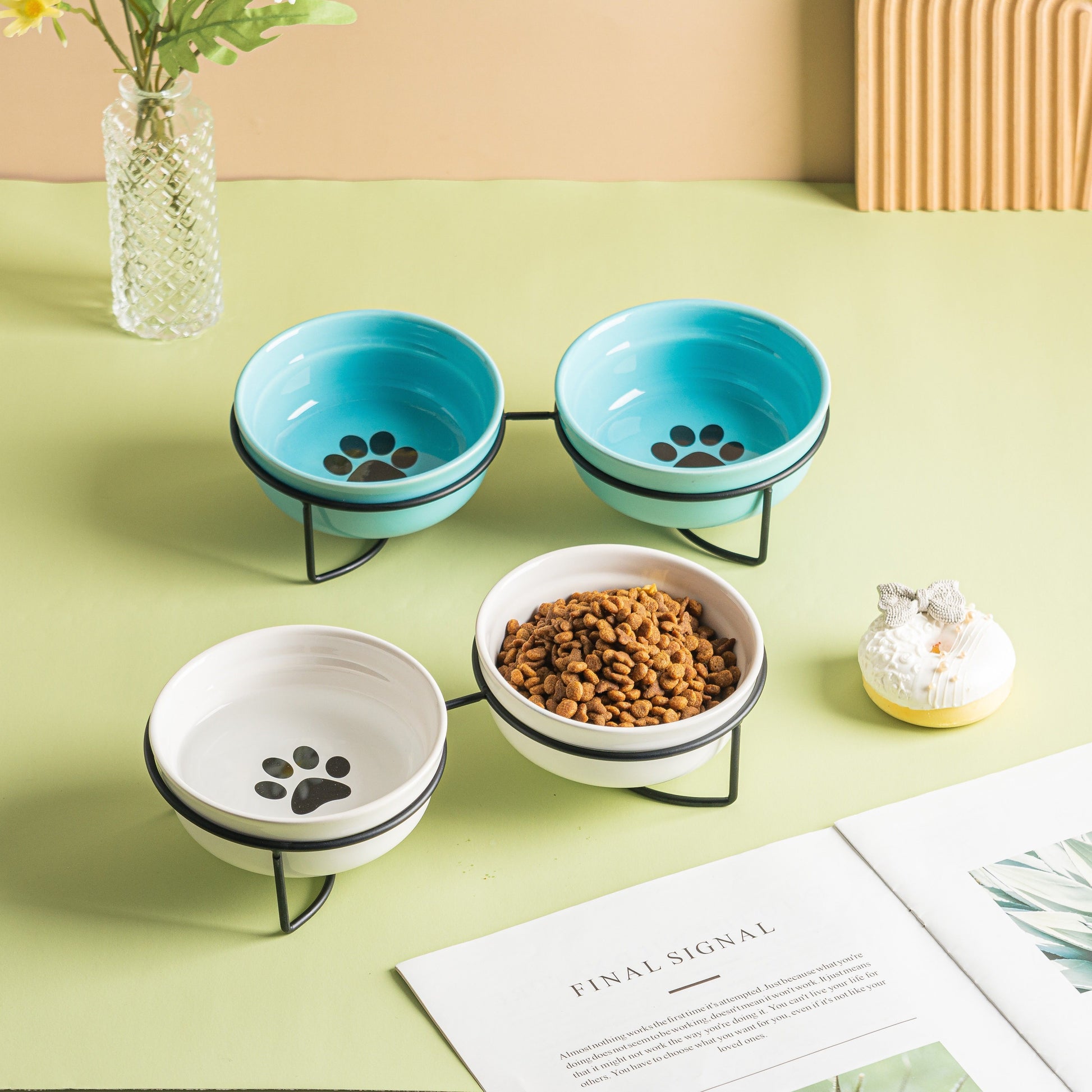 Silikonli qumushli keramika mushuklar uchun idishlar, temir stand bilan 12.19cm balandlikda, ikki tomonlama ovqatlanish idishlari, bo‘ynini himoya qilish