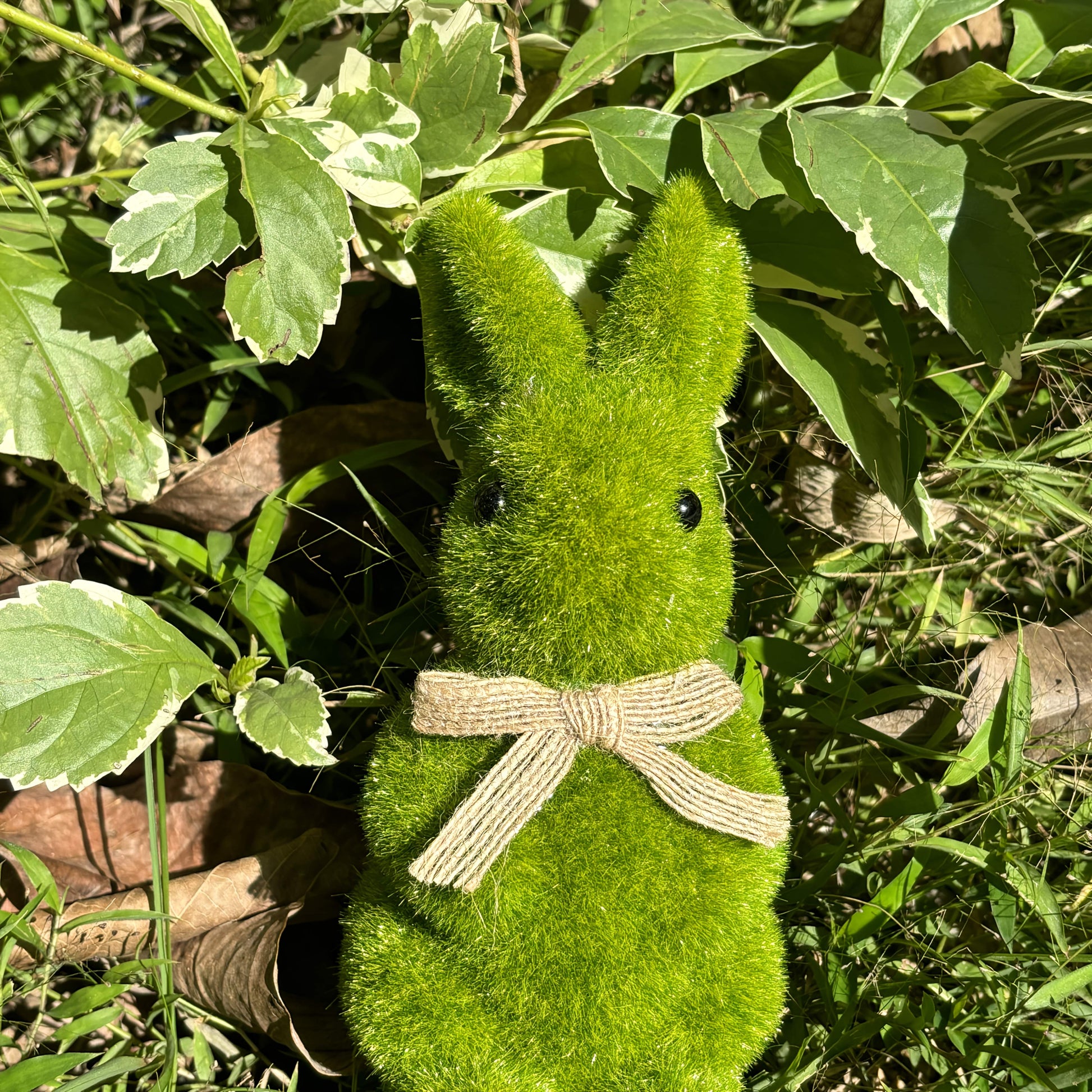 Charming 16.76 sm yashil to‘qilgan quyon haykali, Pasxa va bahor bog‘i bezaklari uchun, lenta aksent bilan. Bayram tadbirlari va uy hovlisi ko‘rinishi uchun mukammal.