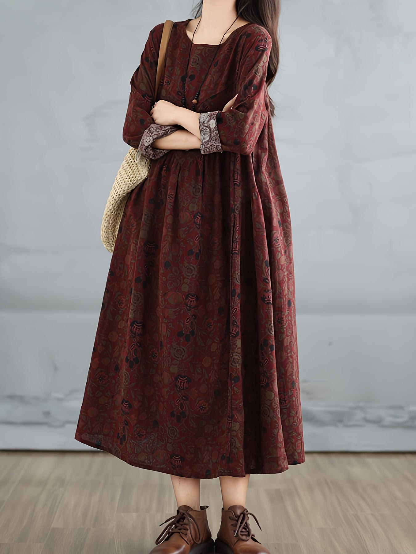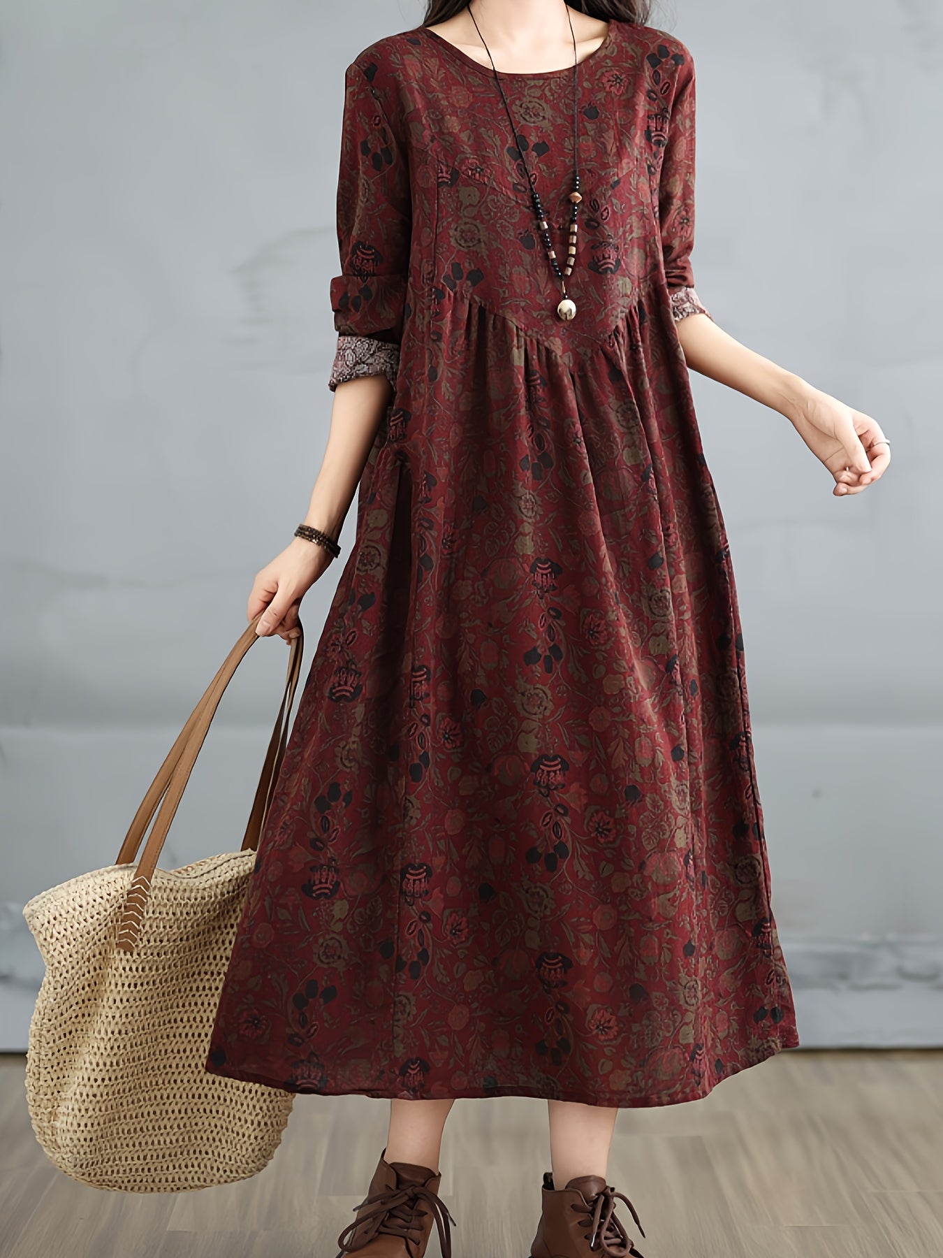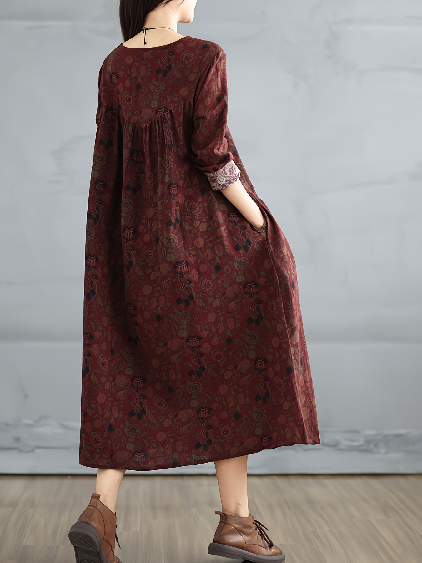 Chic vintage gullar bilan bezatilgan uzun yengli, dumaloq bo'yinli, A-siluetli, cho'ntakli, cho'zilmaydigan mato, ko'cha uslubi, keng kesim, ingichka ko'rinish. Faqat qo'l bilan yoki quruq tozalash.