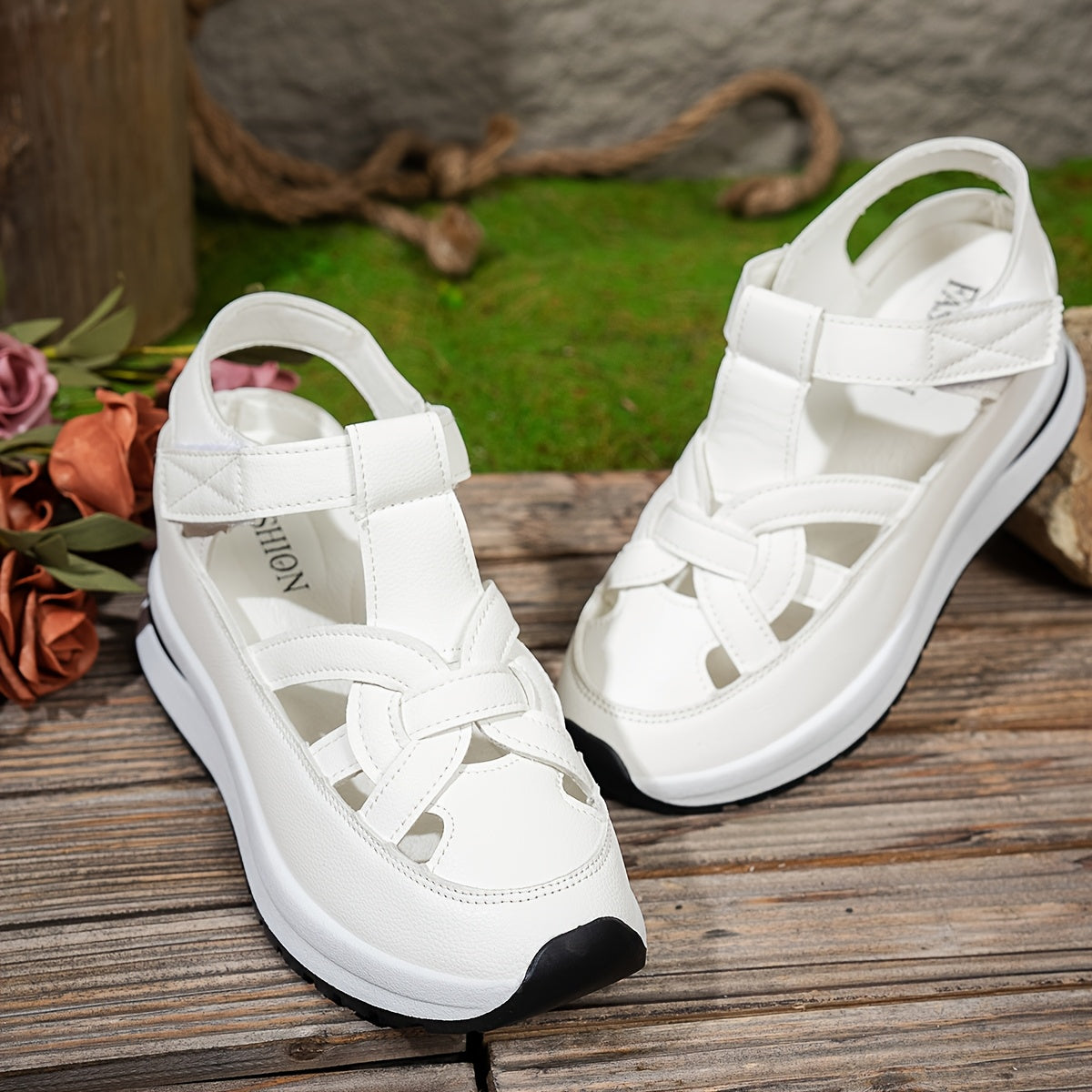 Yoz uchun zamonaviy oq platforma sandallar, qulay qalin taglikli wedge to'pi va oson bog'lash uchun lenta bilan. Yaxshi ushlash uchun sun'iy qoplama va kauchuk taglik mavjud.
