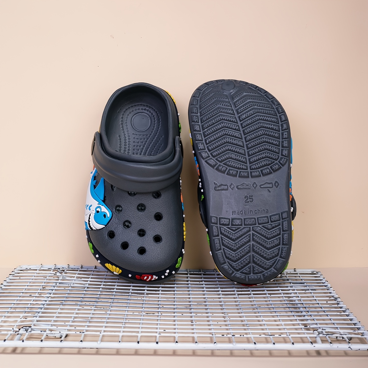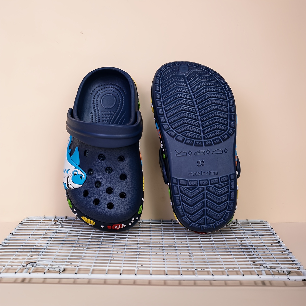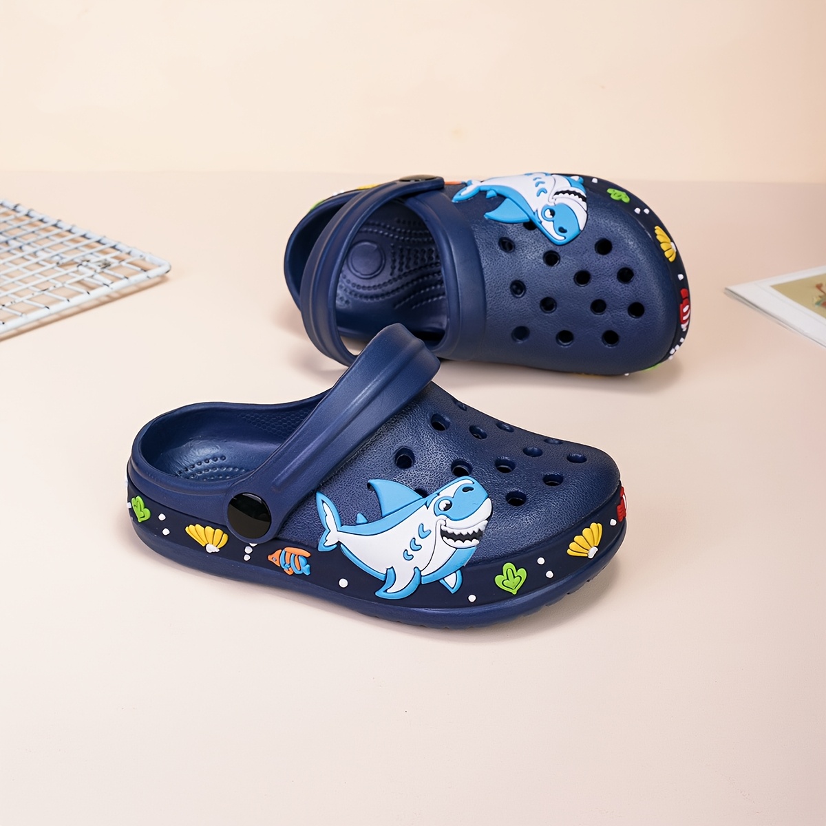 Bolalar uchun yengil akula klopkalari rang-barang baliq va o'simliklar dizayni bilan. Yoz va plyaj kiyimlari uchun mukammal. Mustahkam va o'yinchoq dizayn.