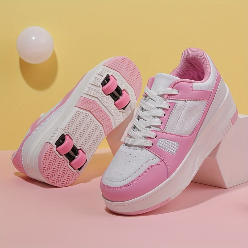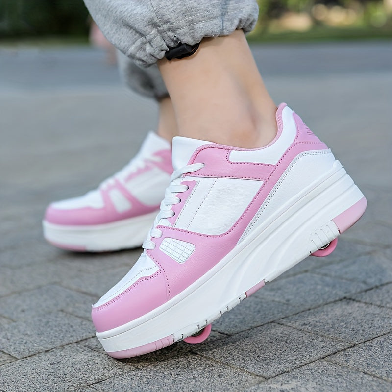 Bolalar uchun pushti va oq engil rulonli skeytlar, olib tashlanadigan g'ildiraklar va lentalar bilan dizayni