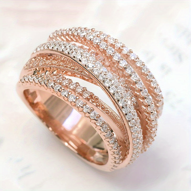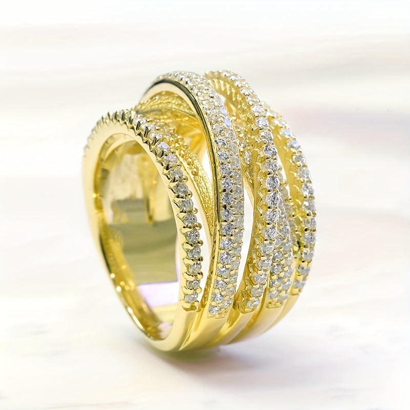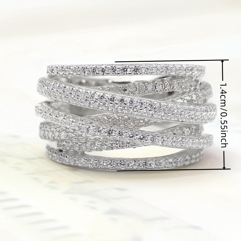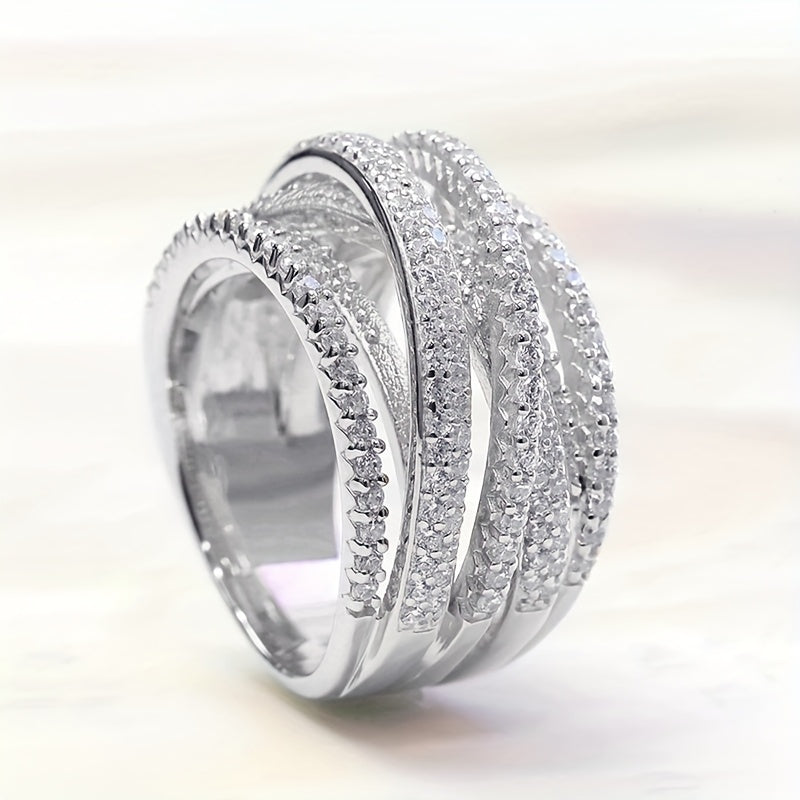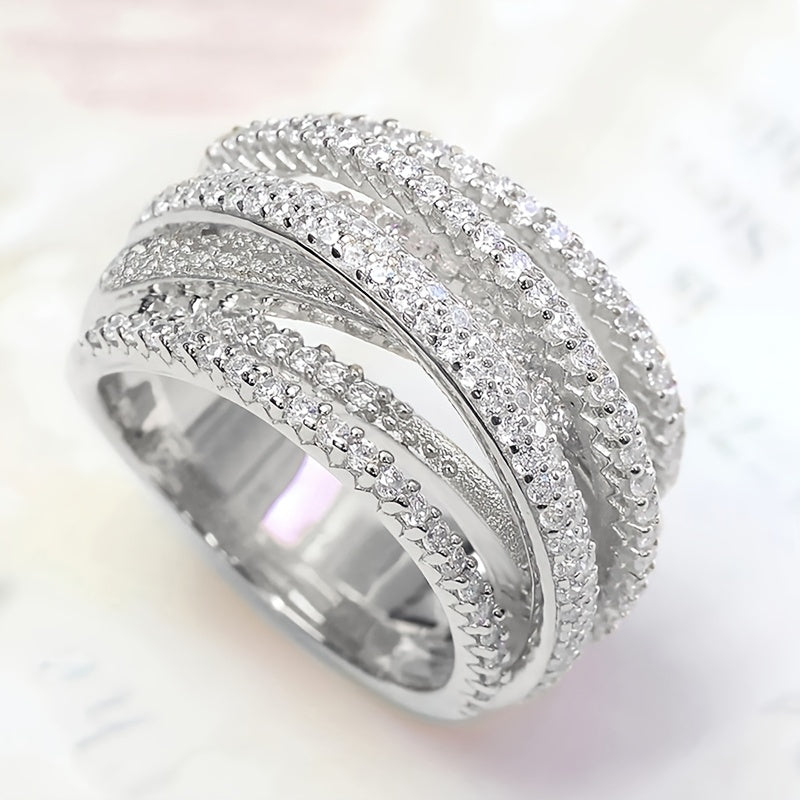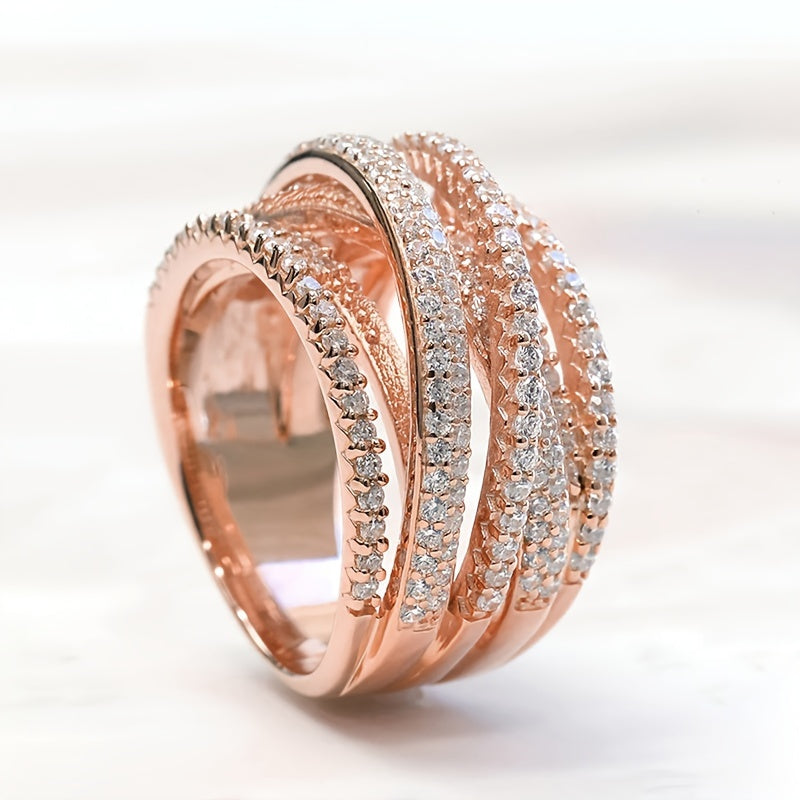 Ushbu zamonaviy halqa uzukning o'zingizga yoqadigan rangini tanlang, u porlaydigan zirconia bilan qoplangan, kumush, oltin yoki pushti oltinda o'zaro bog'langan dizayni bilan.