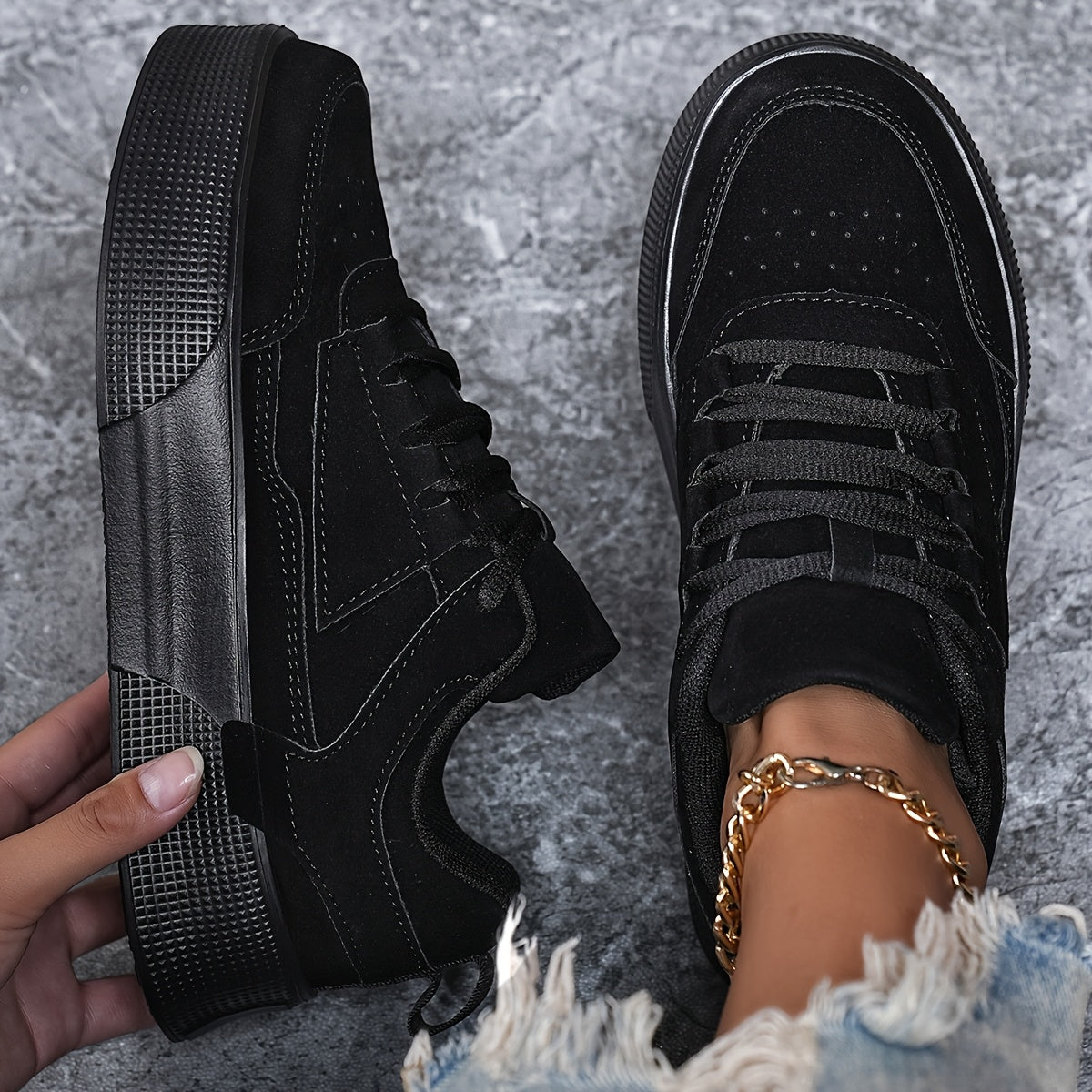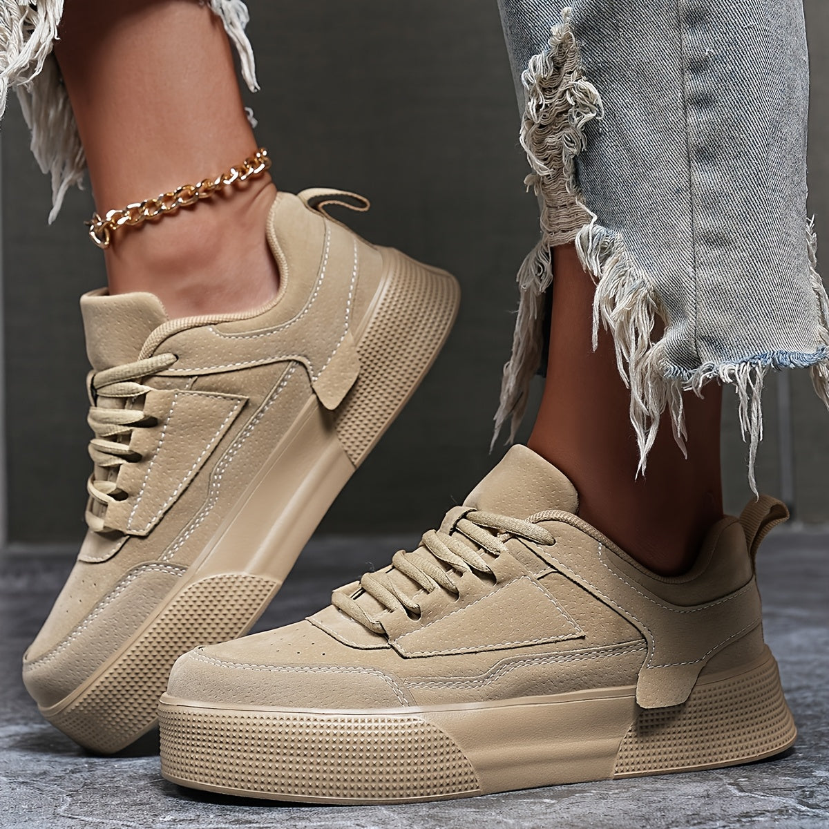 Ayollar uchun klassik bog'ichli pastki skateboard krossovkalari, bir xil rangli blok dizayni va balandlikni oshirish xususiyati bilan. PU yuqori qismi, mato ichki qismi va EVA tagligi bilan barcha mavsumlarda qulaylik uchun ishlab chiqarilgan.