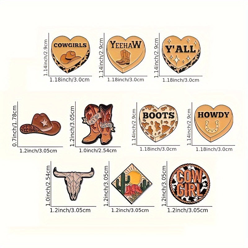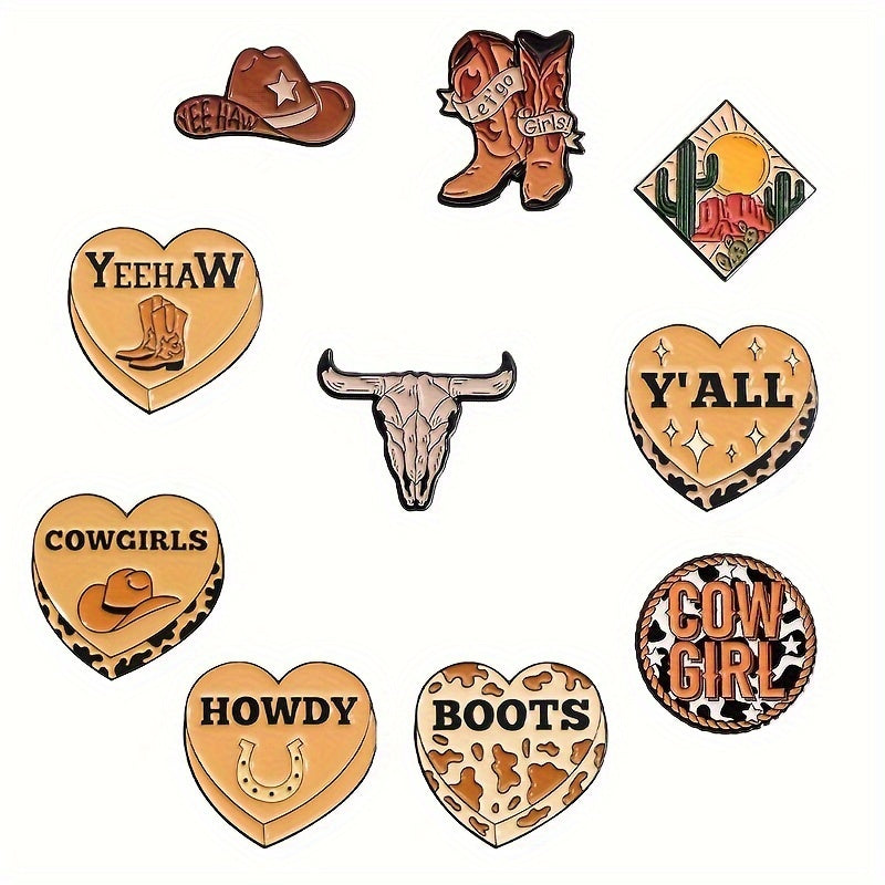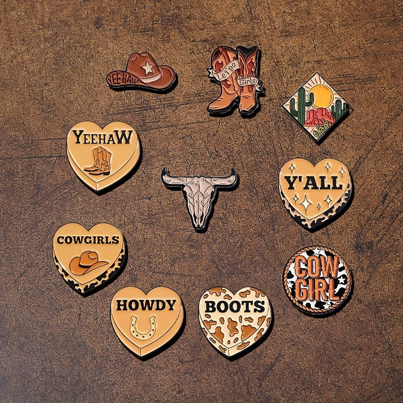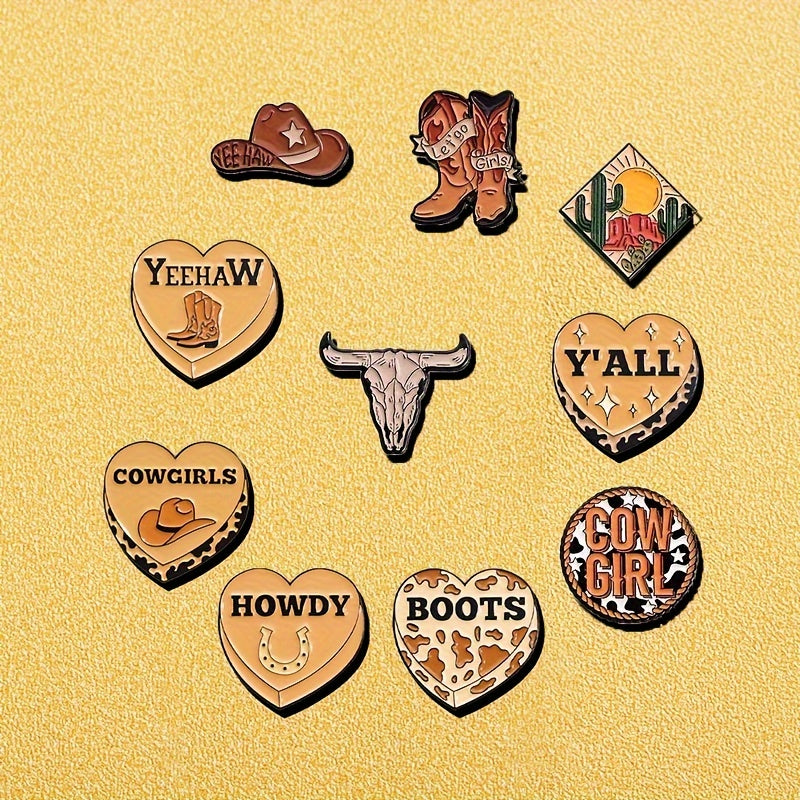 10 ta Gʻarbiy Kovboy emal pinlar to'plami, Qo'ylar bilan Oyoq kiyimlari va Yeehaw ramzlari bilan, Sumkalar, shapka va shartlar uchun