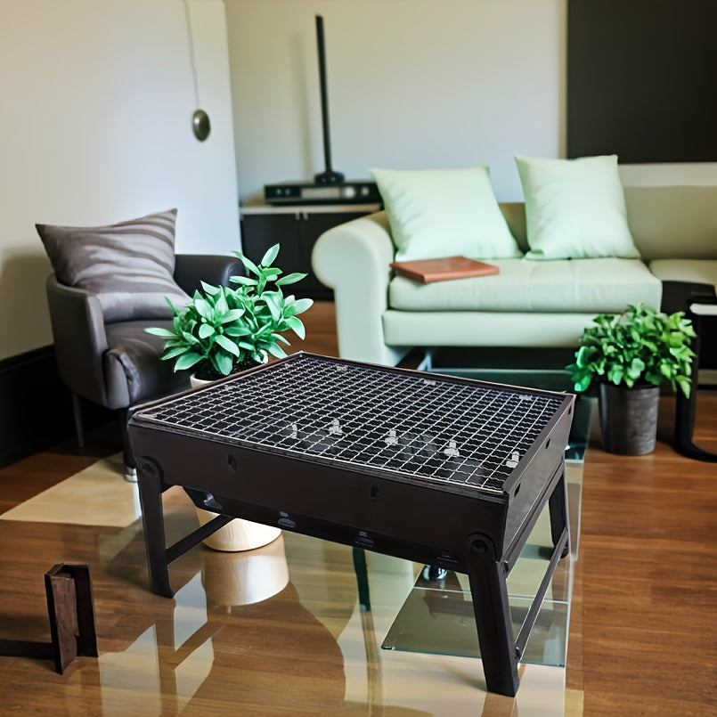 Tashqarida foydalanish uchun mustahkam oyoqlari va kul panasi bilan kichik va yengil rostlangan po'latdan yasalgan uglerod grill.
