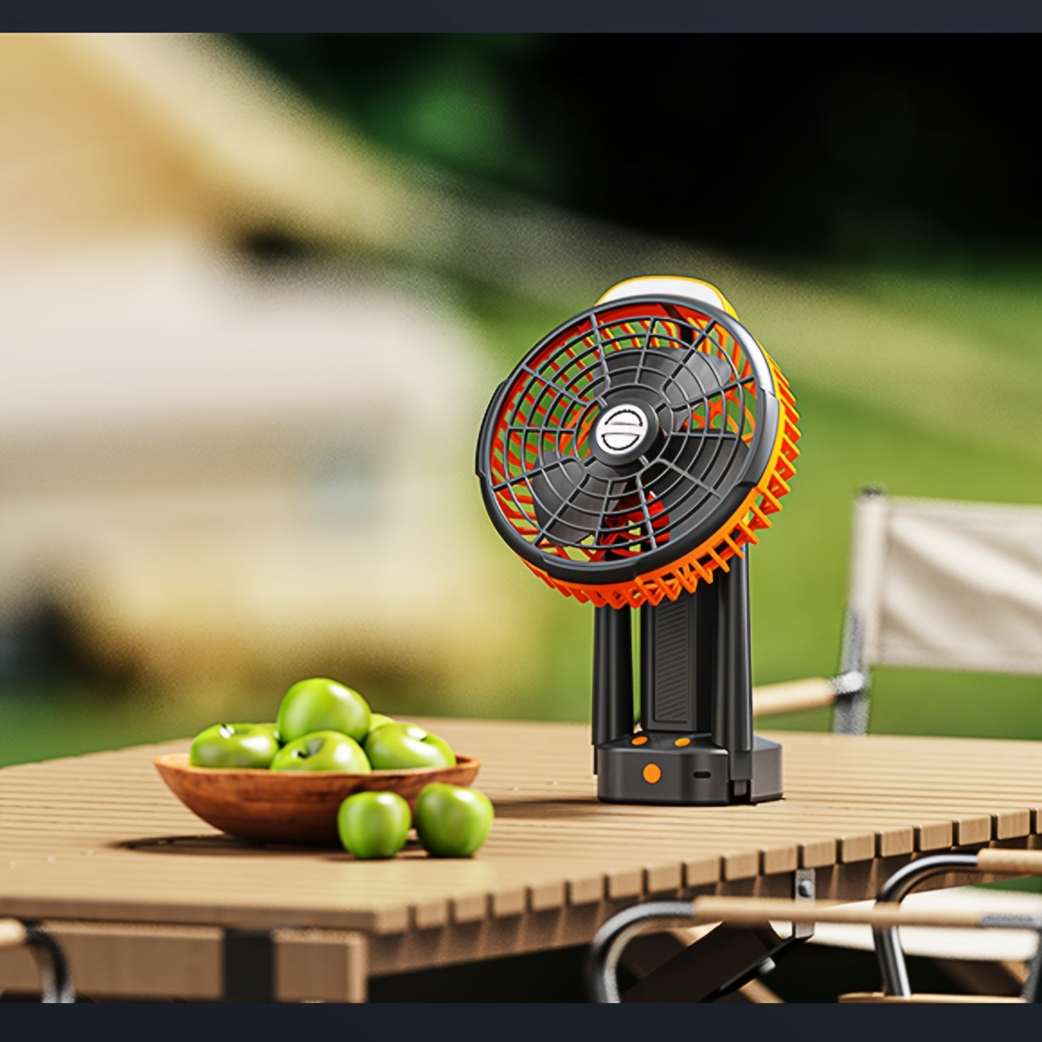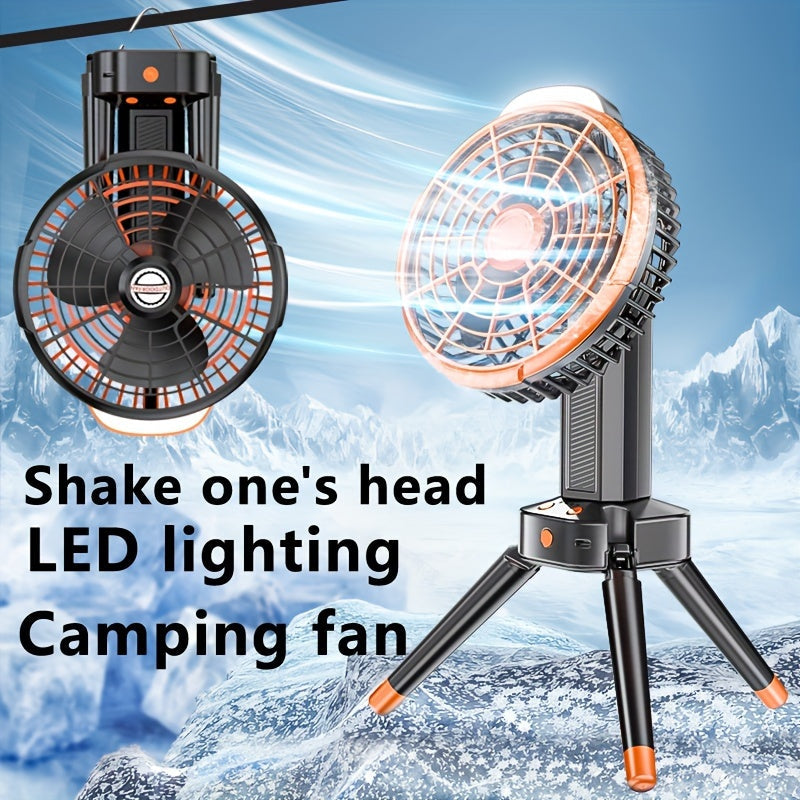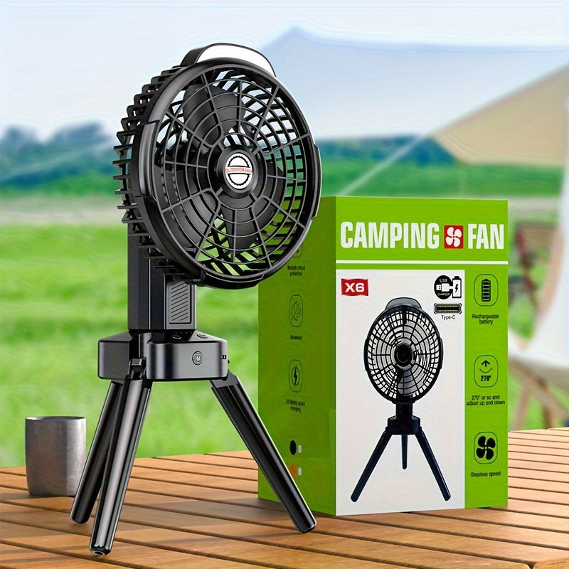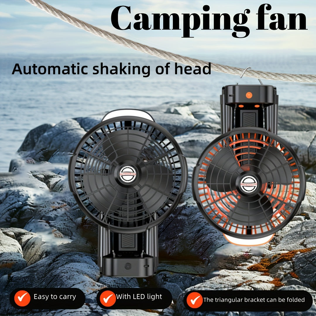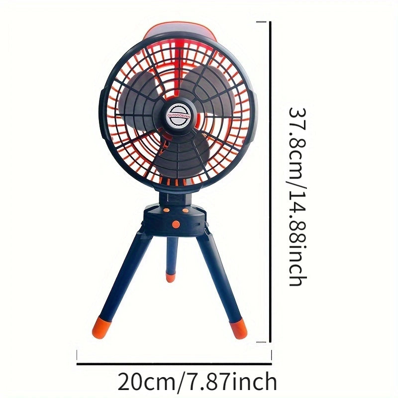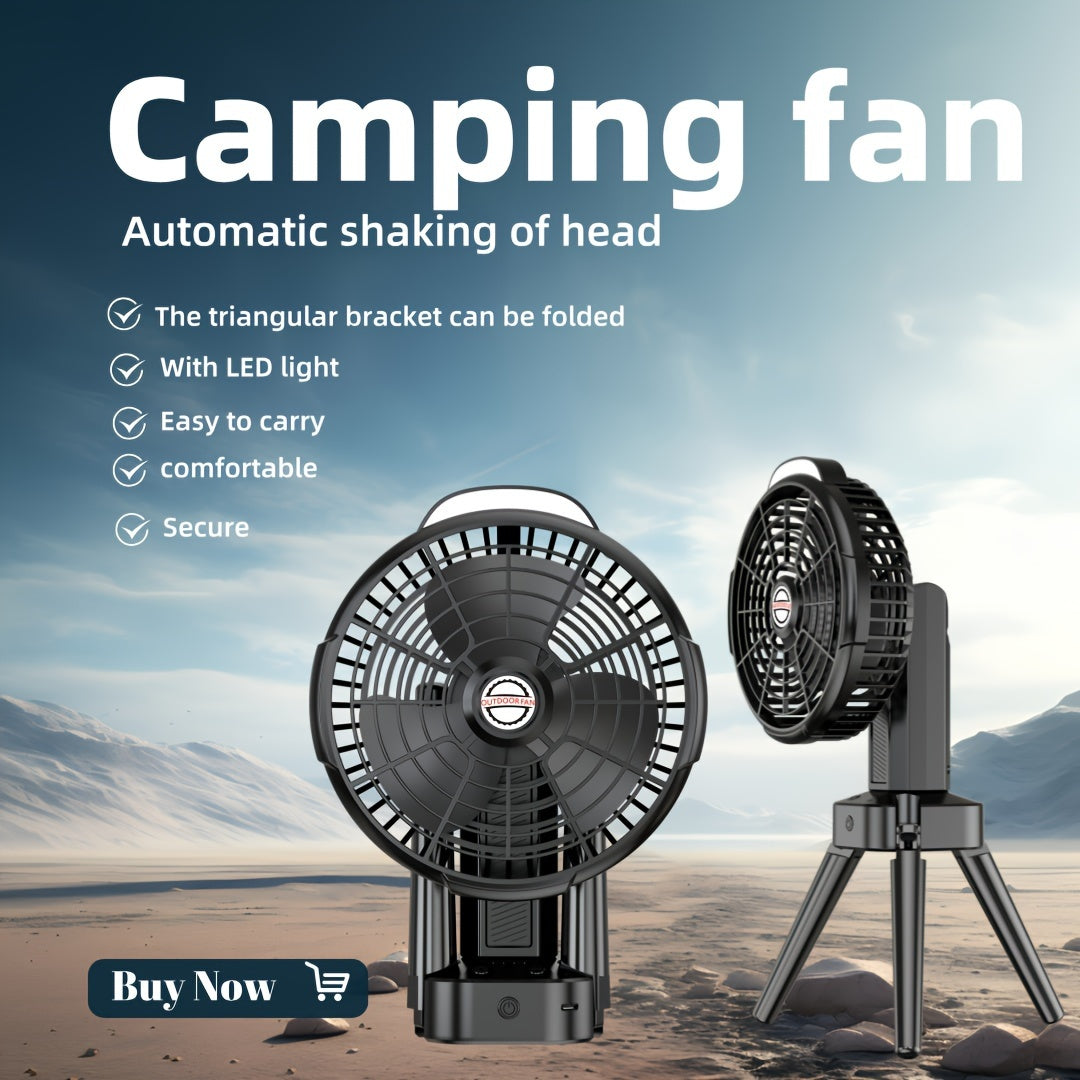 Kompakt va jim portativ lager ventilyatori, avtomatik osilash bilan, USB orqali zaryadlanadigan va uyda, ofisda yoki ochiq havoda foydalanish uchun o'rnatilgan batareyaga ega.