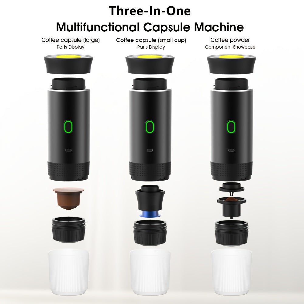 Sayohat, lagerda va avtomobilda foydalanish uchun ixcham elektr espresso mashinasi, Type-C bilan o'z-o'zidan isitiladi, RV, piyoda sayohat va ofisda foydalanish uchun yerda qahva va kapsulalar bilan mos keladi. Issiq va sovuq qahva tayyorlash mumkin.