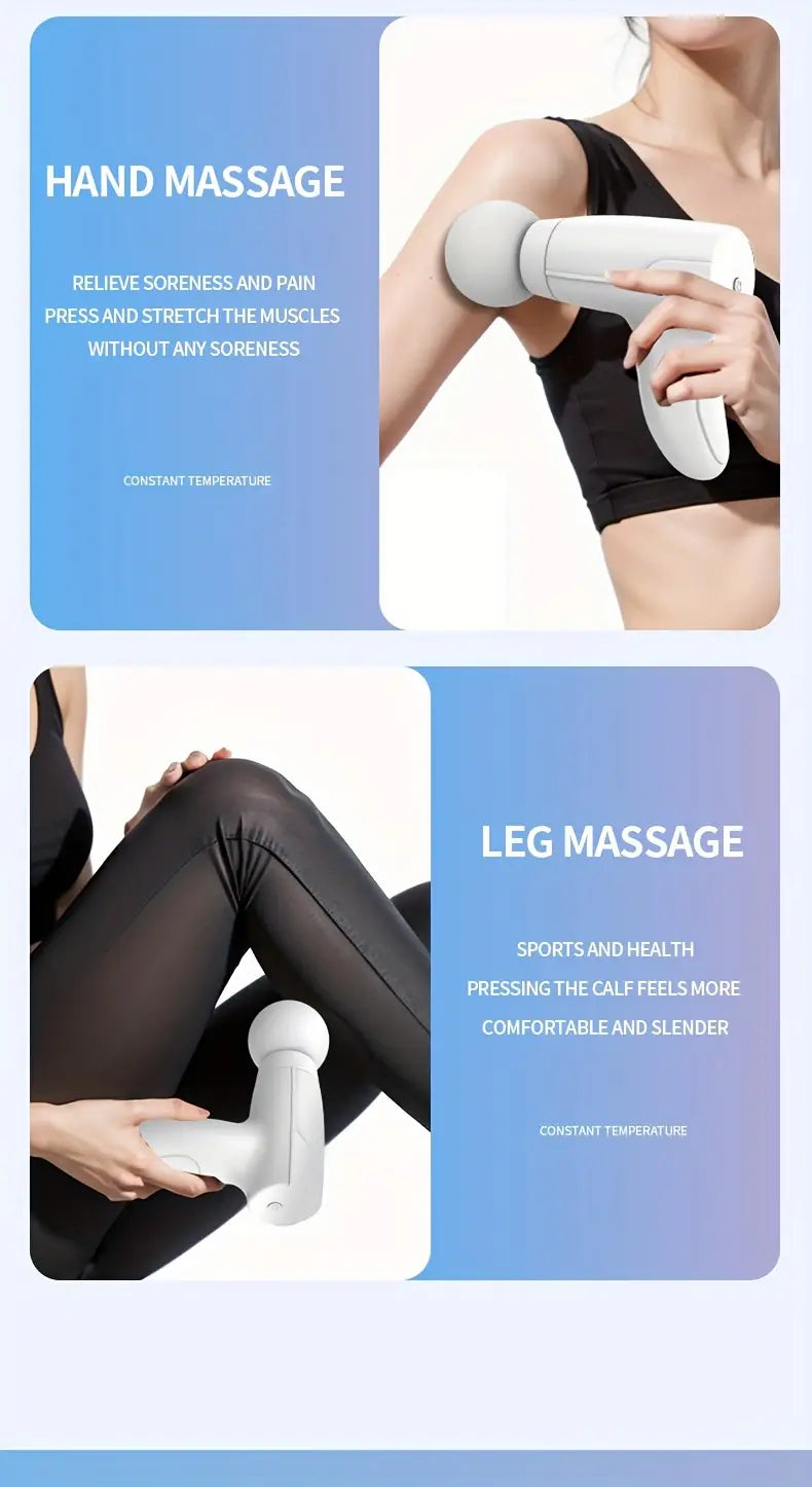 Kichik Mini Fascia Qurollari, portativ, jim ishlash, uzoq muddatli batareya va mushak og'rig'ini kamaytirish uchun mo'ljallangan. Sport va ofisda foydalanish uchun mukammal, Oq, Yashil, Pushti ranglarda mavjud.