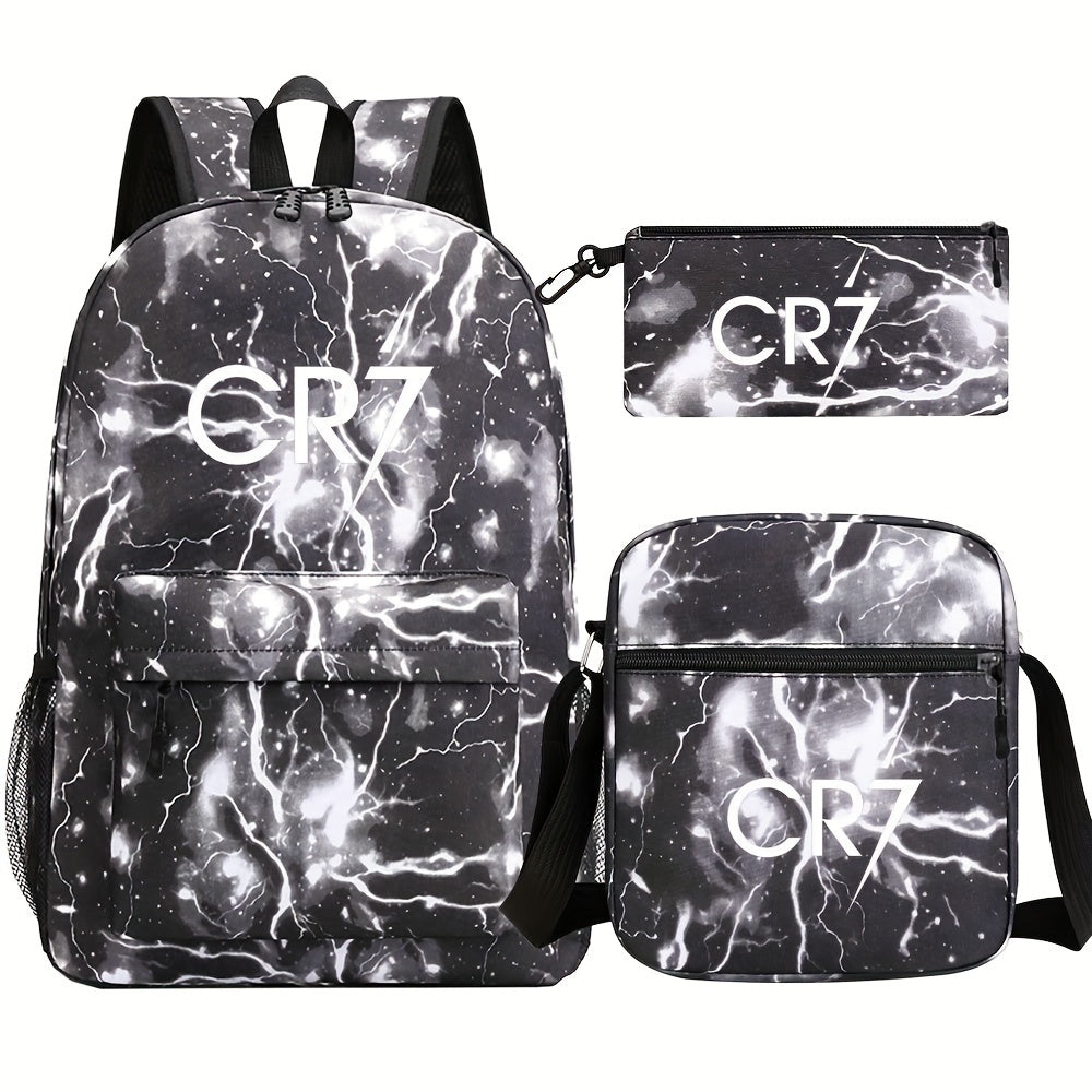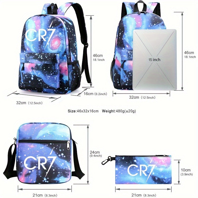 CR7 ilhomlangan erkaklar ruksak to'plami 3 ta qismdan iborat: ruksak, kesma sumka va qalam qutisi. Yengil va keng, maktab yoki ishga borish uchun mukammal. Mustahkam polyesterdan tayyorlangan, qo'l