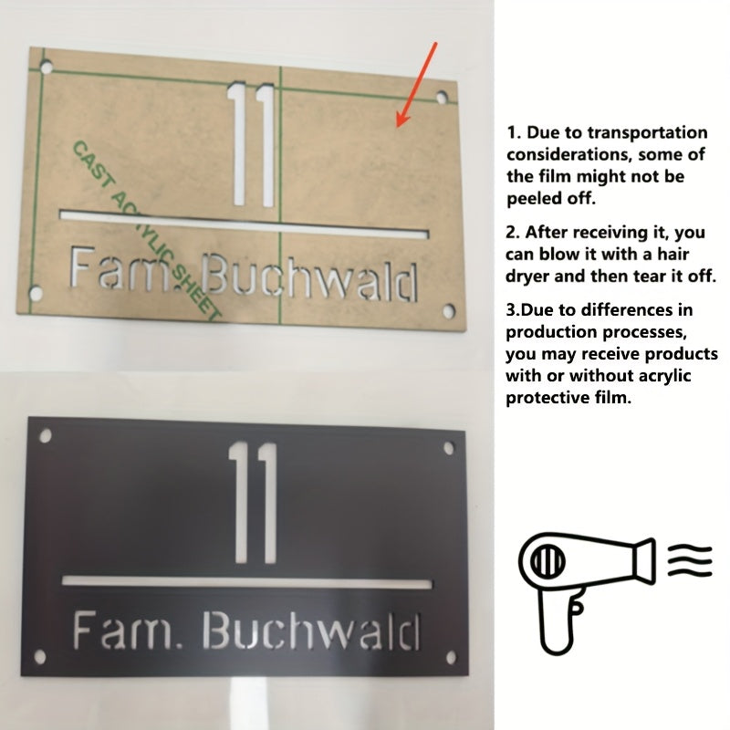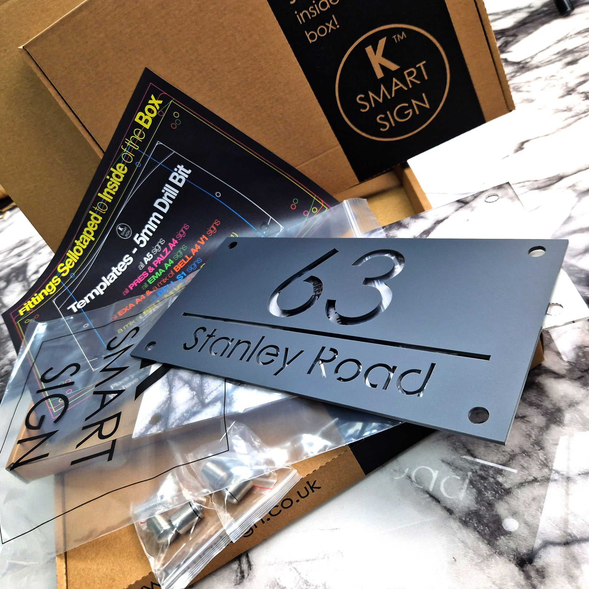 Matte kulrang va kumush oynali qoplamaga ega lazer kesilgan akrildan tayyorlangan maxsus Britaniya uy raqami belgilari.