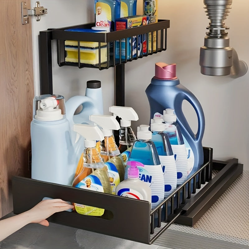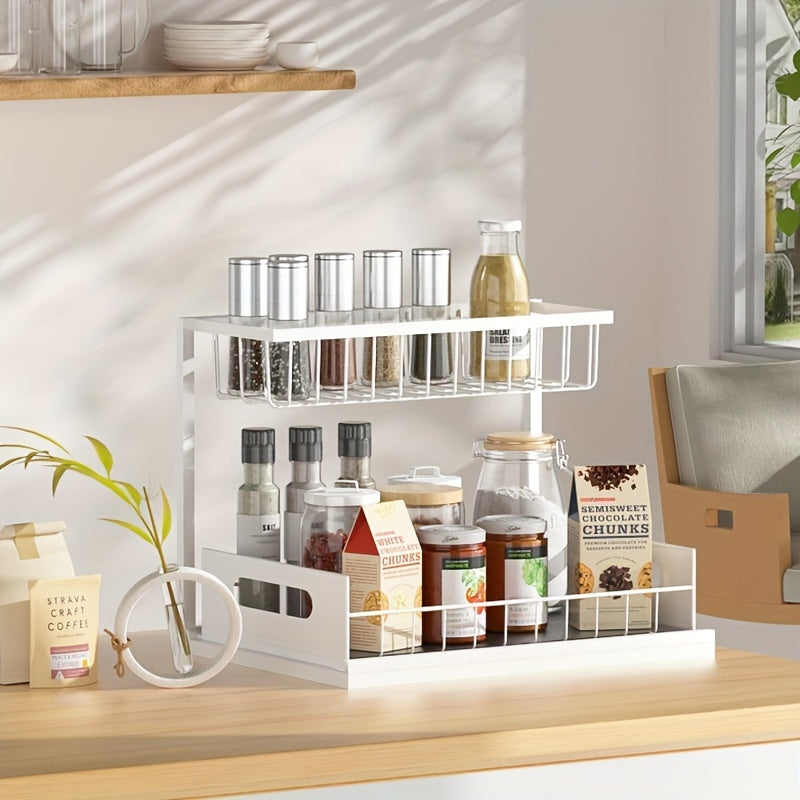 "Ikkita qatlamli tortib olinadigan lavaboda tashkilotchisi, karbon po'latdan yasalgan saqlash javoni oshxona va hammom uchun - condimentlar, ziravorlar, dori-darmonlar va kosmetikalar uchun ko'p funksiyali tokcha - Qora/Oq rangda mavjud"