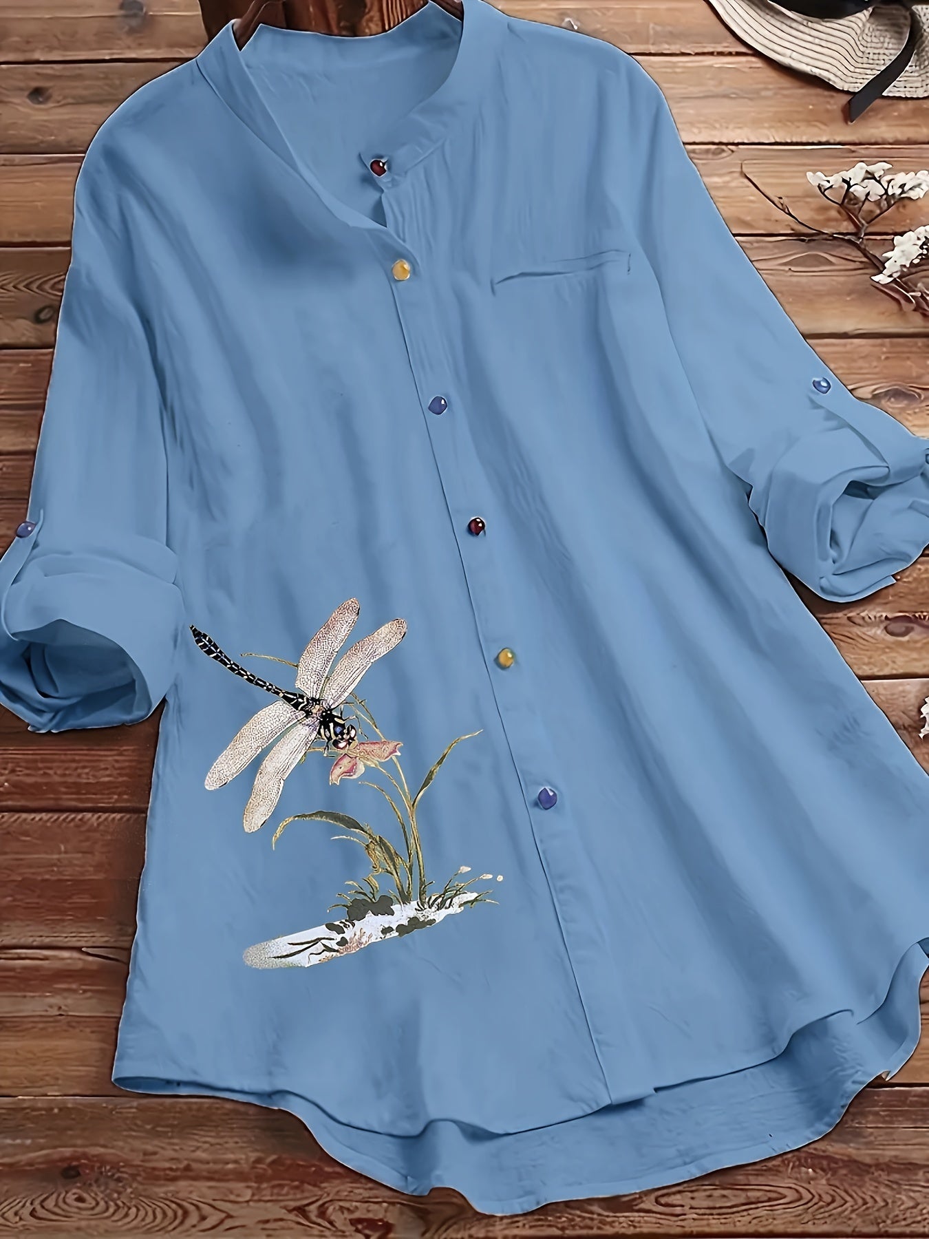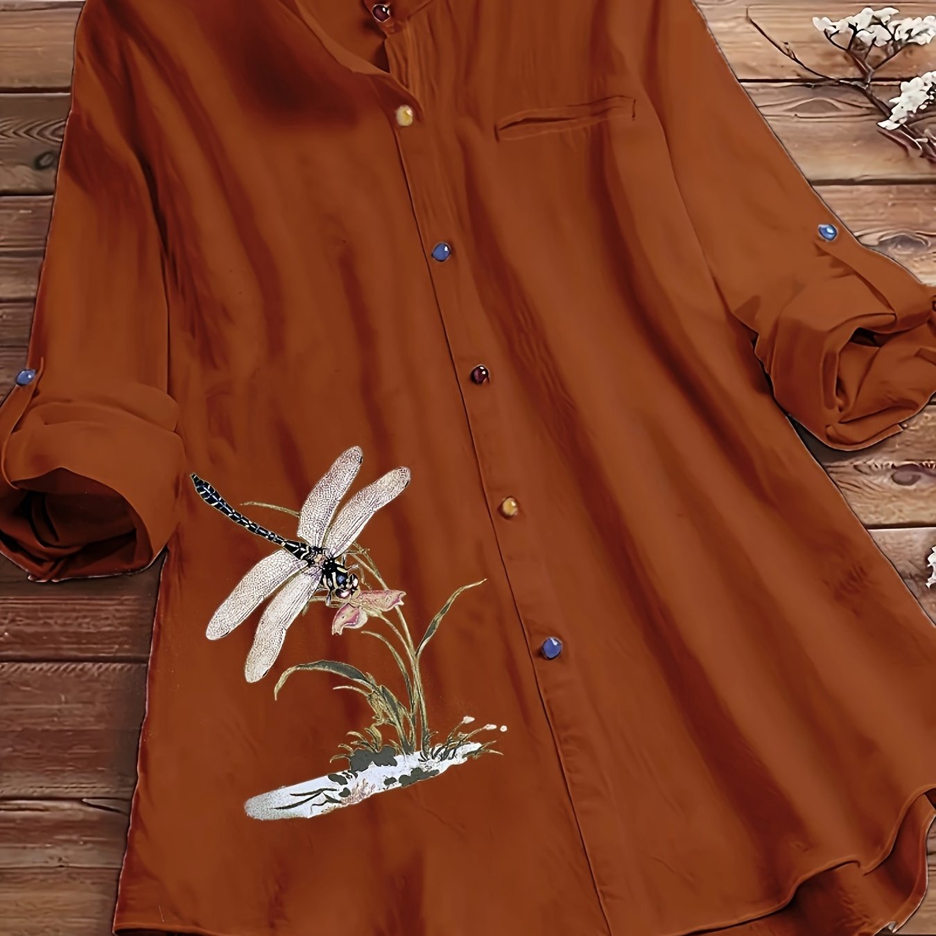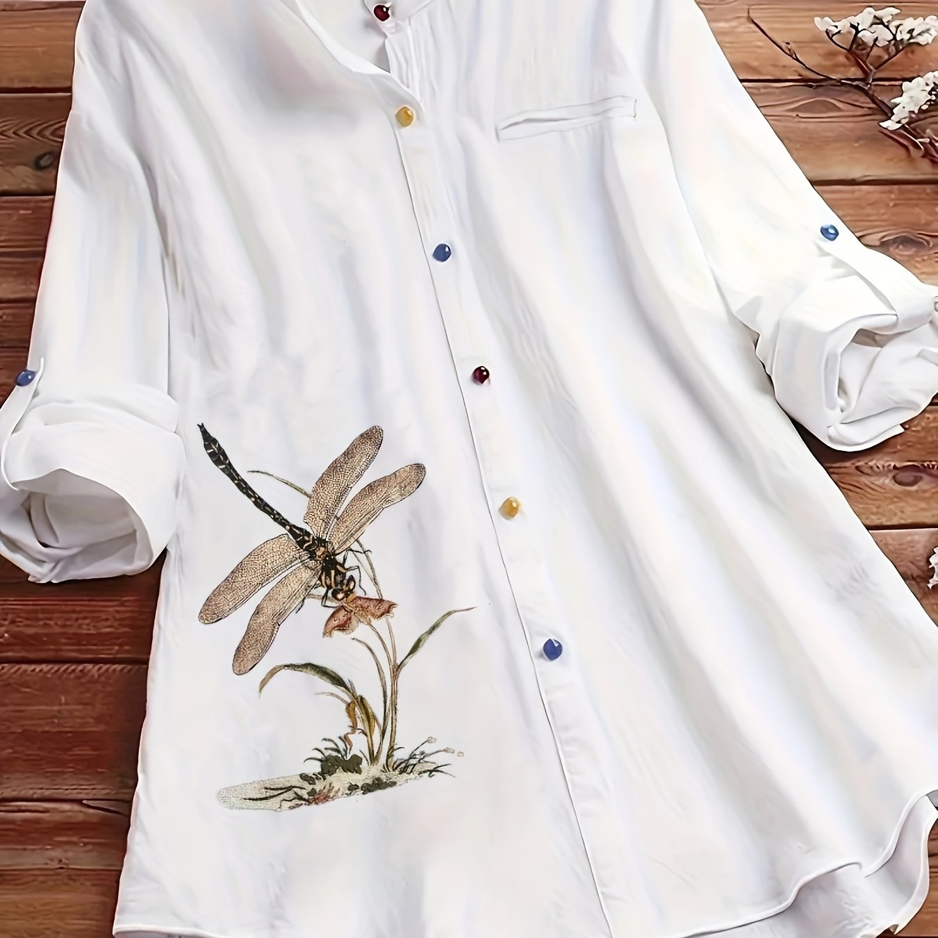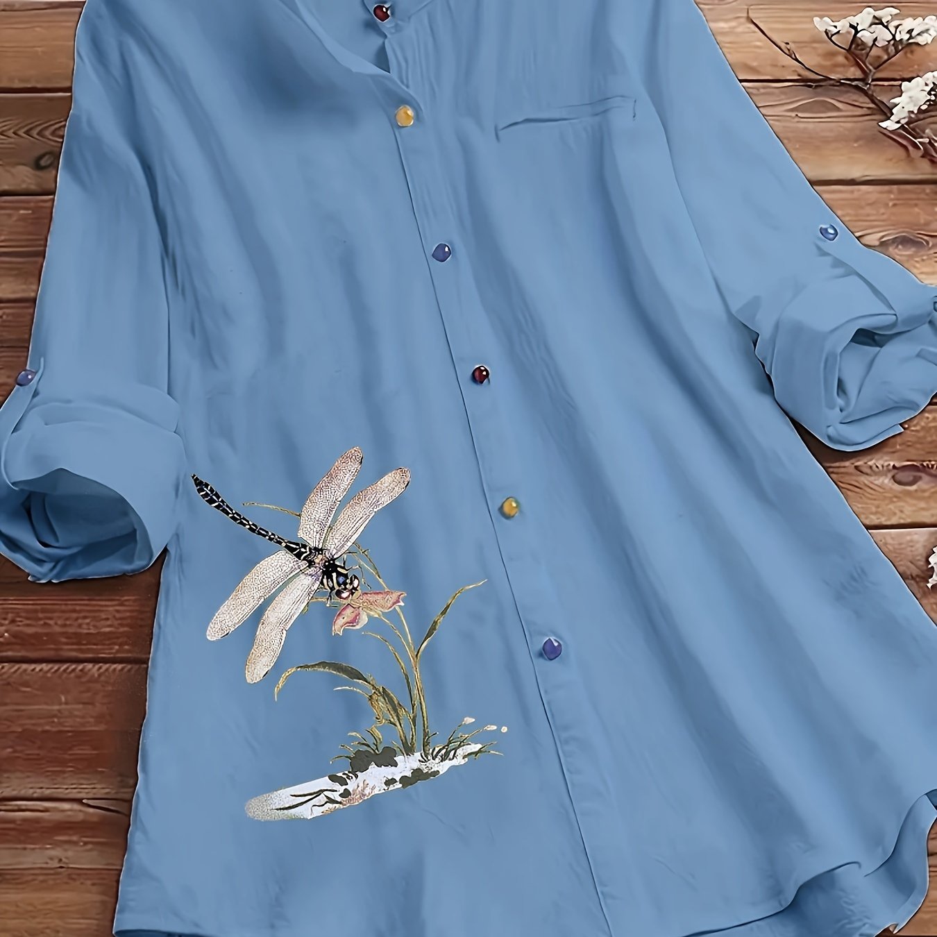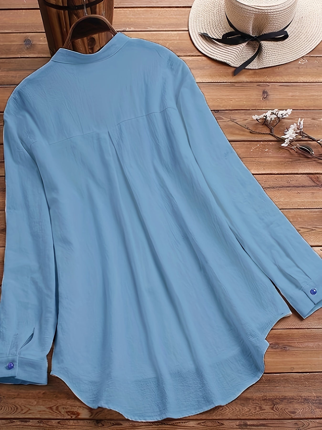 Katta o'lchamdagi ayollar uchun tugmachali old qismi va uzun yenglari bo'lgan mayda chivin naqshli bluzka.