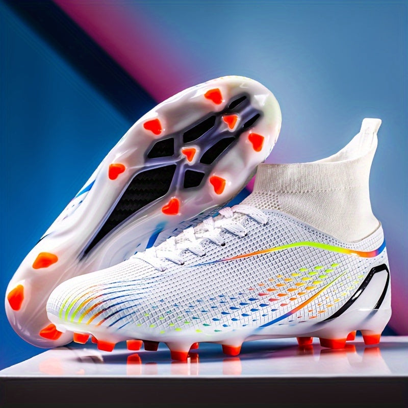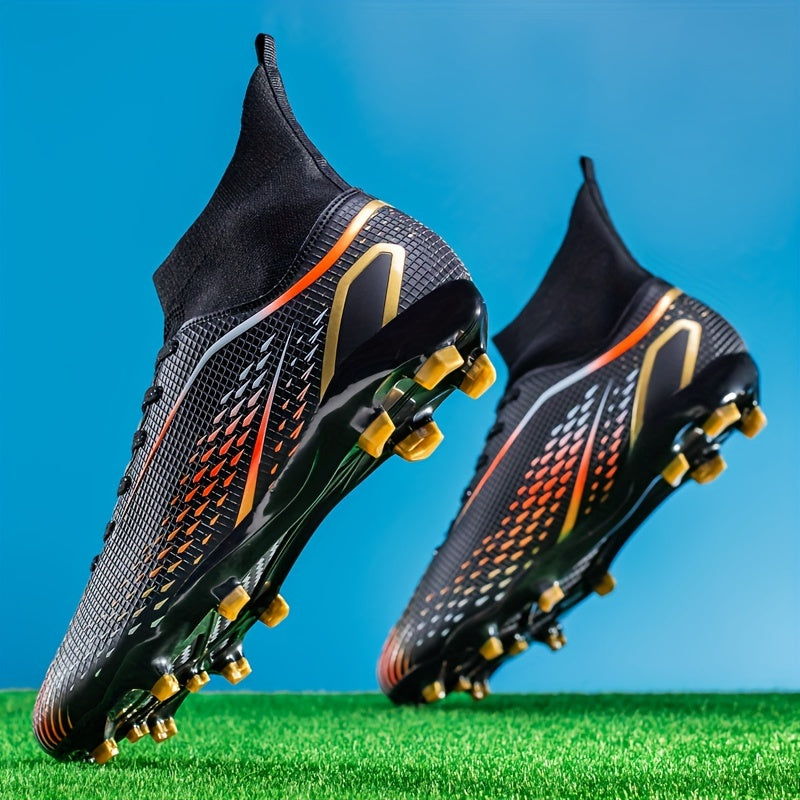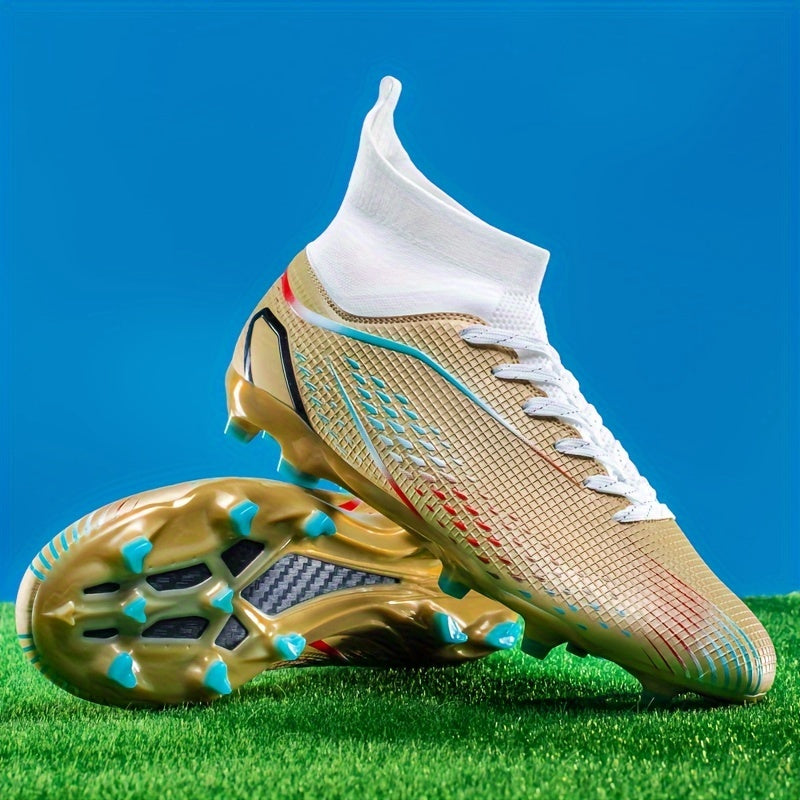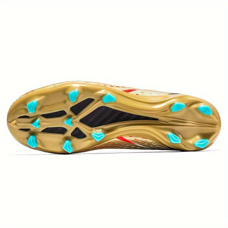 Mustahkam turkuaz va apelsin rangidagi futbol to'pi uchun poyabzal, yuqori ushlash uchun TPU poyalar, nafas oladigan astar va EVA yostiqchasi bilan. O'g'il va qizlar uchun mashg'ulotlar va o'yinlar, raqobatbardosh futbol uchun mukammal.