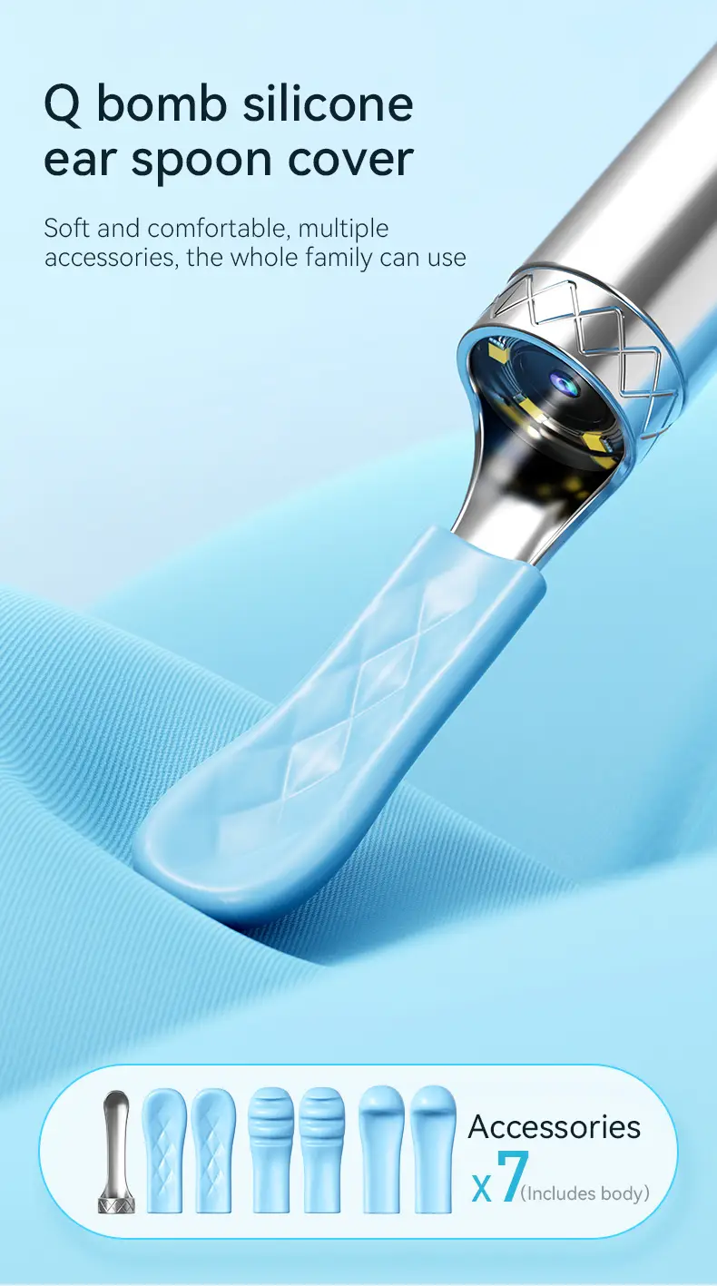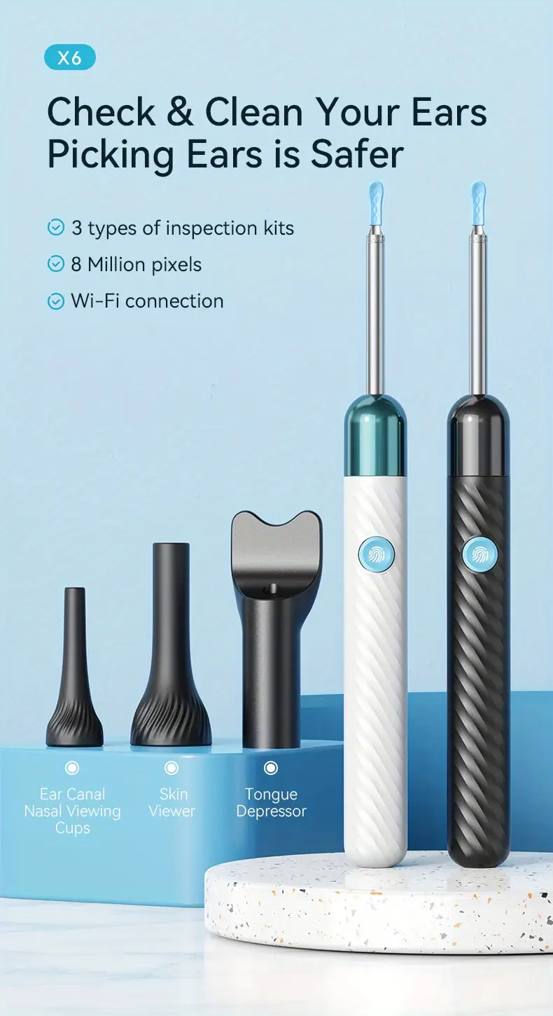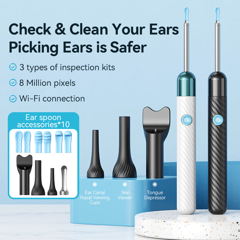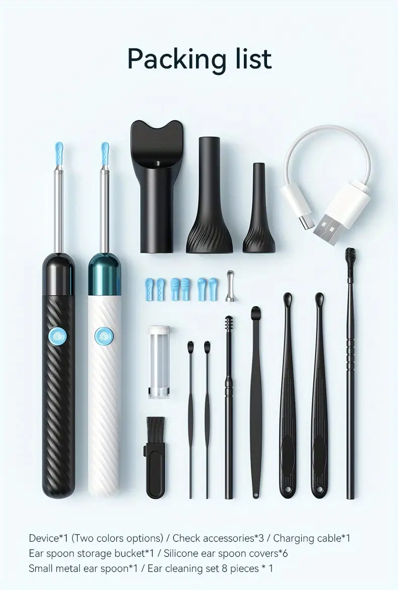 Quloq shilliqni olib tashlash to'plami 6 ta quloq qoshiq qopqog'ini va kamera va yoritgich bilan jihozlangan simsiz asbobni o'z ichiga oladi. iOS va Android bilan mos keladi. Lopata shaklidagi quloq kanali tozalagichni o'z ichiga oladi.