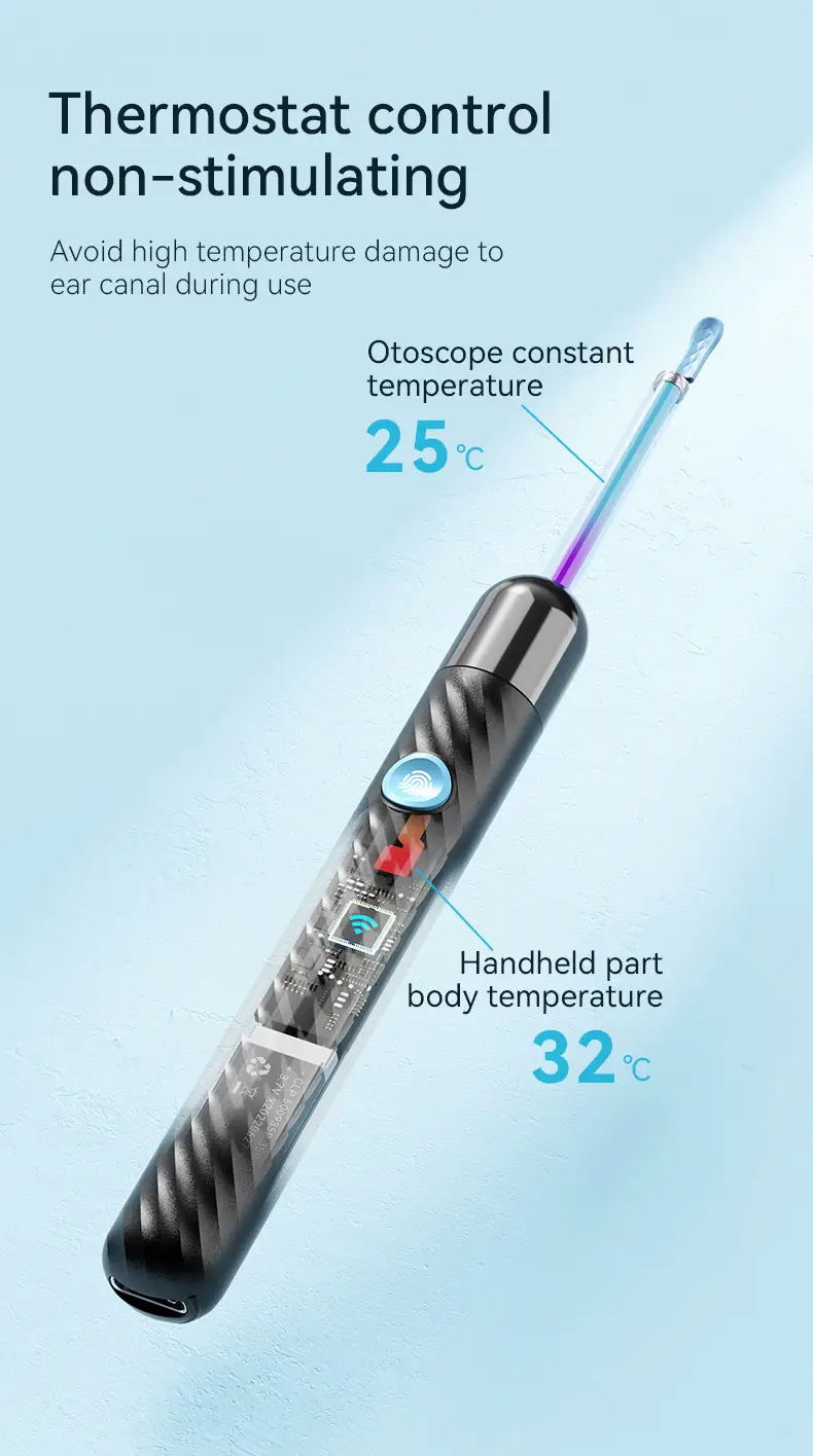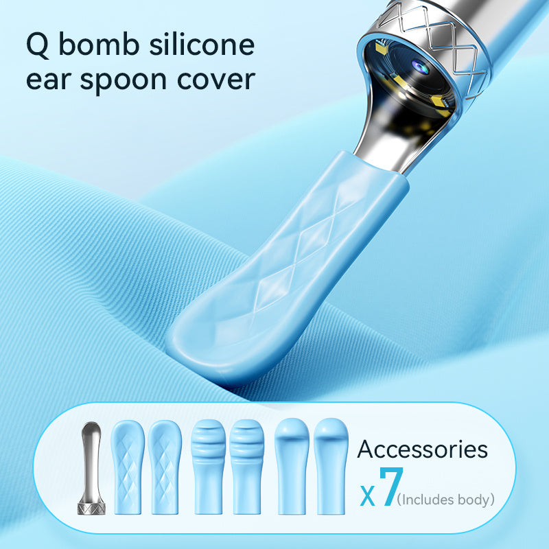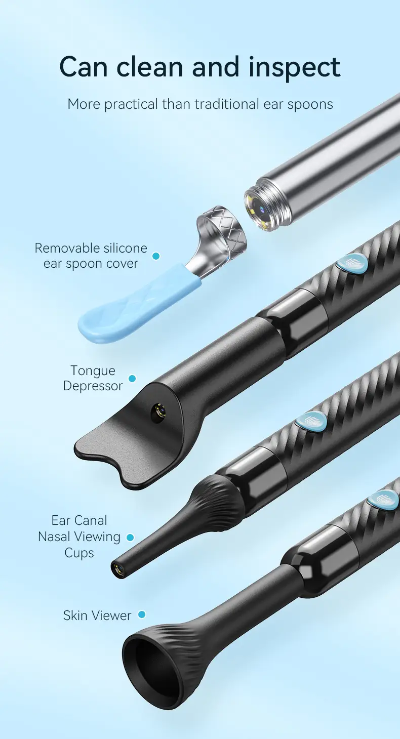 Quloq shilliqni olib tashlash to'plami 6 ta quloq qoshiq qopqog'ini va kamera va yoritgich bilan jihozlangan simsiz asbobni o'z ichiga oladi. iOS va Android bilan mos keladi. Lopata shaklidagi quloq kanali tozalagichni o'z ichiga oladi.