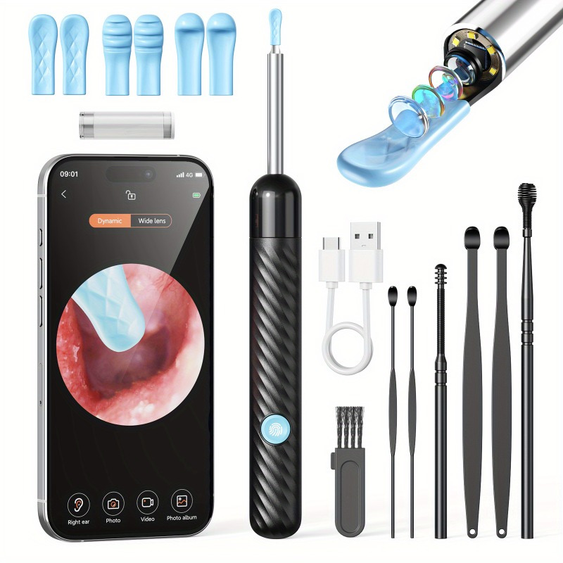 6 ta quloq qoshiq qopqog'i bilan quloq qopqog'ini olib tashlash to'plami. Kamerali va yoritgichli yetti qismli simsiz quloq qopqog'ini olib tashlash asbobi. iOS va Android uchun silikon qoplama aksessuarlari. Simsiz WiFi zaryadlanadigan quloq.