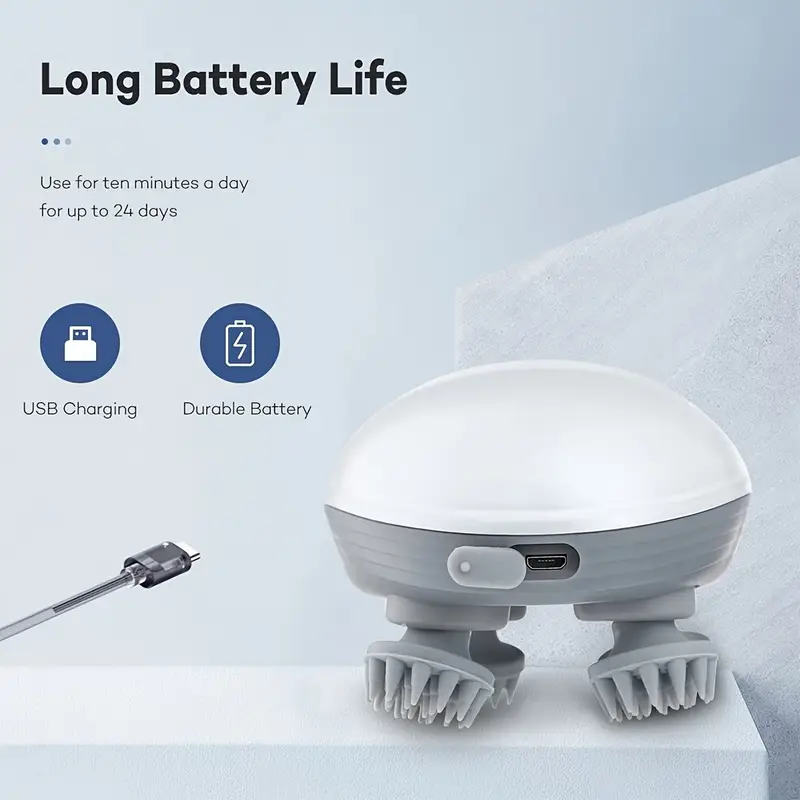 USB orqali zaryadlanadigan xususiyatlarga ega bo'lgan dam olish va uyqu yordamchisi sifatida elektr bosh massajchisi. Bosh terisi va miya massaji uchun ideal, hayvonlar uchun mos. Mukammal ta'til sovg'asi.