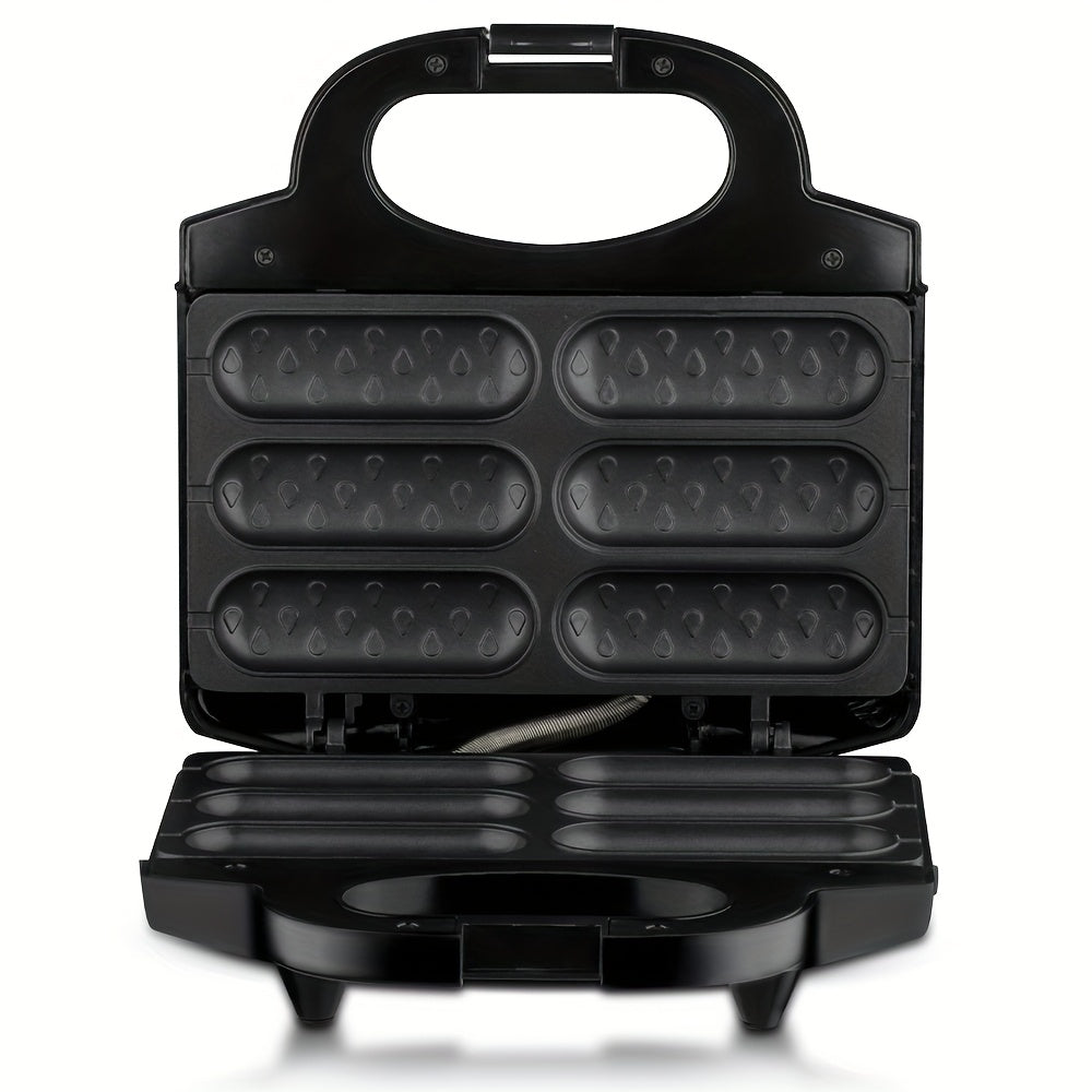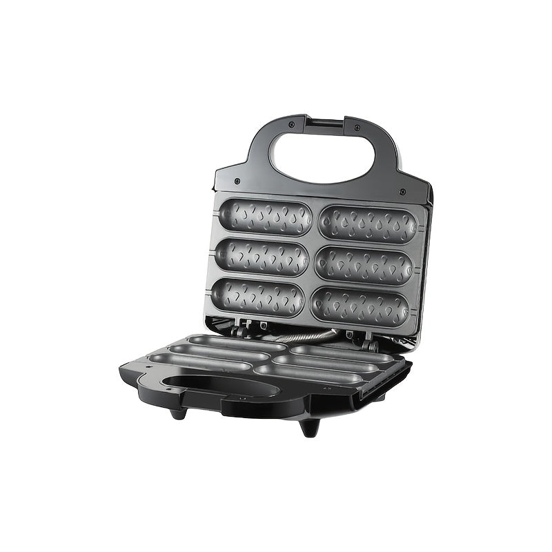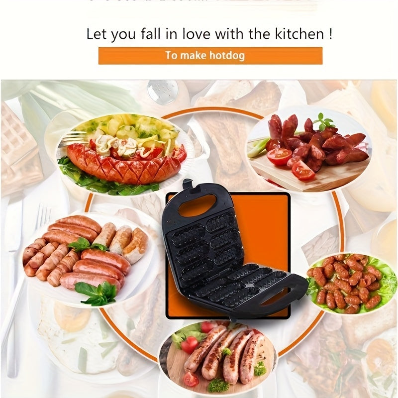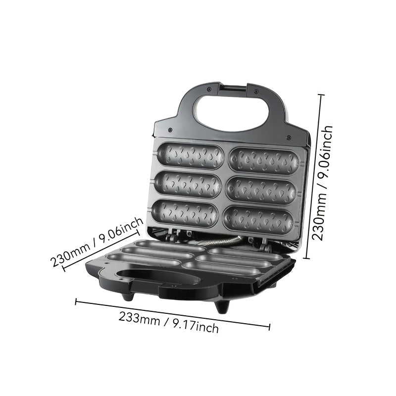 1000W tez isitgich bilan elektr kolbasa tayyorlagich va hot dog pishirgich, tutqichsiz, yog'siz dizayn. Ikki ta isitish elementlari, ergonomik tutqich va qora rangda kompakt kvadrat dizayni bilan jihozlangan.