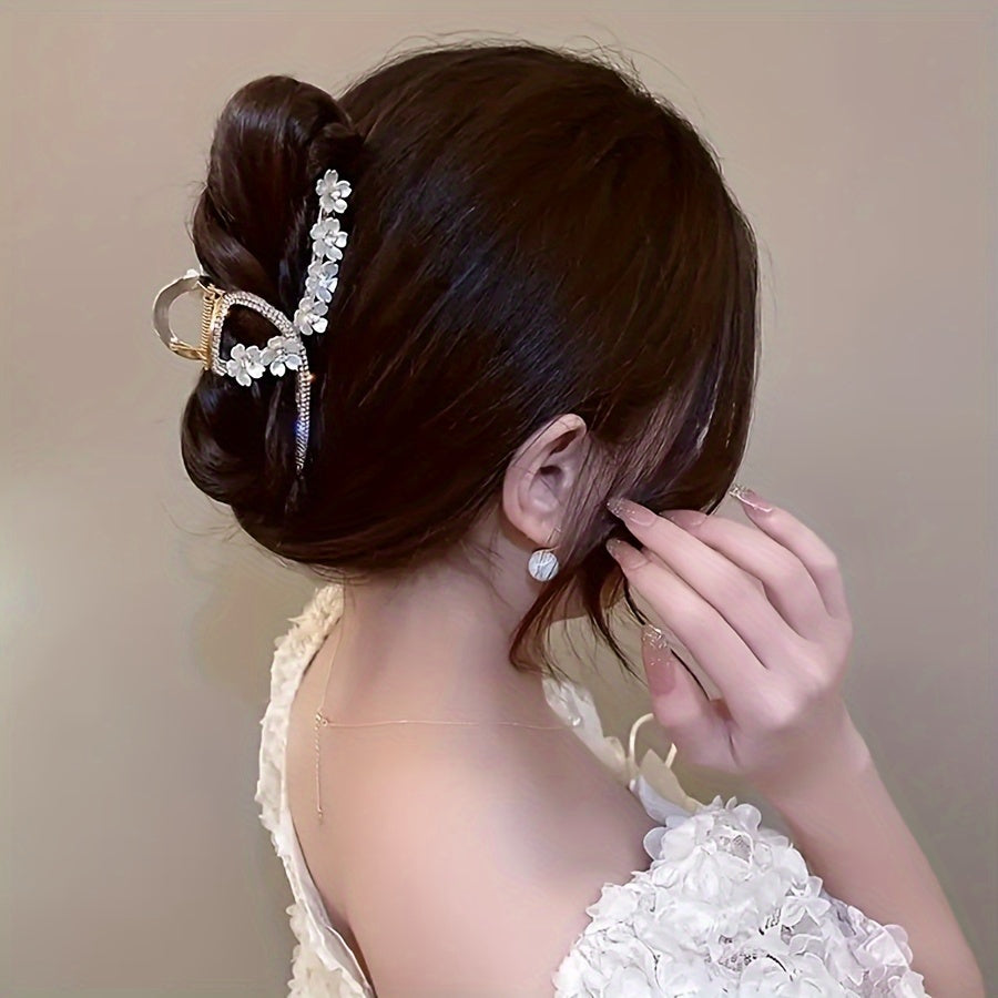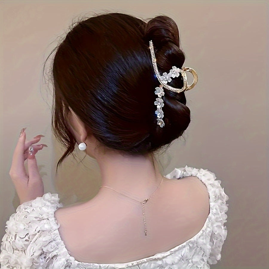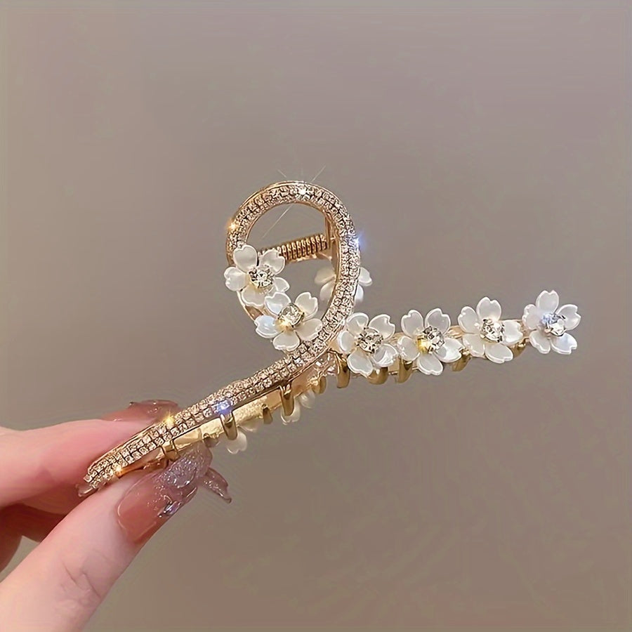 Zinс qotishmasidan tayyorlangan, ikki qatlamli elektroplitalash bilan mustahkamlangan, porloq rhinestone'lar bilan bezatilgan, nafis kameliya gullari soch qisqichi. Retro va zamonaviy soch aksessuari.