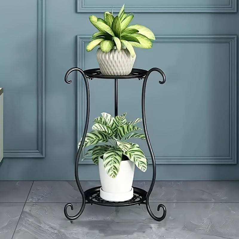 Zarif ikki qavatli metall stend, uy va bog' dekoratsiyasi uchun osilgan bezakli idish bilan. Mustahkam va yengil, ichki va tashqi foydalanish uchun mos.