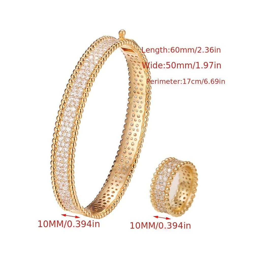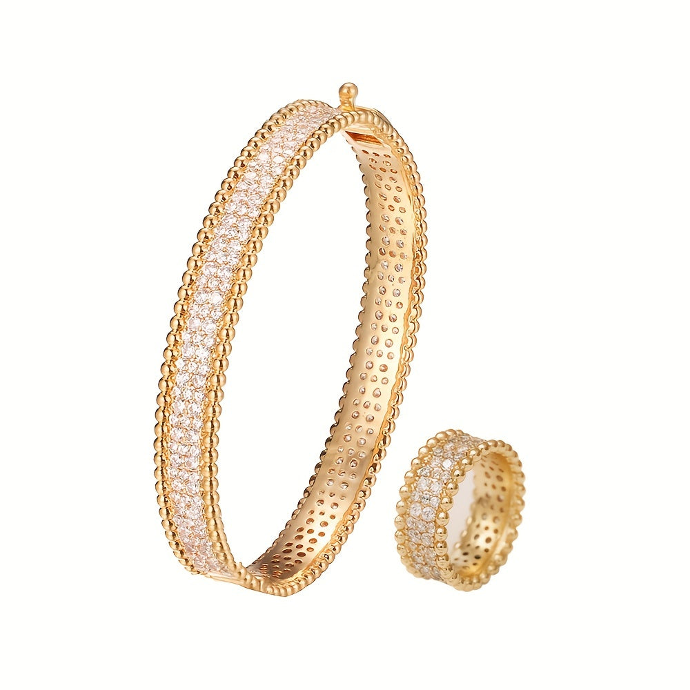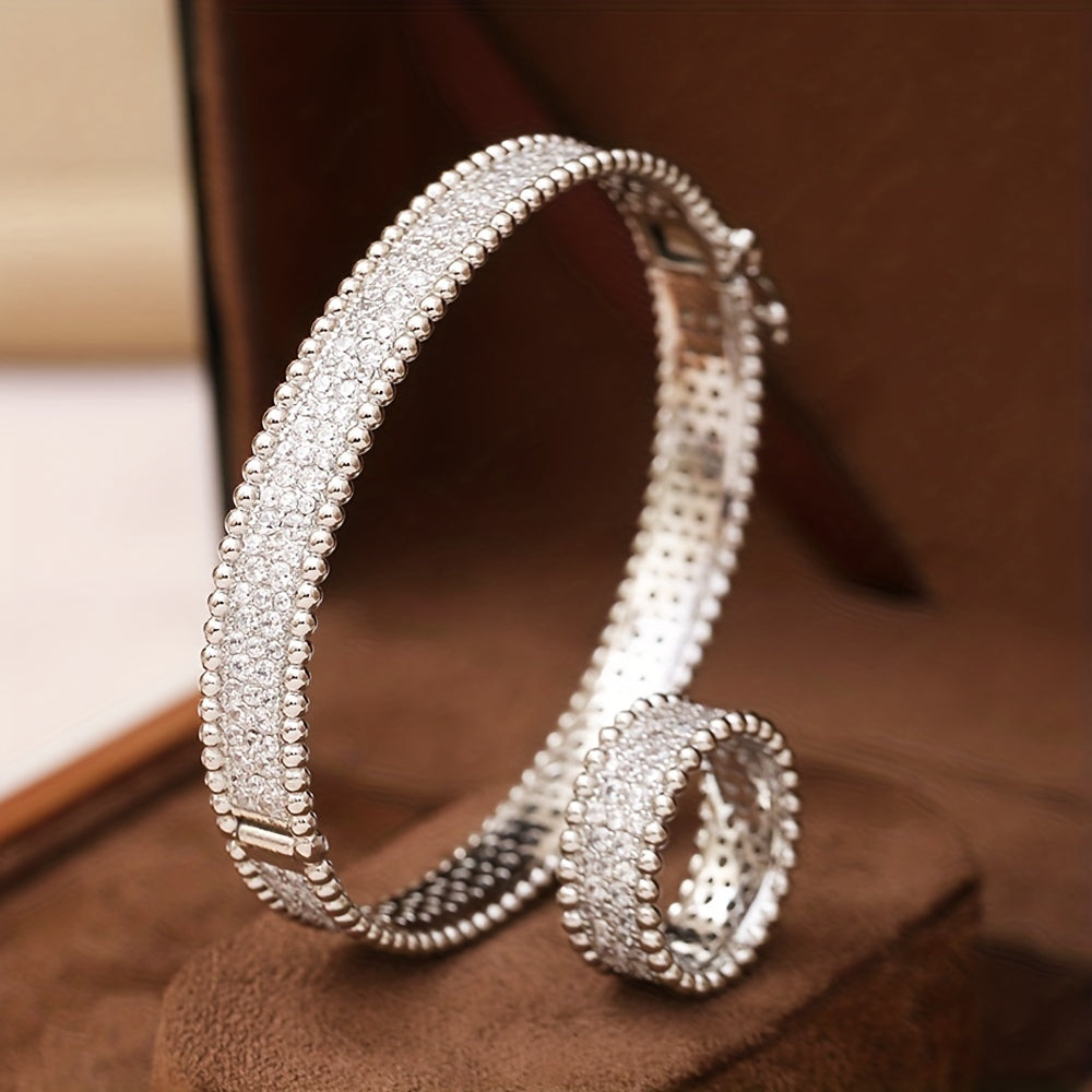 Zarif zargarlik to'plami, 1 ta uzuk va 1 ta bilaguzukdan iborat bo'lib, ichiga porlaydigan zirkoniya o'rnatilgan, kumush yoki oltin 14k qoplamali variantlarda mavjud. Kundalik kiyimlar bilan moslash uchun mukammal, hozir qo'ng'iroq qiling!