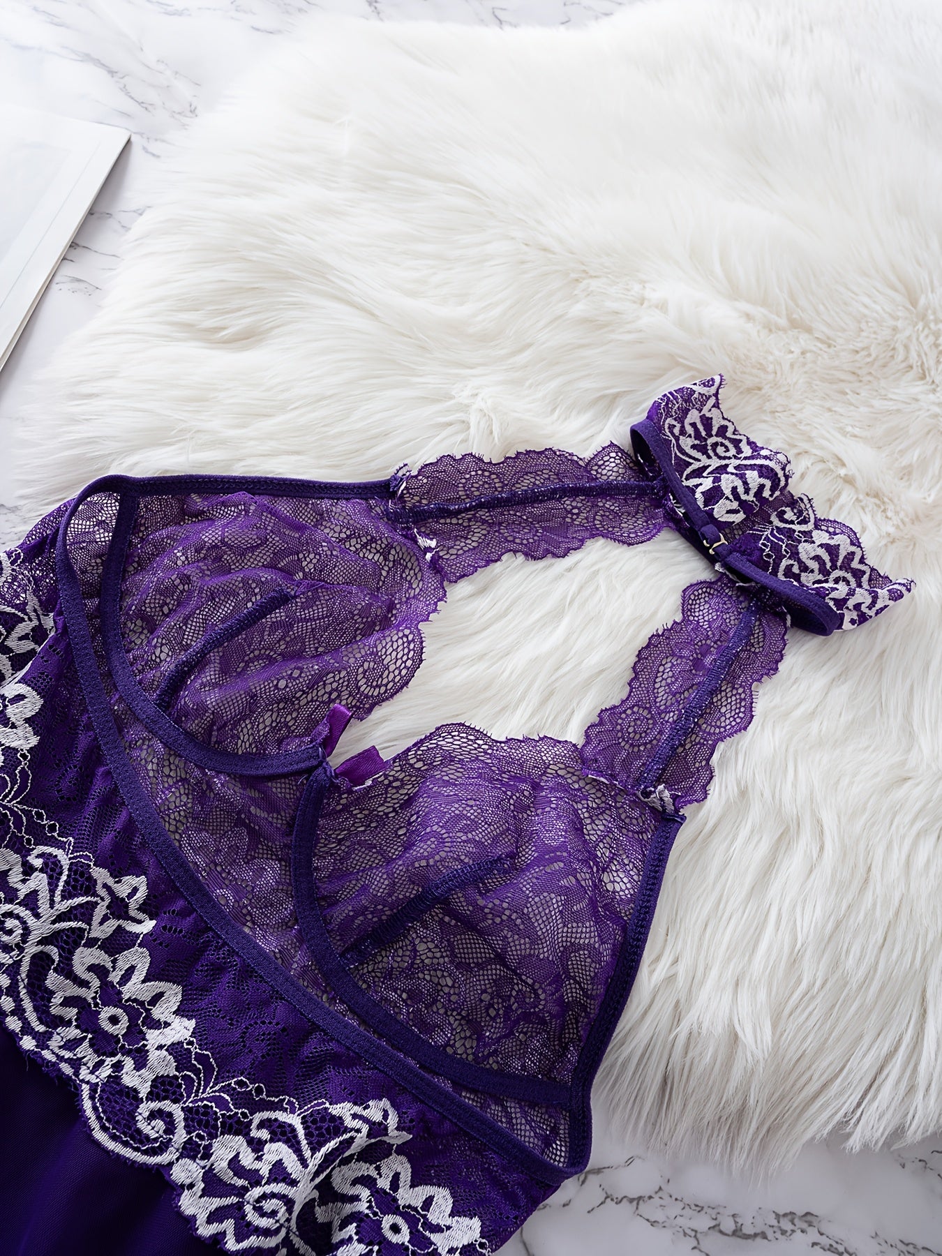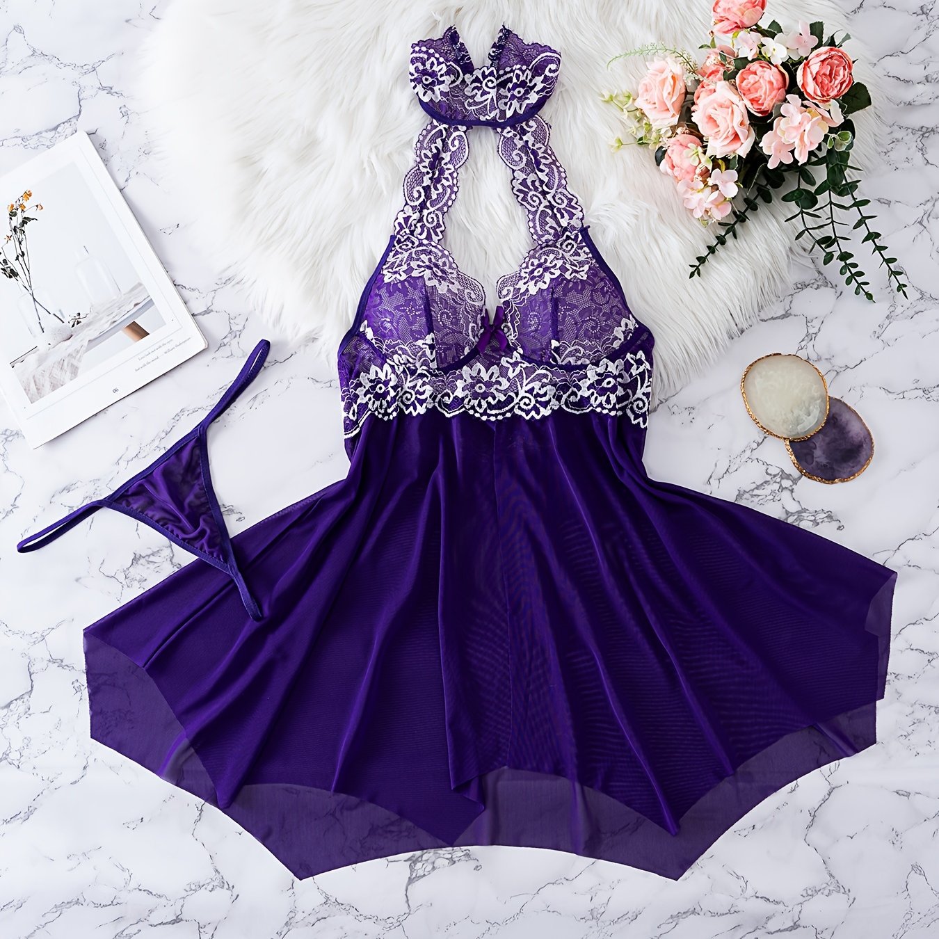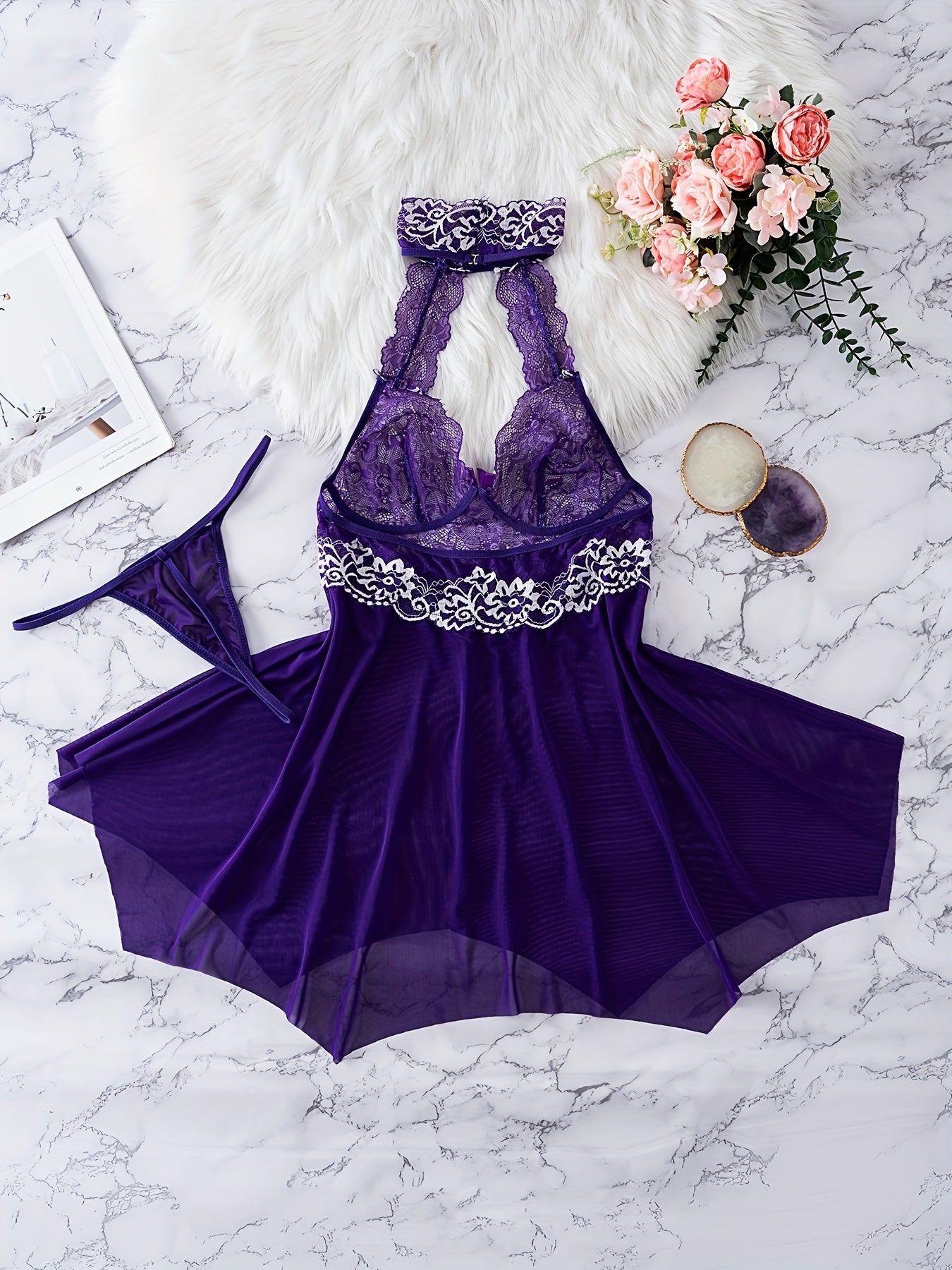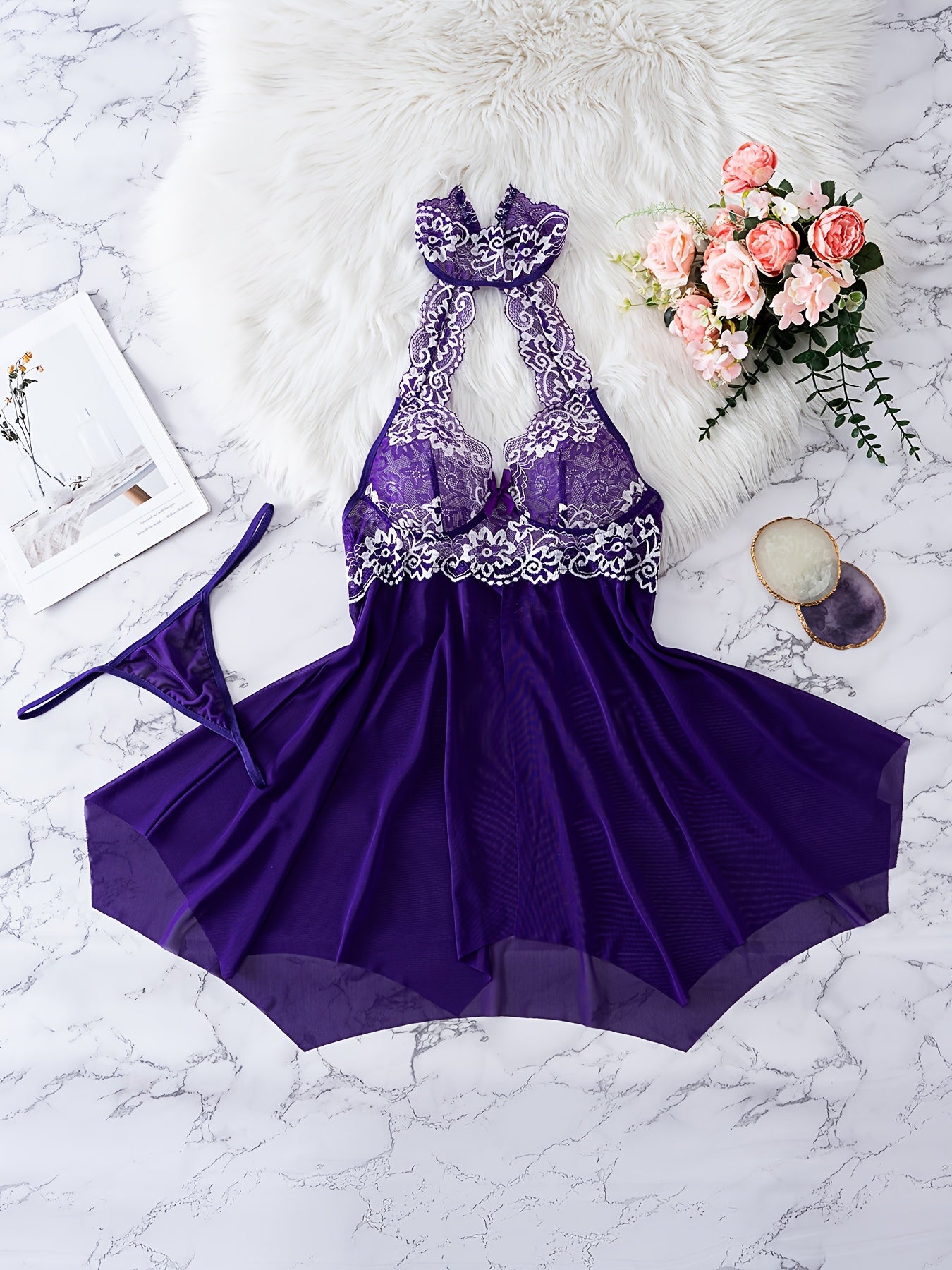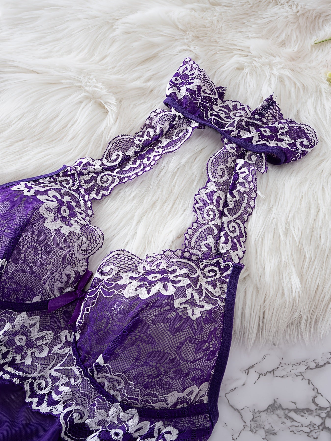 Ayollar uchun poliester va elastan aralashmasidan tayyorlangan nafis dantel halter top tunika va ichki kiyim to'plami. Qattiq rang, bog'ich detali, ko'krak pad yoki kamar yo'q bo'lgan to'qilgan mato bilan ajralib turadi.