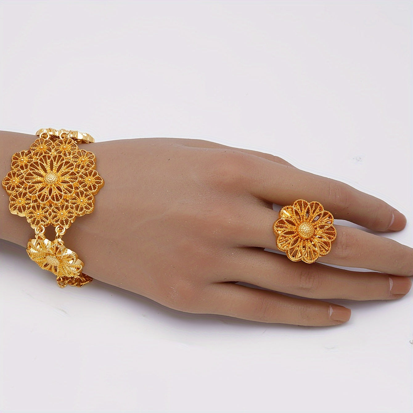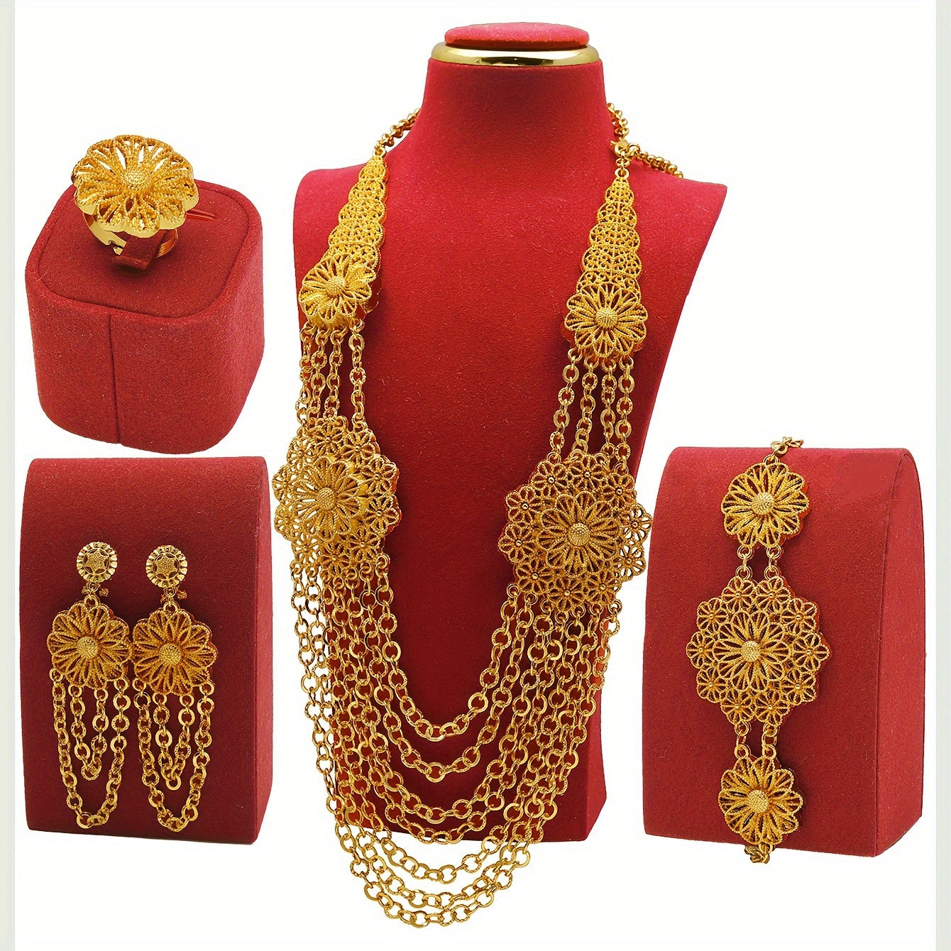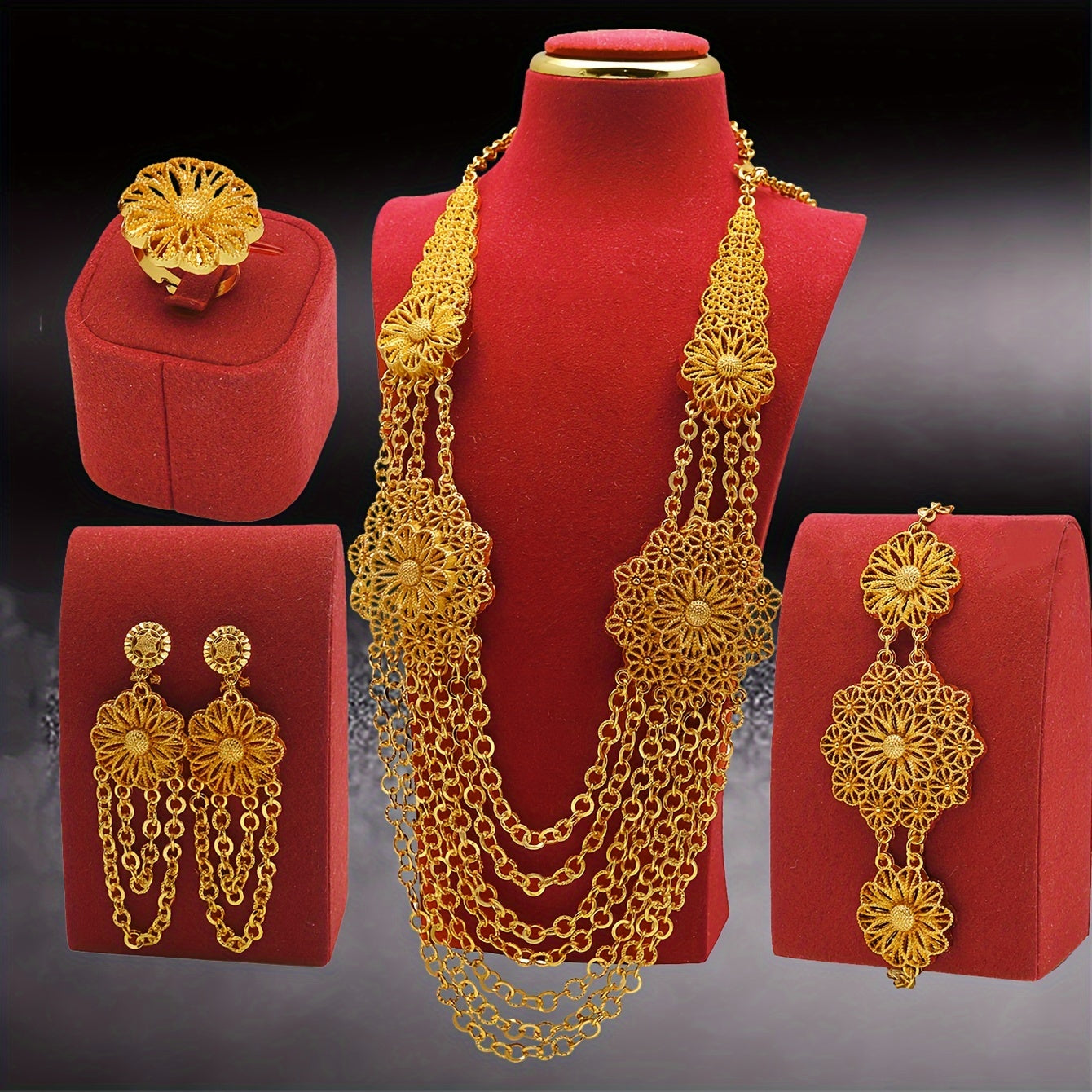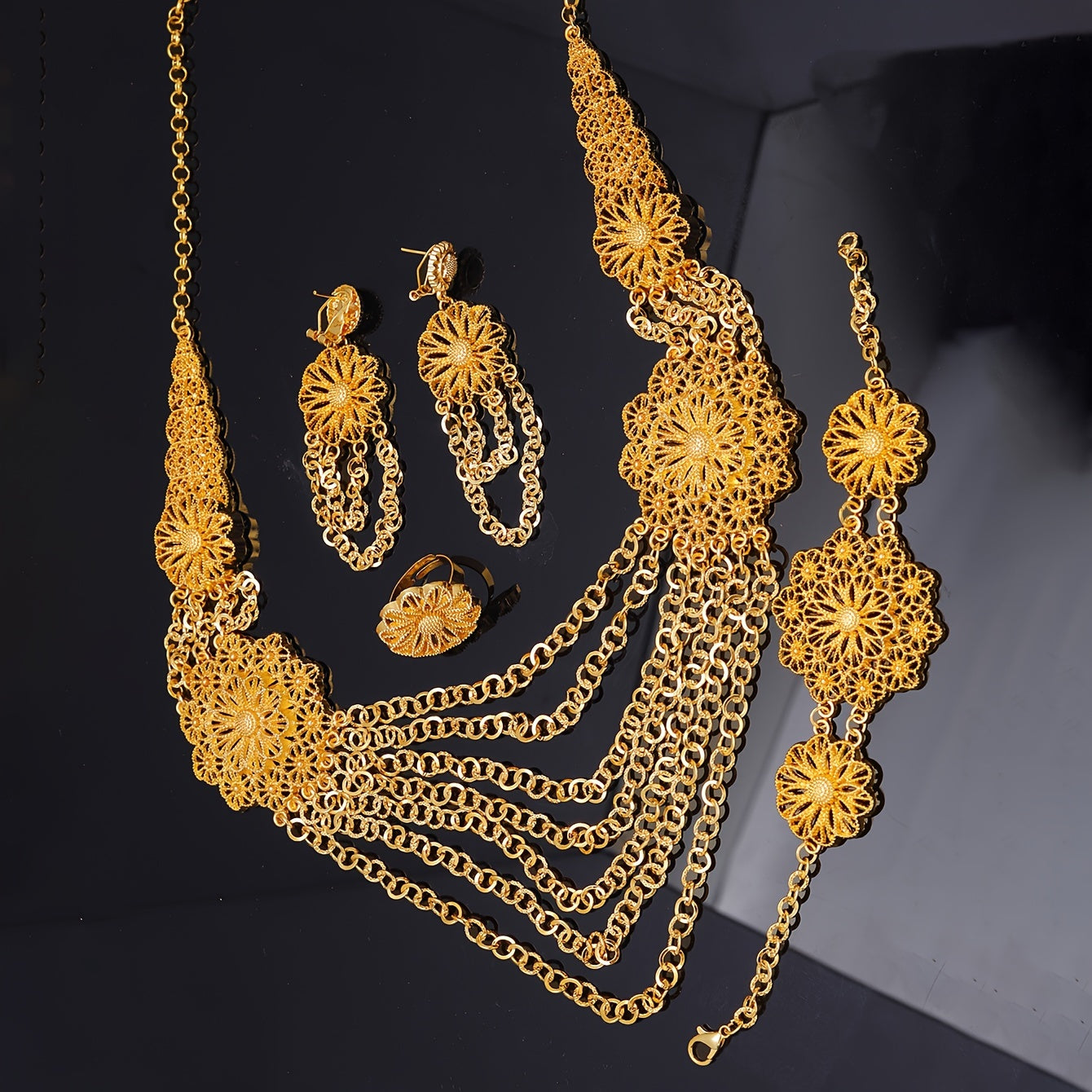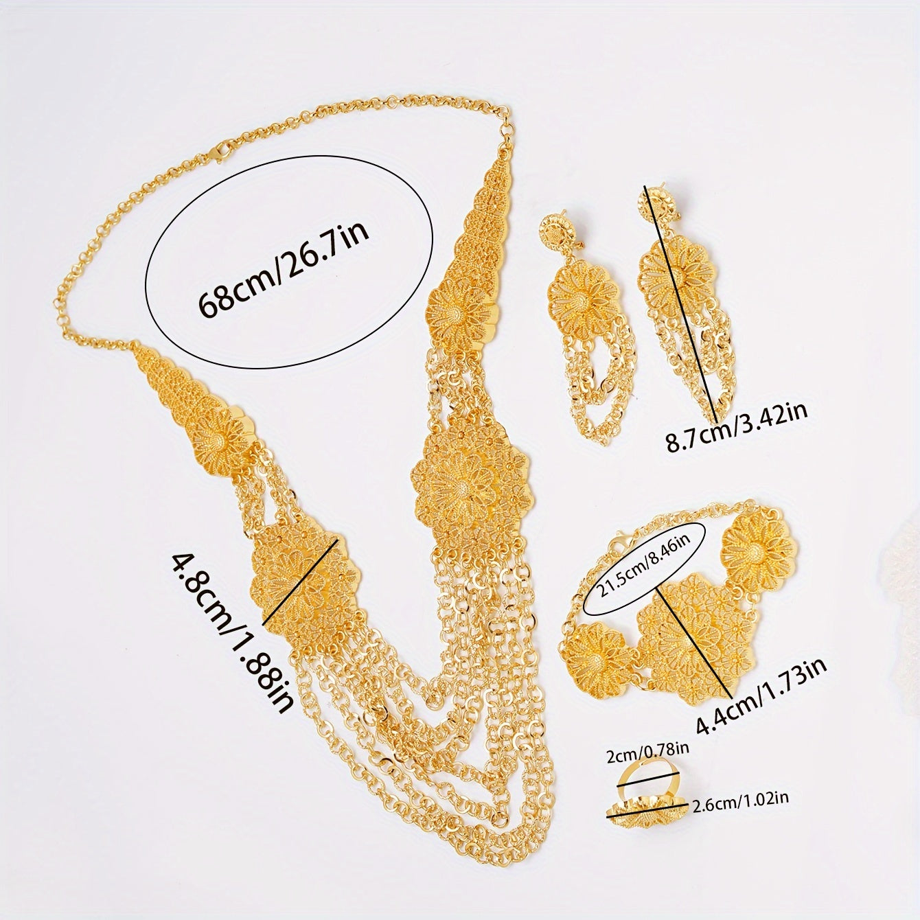 Zamonaviy O'rta Sharq zargarlik to'plami, vintage uslubidagi marjon, bilaguzuk, uzuk va sirg'alar bilan. Ushbu 4-qismli to'plam rux qotishmasidan tayyorlangan bo'lib, partiyalar, sovg'alar uchun ideal va yil davomida kiyish mumkin.