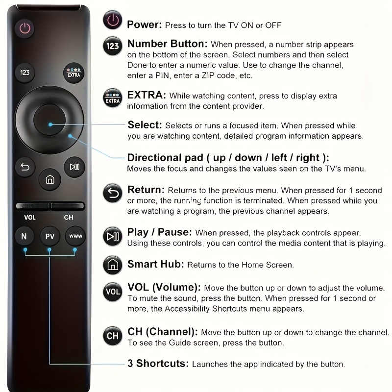 Samsung televizorlari uchun ergonomik masofadan boshqarish pulti, zamonaviy qora rangda, 4K, 8K, 3D Smart televizorlar bilan mos keladi, NFLX, Prime Video, WWW tugmalari mavjud, batareya bilan ishlaydi va IR texnologiyasiga ega.